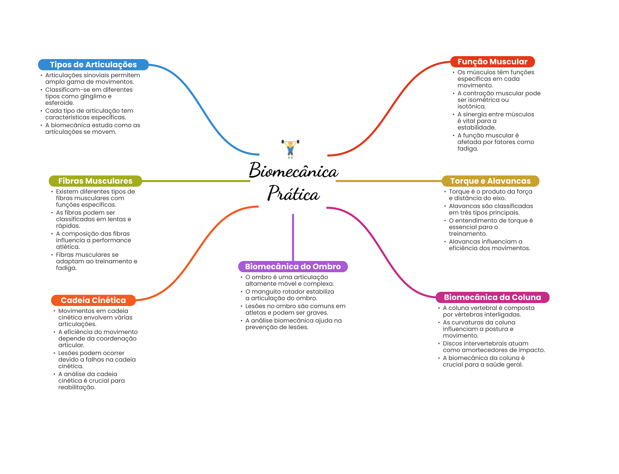 Tipos de Articulações Função Muscular Articulações sinoviais permitem Os músculos têm funções ampla gama de movimentos. específicas em cada movimento. Classificam-se em diferentes tipos como gínglimo e A contração muscular pode ser isométrica ou esferoide. isotônica. Cada tipo de articulação tem características específicas. A sinergia entre músculos é vital para a A biomecânica estuda como as estabilidade. articulações se movem. A função muscular é afetada por fatores como fadiga. Biomecânica Fibras Musculares Torque e Alavancas Existem diferentes tipos de fibras musculares com Prática Torque é produto da força e distância do eixo. funções específicas. Alavancas são classificadas As fibras podem ser em três tipos principais. classificadas em lentas e entendimento de torque é rápidas. essencial para A composição das fibras treinamento. influencia a performance Alavancas influenciam a atlética. eficiência dos movimentos. Fibras musculares se adaptam ao treinamento e fadiga. Biomecânica do Ombro ombro é uma articulação altamente móvel e complexa. manguito rotador estabiliza Cadeia Cinética a articulação do ombro. Biomecânica da Coluna Lesões no ombro são comuns em Movimentos em cadeia A coluna vertebral é composta atletas e podem ser graves. cinética envolvem várias por vértebras interligadas. articulações. A análise biomecânica ajuda na As curvaturas da coluna prevenção de lesões. A eficiência do movimento influenciam a postura e movimento. depende da coordenação articular. Discos intervertebrais atuam Lesões podem ocorrer como amortecedores de impacto. devido a falhas na cadeia A biomecânica da coluna é cinética. crucial para a saúde geral. A análise da cadeia cinética é crucial para reabilitação.