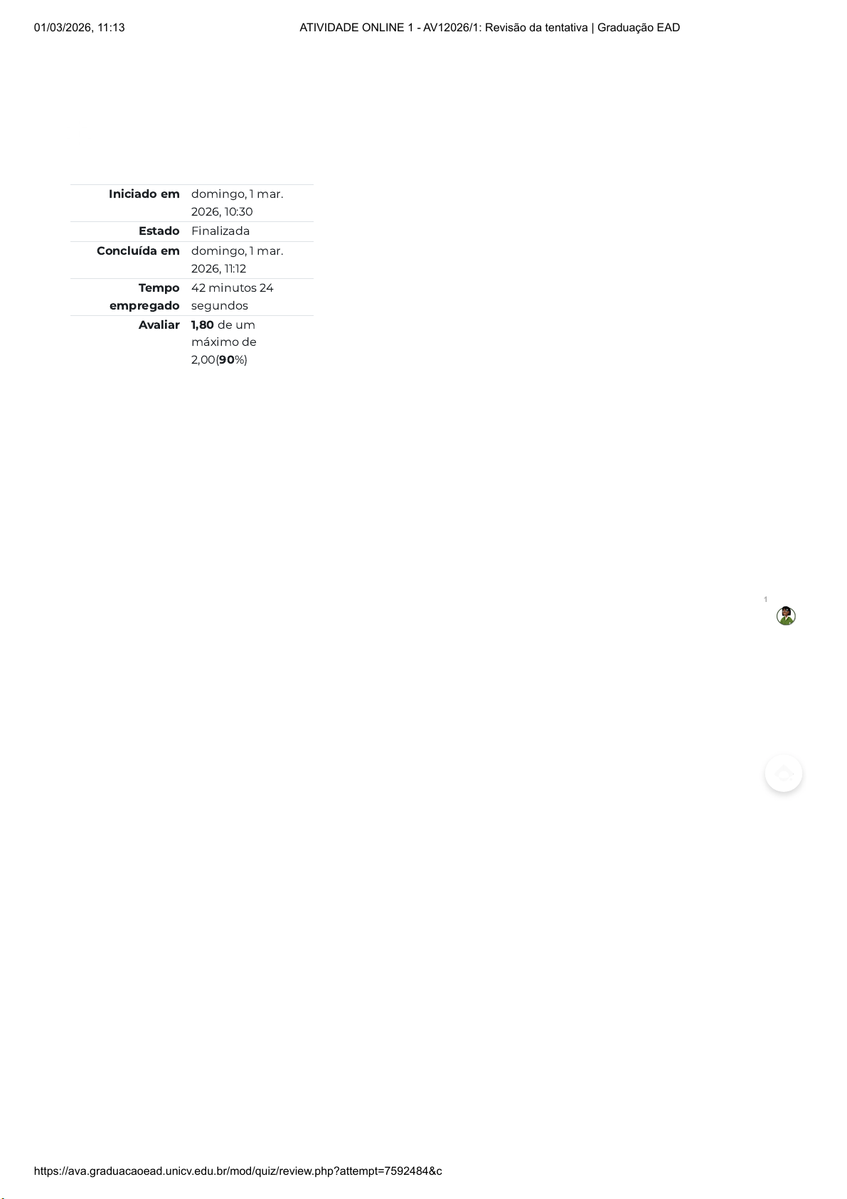 Iniciado em domingo, 1 mar. 2026, 10:30 Estado Finalizada Concluída em domingo, 1 mar. 2026, 11:12 Tempo empregado 42 minutos 24 segundos Avaliar 1,80 de um máximo de 2,00(90%) 1 01/03/2026, 11:13 ATIVIDADE ONLINE 1 - AV12026/1: Revisão da tentativa | Graduação EAD https://ava.graduacaoead.unicv.edu.br/mod/quiz/review.php?attempt=7592484&cmid=399159 1/14 Questão 1 Correto Atingiu 0,20 de 0,20 No estudo do comportamento organizacional, aborda-se a liderança, que é “a capacidade de influenciar um grupo para a realização de uma visão ou conjunto de metas”. ROBBINS, S. P.; JUDGE, T. Fundamentos do comportamento organizacional. São Paulo: Pearson Education do Brasil, 2014, p. 249. Diante dessa afirmação, podemos entender que: Escolha uma opção: a. Uma liderança pode incentivar os membros da organização a serem mais produtivos, pode criar visões de futuro, inspirar a todos para alcançá-las, mas também pode se mostrar prejudicial à organização ao se opor às suas metas. ✓ b. O papel da liderança é inspirar as pessoas a trabalharem para os objetivos da organização, por isso é considerada uma ferramenta de poder. c. Entende-se que a liderança é algo inato, que nasce com a pessoa e não pode ser adquirida, por isso nem todos são líderes. d. A liderança, para ser efetiva, exige que o líder ocupe cargo de chefia, caso contrário não se trata de liderança, uma vez que o líder não poderá apoiar as metas da organização. e. Toda liderança contribui para que a organização alcance seus objetivos, mas quando isso não ocorre entende-se que não se trata de uma liderança e sim de uma chefia. 1 01/03/2026, 11:13 ATIVIDADE ONLINE 1 - AV12026/1: Revisão da tentativa | Graduação EAD https://ava.graduacaoead.unicv.edu.br/mod/quiz/review.php?attempt=7592484&cmid=399159 2/14 Questão 2 Correto Atingiu 0,20 de 0,20 O estudo do Comportamento Organizacional é abrangente e também trata a respeito da Motivação, definida como “um estado interior que induz uma pessoa a assumir determinados tipos de comportamento” (SPECTOR, 2012, p. 284), e que motivar é: “ser capaz de influenciar pessoas de tal maneira que elas decidam esforçar-se mais para atingir um alvo estabelecido por você” (HAGGAI, 2004, p. 129). SPECTOR, P. Psicologia nas organizações. São Paulo: Saraiva, 2012. HAGGAI, J. E. Negócios & relacionamentos: os 7 segredos do poder da amizade nos negócios. 1. ed. Campinas: Instituto Haggai, 2004. A esse respeito, é correto afirmar que: Escolha uma opção: a. A motivação é algo interno, surge das necessidades intrínsecas de cada pessoa, e outros não podem alterar esse estado, mas apenas estimular, influenciar de tal maneira que se decida esforçar-se mais para atingir um determinado alvo. ✓ b. A motivação não pode ser relacionada aos desejos das pessoas, pois envolve apenas a satisfação de suas necessidades básicas, são as necessidades que motivam a pessoa a realizar algo e não o seu desejo. c. A motivação pode ser equivalente ao esforço, pois se manifesta apenas quando uma pessoa se esforça para atingir o seu objetivo. d. A motivação é essencialmente extrínseca e está ligada principalmente às recompensas materiais, 1 01/03/2026, 11:13 ATIVIDADE ONLINE 1 - AV12026/1: Revisão da tentativa | Graduação EAD https://ava.graduacaoead.unicv.edu.br/mod/quiz/review.php?attempt=7592484&cmid=399159 3/14 tangíveis, tais como benefícios, aumento de salário, que exercem uma força motivadora natural em cada pessoa. e. A motivação depende essencialmente dos outros que estão em volta, pois é o ambiente o fator principal capaz de motivar alguém de tal maneira que se decida esforçar-se mais para atingir um determinado alvo. 1 01/03/2026, 11:13 ATIVIDADE ONLINE 1 - AV12026/1: Revisão da tentativa | Graduação EAD https://ava.graduacaoead.unicv.edu.br/mod/quiz/review.php?attempt=7592484&cmid=399159 4/14 Questão 3 Correto Atingiu 0,20 de 0,20 Abordando o comportamento organizacional, sabemos que sofre influência de diversos fatores internos, como aprendizagem, motivação, percepção e valores, e fatores externos do ambiente organizacional, tais como regulamentos, cultura, políticas, métodos e processos, grau de confiança e recompensas. No tocante a valores, é correto afirmar que: Escolha uma opção: a. Os valores que uma pessoa carrega consigo podem influenciar em suas atitudes, em sua motivação e até na geração de conflitos, caso não estejam alinhados com os objetivos organizacionais. ✓ b. Os valores representam as principais causas de conflitos entre pessoas e organizações. c. Em casos de conflito, a abordagem do comportamento organizacional deve se debruçar para encontrar estratégias que busquem alterar a percepção e, consequentemente, os valores de seus colaboradores. d. Os valores equivalem à percepção que as pessoas fazem de uma situação e por isso podem ser moldados de acordo com o ambiente organizacional. e. Cabe à abordagem do comportamento organizacional dirigir a geração de novos valores, os quais as pessoas devem tomar como saudáveis, criando um ambiente estável e sem conflitos. 1 01/03/2026, 11:13 ATIVIDADE ONLINE 1 - AV12026/1: Revisão da tentativa | Graduação EAD https://ava.graduacaoead.unicv.edu.br/mod/quiz/review.php?attempt=7592484&cmid=399159 5/14 Questão 4 Incorreto Atingiu 0,00 de 0,20 A liderança está relacionada na capacidade do líder ser prestativo para assim, refletir uma boa aparência para seus funcionários. Um bom líder deve ser observador para saber como está o comportamento da sua equipe para poder direcioná-los de forma que venham render dentro do ambiente de trabalho (CHIAVENATO, 2009 in GRANEZ, Carlos Roger Lemes, BORTOLUZZI, Citania Aparecida Pilatti, BISSANI, Niloar. O perfil da liderança como fator de sucesso nas organizações. Tecnológica. v 5, n 2, 2016). Sobre a função do líder, analise as sentenças abaixo e indique F para falso e V para