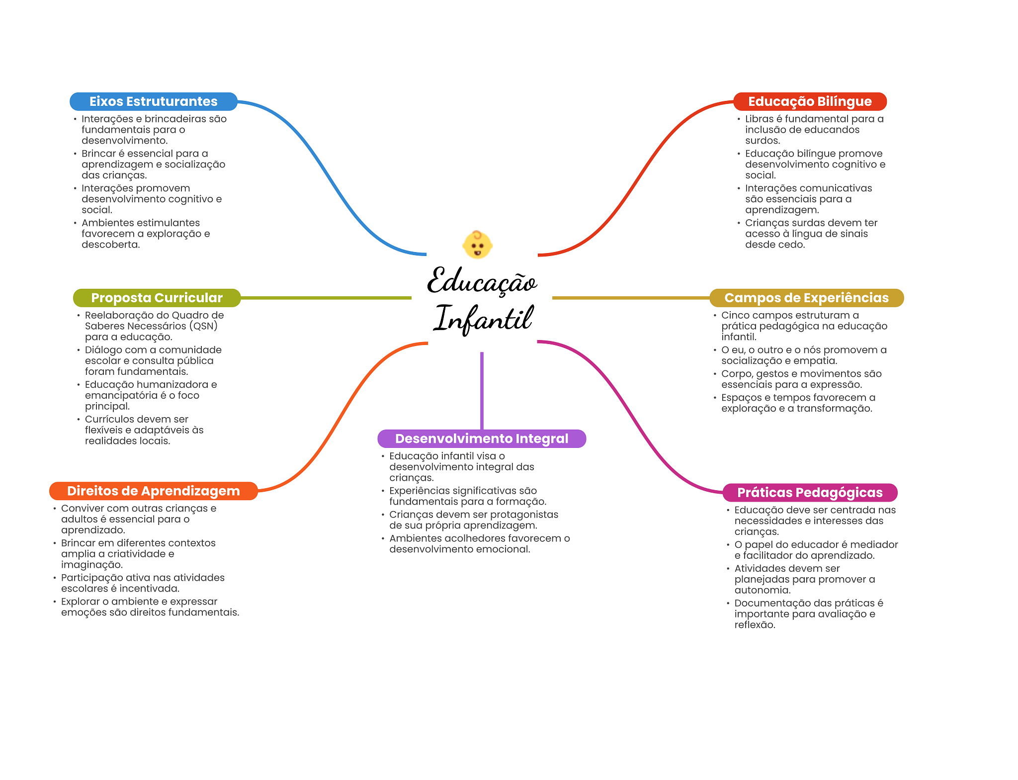 Eixos Estruturantes Educação Bilíngue Interações e brincadeiras são Libras é fundamental para a fundamentais para inclusão de educandos desenvolvimento. surdos. Brincar é essencial para a Educação bilíngue promove aprendizagem e socialização desenvolvimento cognitivo e das crianças. social. Interações promovem Interações comunicativas desenvolvimento cognitivo e são essenciais para a social. aprendizagem. Ambientes estimulantes Crianças surdas devem ter favorecem a exploração e acesso à língua de sinais descoberta. desde cedo. Educação Proposta Curricular Campos de Experiências Reelaboração do Quadro de Saberes Necessários (QSN) Infantil Cinco campos estruturam a prática pedagógica na educação para a educação. infantil. Diálogo com a comunidade eu, outro e O nós promovem a escolar e consulta pública socialização e empatia. foram fundamentais. Corpo, gestos e movimentos são Educação humanizadora e essenciais para a expressão. emancipatória é O foco Espaços e tempos favorecem a principal. exploração e a transformação. Currículos devem ser flexíveis e adaptáveis às realidades locais. Desenvolvimento Integral Educação infantil visa desenvolvimento integral das crianças. Direitos de Aprendizagem Experiências significativas são Práticas Pedagógicas fundamentais para a formação. Conviver com outras crianças e adultos é essencial para Crianças devem ser protagonistas Educação deve ser centrada nas de sua própria aprendizagem. necessidades e interesses das aprendizado. crianças. Brincar em diferentes contextos Ambientes acolhedores favorecem desenvolvimento emocional. papel do educador é mediador amplia a criatividade e e facilitador do aprendizado. imaginação. Atividades devem ser Participação ativa nas atividades planejadas para promover a escolares é incentivada. autonomia. Explorar ambiente e expressar Documentação das práticas é emoções são direitos fundamentais. importante para avaliação e reflexão.