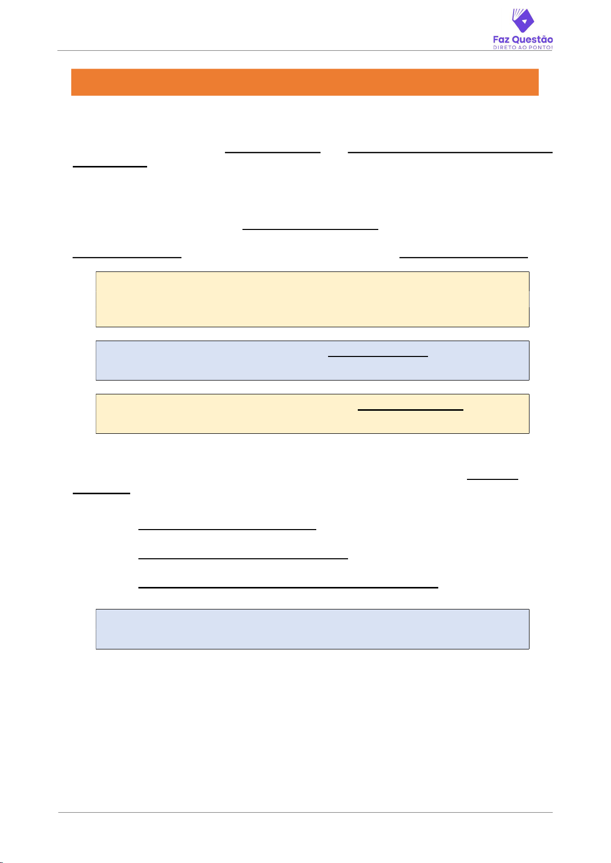 #FAZQUESTÃO 1 INTRODUÇÃO AO DIREITO ADMINISTRATIVO CONCEITO DE ESTADO “Estado” é a junção INDISSOCIÁVEL de POVO, TERRITÓRIO e GOVERNO SOBERANO. Ou seja, seu conceito se refere a organização político-administrativa de determinado território. Sendo o conjunto de ordenamentos jurídicos que regem determinada população. O Estado também detém AUTONOMIA POLÍTICA, estendido à todas as unidades federativas (União, Estados, Distrito Federal e Municípios) sendo todos estes de DIREITO PÚBLICO. Razões pelas quais são chamadas de PESSOAS POLÍTICAS EXPLICANDO – Autonomia Política se refere à capacidade do estado de tomar suas próprias decisões, exprimindo sua vontade, por meio do processo político vigente neste estado PERCEBA – O estado é um ente PERSONALIZADO, ou seja, possuí personalidade jurídica própria EM RESUMO - Estado é uma instituição de DIREITO PÚBLICO organizada Política, Social e Juridicamente ESTADO DE DIREITO O conceito de “Estado de Direito” preceitua que o estado que INSTITUI a lei, TAMBÉM está atrelado a esta lei! Sendo assim, o estado de direito é composto de três pilares: TRIPARTIÇÃO DOS PODERES UNIVERSALIDADE DA JURISDIÇÃO GENERALIZAÇÃO DO PRINCÍPIO DA LEGALIDADE PERCEBA - Em um estado de direito prevalecem as normas jurídicas abstratas e gerais, e não a vontade do governante. Tadeu Vasconcelos Sublinhado Tadeu Vasconcelos Sublinhado Tadeu Vasconcelos Sublinhado Tadeu Vasconcelos Sublinhado #FAZQUESTÃO 2 PODERES DO ESTADO Os poderes do estado são divididos em: EXECUTIVO LEGISLATIVO JUDICIÁRIO IMPORTANTE – Estes poderes devem conviver harmoniosamente, com o conceito de FREIOS e CONTRAPESOS. EXPLICANDO – FREIOS e CONTRAPESOS - O sistema em que os Poderes do Estado mutuamente se controlam, não havendo hierarquia entre os poderes ATENÇÃO - Divisão dos poderes trata-se de CLÁUSULA PÉTREA FUNÇÕES TÍPICAS E ATÍPICAS Cada um dos Poderes do Estado possui suas respectivas funções, ou seja, apesar dos Poderes do Estado serem bem definidos e divididos, essa divisão é flexível. Um macete para entendimento é: FUNÇÃO TÍPICA – O que cada poder “nasceu para fazer” FUNÇÃO ATÍPICA – As funções dos outros poderes PODER EXECUTIVO FUNÇÃO TÍPICA – Administrar, Executar, Decidir Administrativamente. FUNÇÕES ATÍPICAS – JULGAR (Um processo administrativo, por exemplo), LEGISLAR (Medidas Provisórias, por exemplo). IMPORTANTE – Apesar de suas funções atípicas, o poder executivo NÃO tem a prerrogativa de criar “coisa julgada” ou “criar lei” Tadeu Vasconcelos Sublinhado Tadeu Vasconcelos Sublinhado #FAZQUESTÃO 3 PODER LEGISLATIVO FUNÇÃO TÍPICA – Legislar (Discutir e editais leis) FUNÇÃO ATÍPICA – ADMINISTRAR (Mesa diretora de uma assembleia, por exemplo), JULGAR (Crimes de Responsabilidade de Autoridades, por exemplo). ATENÇÃO – O Poder Legislativo também não pode criar “coisa julgada” PODER JUDICIÁRIO FUNÇÃO TÍPICA – JULGAR (Criando “coisa julgada”) FUNÇÃO ATÍPICA – ADMINISTRAR (Processos internos de um TJ, por exemplo), LEGISLAR (Regimentos e Regulamentos Internos) PERCEBA – Siga o “macete”, a típica é o que o poder nasceu para fazer; as atípicas são as funções dos outros poderes FUNÇÃO POLÍTICA Proposta por parte da doutrina, abarcaria atos jurídicos do estado que não se encaixam nas outras funções do estado, em situações que o estado versa sobre decisões superiores da vida estatal, tais como: Sanção e Veto de Lei Decretação de Calamidade Pública Declaração de Guerra Tadeu Vasconcelos Sublinhado Tadeu Vasconcelos Sublinhado Tadeu Vasconcelos Sublinhado Tadeu Vasconcelos Sublinhado #FAZQUESTÃO 4 SENTIDOS DA ADMINISTRAÇÃO PÚBLICA ADMINISTRAÇÃO EM SENTIDO AMPLO Abrange os órgãos de governo que exercem função política, e os órgãos e pessoas que exercem função meramente administrativa. EM RESUMO - Sentido AMPLO engloba PESSOAS e ÓRGÃOS POLÍTICOS e ADMINISTRATIVOS. ADMINISTRAÇÃO EM SENTIDO ESTRITO Inclui APENAS as pessoas e órgãos que fazem uma atividade MERAMENTE ADMINISTRATIVA. ATENÇÃO - A principal diferença é que as pessoas e órgãos políticos não estão presentes nesta definição de Administração Pública. SENTIDO FORMAL, SUBJETIVO OU ORGÂNICO Conceito muito importante para concursos, basicamente trata das PESSOAS e ÓRGÃOS da administração pública. LEMBRE-SE – O sentido FORMAL, SUBJETIVO ou ORGÂNICO se refere a QUEM faz! SENTIDO MATERIAL, OBJETIVO OU FUNCIONAL Conceito igualmente importante. Aqui o foco não é QUEM faz, mas sim O QUE FAZ! PERCEBA - Este sentido se refere justamente à ATIVIDADE da administração pública Tadeu Vasconcelos Sublinhado Tadeu Vasconcelos Sublinhado #FAZQUESTÃO 5 ADMINISTRAÇÃO PÚBLICA ATIVIDADES Sem delongas, a doutrina majoritária preceitua que as quatro tarefas principais são: PODER DE POLÍCIA PRESTAÇÃO DE SERVIÇOS PÚBLICOS REGULAÇÃO E FOMENTO CONTROLE FIQUE TRANQUILO – Ao longo de nosso curso detalharemos cada uma destas tarefas da Administração Pública PRINCÍPIOS As atividades da Administração Federal obedecerão aos seguintes princípios fundamentais: PLANEJAMENTO. COORDENAÇÃO. DESCENTRALIZAÇÃO. DELEGAÇÃO DE COMPETÊNCIA. CONTROLE. NÃO CONFUNDA – Estes são os princípios das Atividades da Administração e NÃO os princípios constitucionais da Administração Pública Tadeu Vasconcelos Sublinhado Tadeu Vasconcelos Sublinhado #FAZQUESTÃO 6 DIREITO PÚBLICO e DIREITO PRIVADO Em AMBOS OS RAMOS (Direito Público e Privado) existe a presença “de um em outro” em inúmeras situações. Caso relações predominantemente particulares tenham repercussões na sociedade, essas situações também serão regidas pelo Direito Público. Também existem situações em ramos do direito público que podem ser tratadas pelo direito privado. O que NÃO existe é alguma relação com o ESTADO que seja EXCLUSIVAMENTE regida pelo 