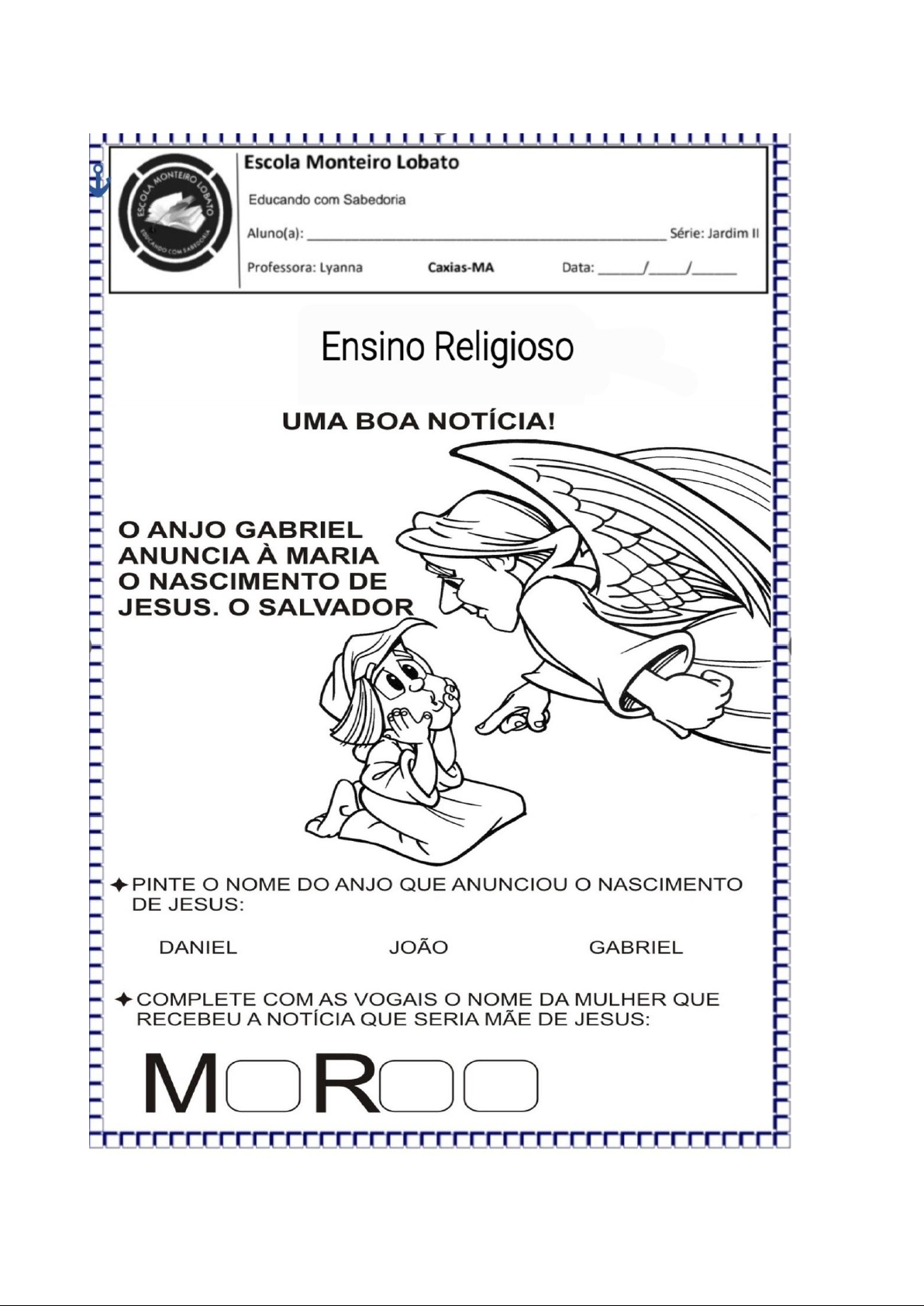 Atividade Específica 1: O que Maria respondeu ao Anjo Gabriel quando ele contou que ela ficaria grávida do menino Jesus? A) Não aceito B) Que seja ...