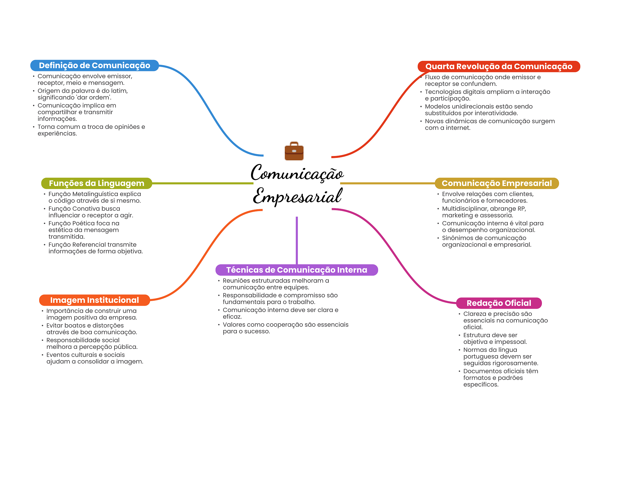 Definição de Comunicação Quarta Revolução da Comunicação Comunicação envolve emissor, Fluxo de comunicação onde emissor e receptor, meio e mensagem. receptor se confundem. Origem da palavra é do latim, Tecnologias digitais ampliam a interação significando 'dar ordem'. e participação. Comunicação implica em Modelos unidirecionais estão sendo compartilhar e transmitir substituídos por interatividade. informações. Novas dinâmicas de comunicação surgem Torna comum a troca de opiniões e com a internet. experiências. Comunicação Funções da Linguagem Comunicação Empresarial Função Metalinguística explica Empresarial Envolve relações com clientes, código através de si mesmo. funcionários e fornecedores. Função Conativa busca Multidisciplinar, abrange RP, influenciar O receptor a agir. marketing e assessoria. Função Poética foca na Comunicação interna é vital para estética da mensagem desempenho organizacional. transmitida. Sinônimos de comunicação Função Referencial transmite organizacional e empresarial. informações de forma objetiva. Técnicas de Comunicação Interna Reuniões estruturadas melhoram a comunicação entre equipes. Responsabilidade e compromisso são Imagem Institucional fundamentais para trabalho. Redação Oficial Importância de construir uma Comunicação interna deve ser clara e imagem positiva da empresa. eficaz. Clareza e precisão são essenciais na comunicação Evitar boatos e distorções Valores como cooperação são essenciais oficial. através de boa comunicação. para sucesso. Estrutura deve ser Responsabilidade social objetiva e impessoal. melhora a percepção pública. Normas da língua Eventos culturais e sociais portuguesa devem ser ajudam a consolidar a imagem. seguidas rigorosamente. Documentos oficiais têm formatos e padrões específicos.