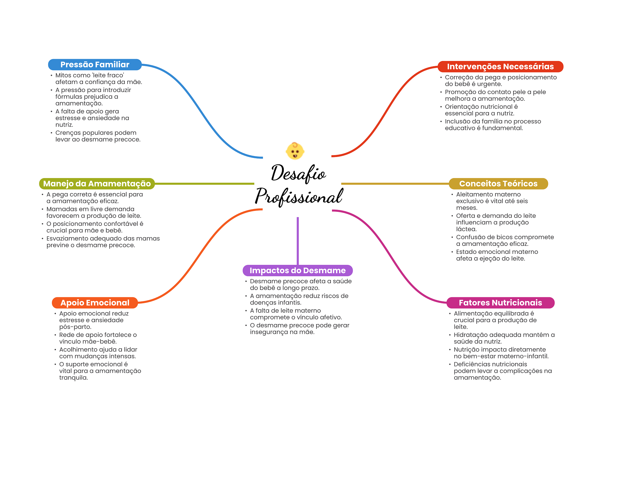 Pressão Familiar Intervenções Necessárias Mitos como 'leite fraco' Correção da pega e posicionamento afetam a confiança da mãe. do é urgente. A pressão para introduzir Promoção do contato pele a pele fórmulas prejudica a melhora a amamentação. amamentação. Orientação nutricional é A falta de apoio gera essencial para a nutriz. estresse e ansiedade na nutriz. Inclusão da família no processo educativo é fundamental. Crenças populares podem levar ao desmame precoce. Desafio Manejo da Amamentação Conceitos Teóricos A pega correta é essencial para a amamentação eficaz. Profissional Aleitamento materno exclusivo é vital até seis Mamadas em livre demanda meses. favorecem a produção de leite. Oferta e demanda do leite posicionamento confortável é influenciam a produção crucial para mãe e bebê. láctea. Esvaziamento adequado das mamas Confusão de bicos compromete previne desmame precoce. a amamentação eficaz. Estado emocional materno afeta a ejeção do leite. Impactos do Desmame Desmame precoce afeta a saúde do bebê a longo prazo. A amamentação reduz riscos de Apoio Emocional doenças infantis. Fatores Nutricionais A falta de leite materno Apoio emocional reduz Alimentação equilibrada é estresse e ansiedade compromete vínculo afetivo. crucial para a produção de pós-parto. desmame precoce pode gerar leite. Rede de apoio fortalece insegurança na mãe. Hidratação adequada mantém a vínculo mãe-bebê. saúde da nutriz. Acolhimento ajuda a lidar Nutrição impacta diretamente com mudanças intensas. no bem-estar materno-infantil. suporte emocional é Deficiências nutricionais vital para a amamentação podem levar a complicações na tranquila. amamentação.
