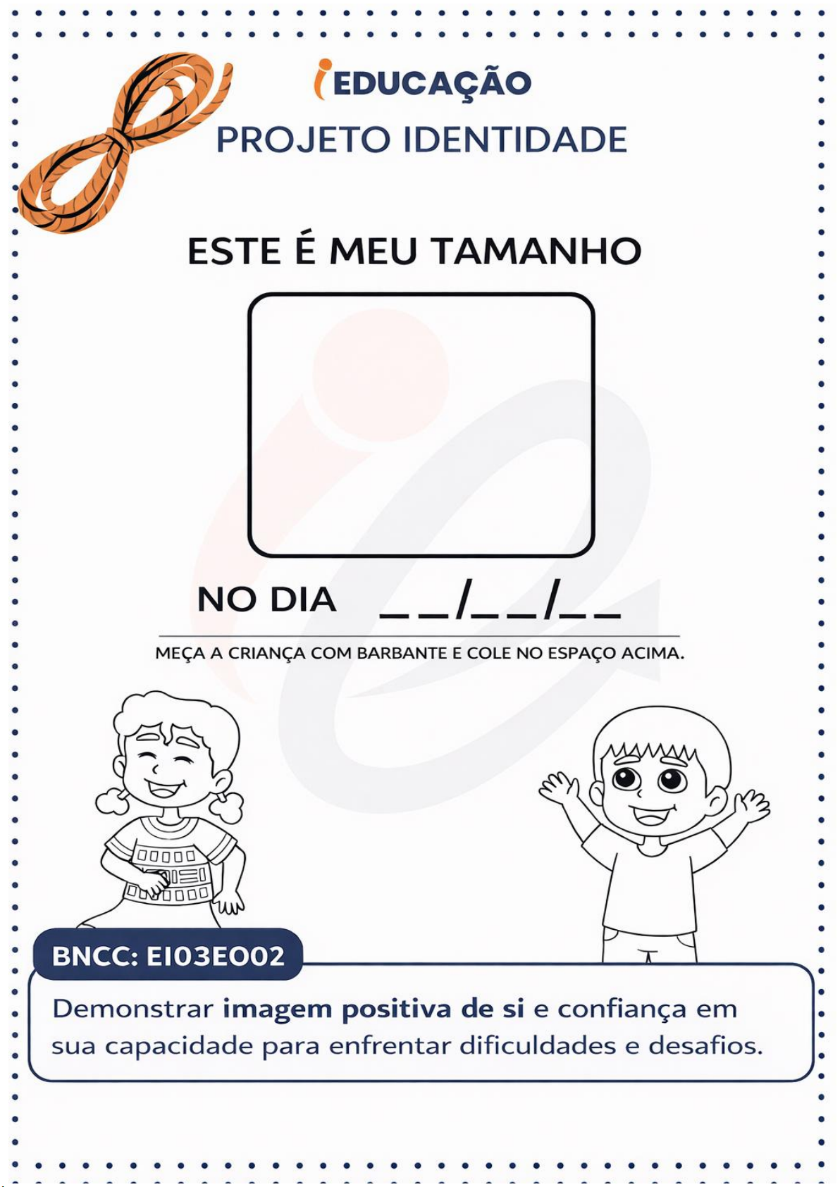 EDUCAÇÃO PROJETO IDENTIDADE ESTE É MEU TAMANHO NO DIA / MEÇA A CRIANÇA COM BARBANTE E COLE NO ESPAÇO ACIMA. 00000 w BNCC: EI03E002 T Demonstrar imagem positiva de si e confiança em sua capacidade para enfrentar dificuldades e desafios.