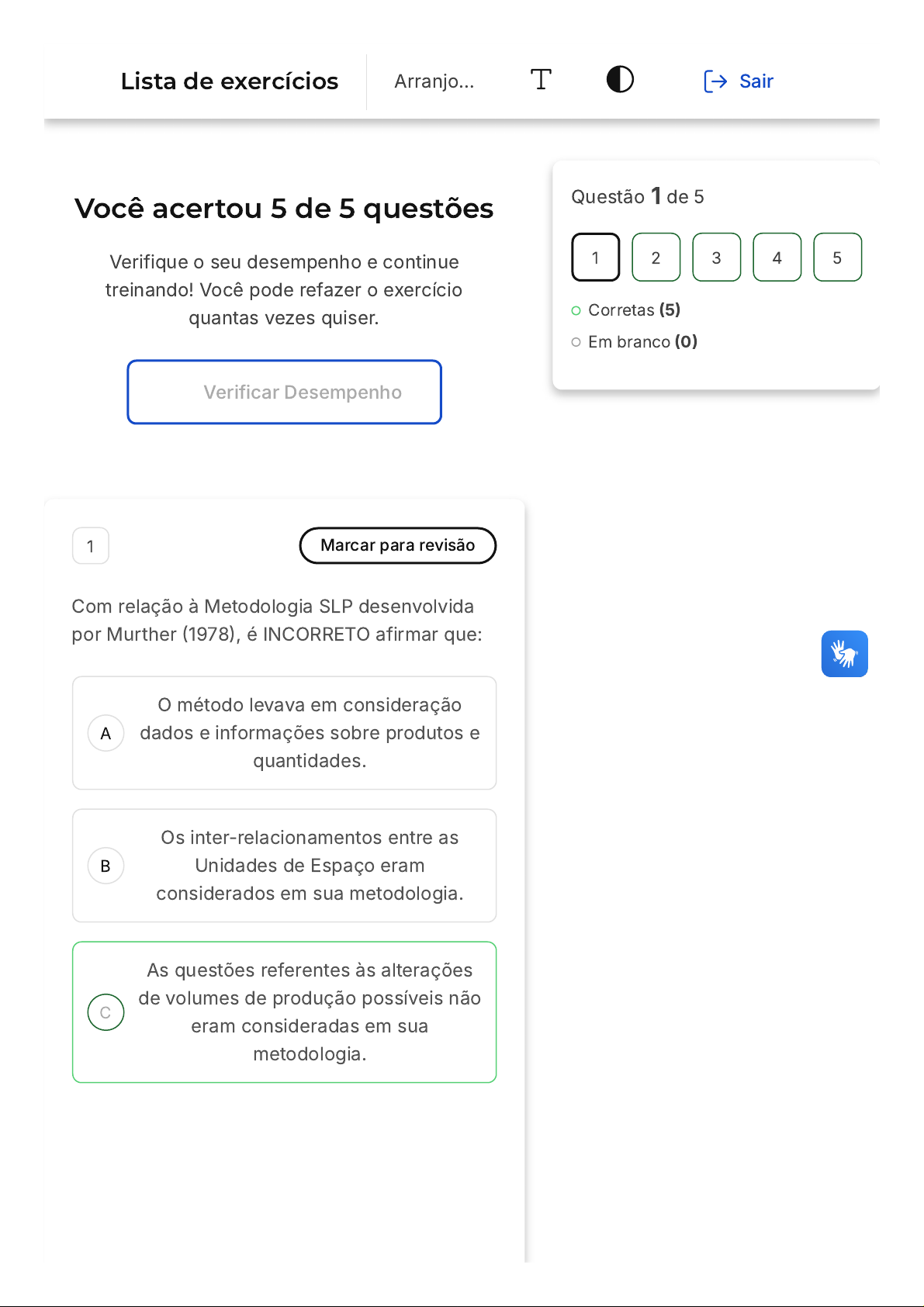 Você acertou 5 de 5 questões Verifique o seu desempenho e continue treinando! Você pode refazer o exercício quantas vezes quiser. Verificar Desempenho A B C 1 Marcar para revisão Com relação à Metodologia SLP desenvolvida por Murther (1978), é INCORRETO afirmar que: O método levava em consideração dados e informações sobre produtos e quantidades. Os inter-relacionamentos entre as Unidades de Espaço eram considerados em sua metodologia. As questões referentes às alterações de volumes de produção possíveis não eram consideradas em sua metodologia. Questão 1 de 5 Corretas (5) Em branco (0) 1 2 3 4 5 Lista de exercícios Arranjo… Sair D E A metodologia não deixava de levar em consideração as possíveis restrições existentes no que se refere às edificações a serem utilizadas no projeto. O desenvolvimento de alternativas de layouts faz parte da Metodologia SLP. Resposta correta Parabéns, você selecionou a alternativa correta. Confira o gabarito comentado! Gabarito Comentado A alternativa correta é a letra C. A Metodologia SLP, desenvolvida por Murther em 1978, é um método que leva em consideração diversos fatores, como dados e informações sobre produtos e quantidades, inter-relacionamentos entre as Unidades de Espaço, possíveis restrições existentes no que se refere às edificações a serem utilizadas no projeto e o desenvolvimento de alternativas de layouts. No entanto, é incorreto afirmar que as questões referentes às alterações de volumes de produção possíveis eram consideradas em sua metodologia. Portanto, essa afirmação é falsa e, por isso, é a resposta correta para a questão. 2 Marcar para revisão O layout que permite o fluxo unitário de peças, tem baixos lead times de produção e permite a A B C D E polivalência de operadores é o: Posicional. Celular. Por processos. Por produtos. Misto. Resposta correta Parabéns, você selecionou a alternativa correta. Confira o gabarito comentado! Gabarito Comentado O layout celular é o que melhor se encaixa na descrição do enunciado. Ele permite o fluxo unitário de peças, tem baixos lead times de produção e permite a polivalência de operadores. Isso ocorre porque, neste tipo de layout, as máquinas são organizadas em células de trabalho, cada uma responsável por uma parte específica do processo de produção. Isso permite um fluxo mais rápido e eficiente de peças, reduzindo o tempo de produção. Além disso, como cada célula é responsável por uma parte do processo, os operadores podem ser treinados para trabalhar em várias células, aumentando a flexibilidade e a eficiência da produção. A B C D E 3 Marcar para revisão O arranjo físico se preocupa com o posicionamento dos recursos de transformação e, por isso, é fundamental para o bom planejamento das instalações. Os quatro tipos básicos de arranjo físico são: - Celular ou de tecnologia de grupo; - Por processo; - Por produto; - Posicional ou de posição fixa. Nesse contexto, são exemplos de instalações para o arranjo físico: Celular: linha de produção de automóveis e restaurante self-service. Por processo: linha de produção de automóveis e restaurante à la carte. Por processo: supermercado e loja de departamentos. Por produto: restaurante à la carte e estaleiro. Posicional: linha de produção de automóveis e restaurante self-service. Resposta correta Parabéns, você selecionou a alternativa correta. Confira o gabarito comentado! Gabarito Comentado A B C D E A alternativa correta é a letra C, que indica que o arranjo físico por processo é exemplificado por um supermercado e uma loja de departamentos. Isso ocorre porque, nesses tipos de estabelecimentos, os produtos ou serviços são organizados de acordo com o processo de produção ou de prestação de serviços, facilitando a operação e a logística. Portanto, supermercados e lojas de departamentos são exemplos clássicos de arranjo físico por processo. 4 Marcar para revisão A ferramenta utilizada como suporte aos estudos de fluxo, de forma a identificar os produtos que irão ser processados em maior quantidade (maiores fluxos de produção) é: Curva ABC. Diagrama P-Q. Carta MultiProcessos. Diagrama de Inter-relações. Carta DE-PARA. Resposta correta Parabéns, você selecionou a alternativa correta. Confira o A B C gabarito comentado! Gabarito Comentado O Diagrama P-Q é a ferramenta correta para esta situação. Ele é utilizado para analisar e identificar os produtos que serão processados em maior quantidade, ou seja, os que possuem maiores fluxos de produção. Este diagrama é uma ferramenta de gestão de produção que auxilia na visualização e compreensão dos fluxos de produção, facilitando a tomada de decisões estratégicas. As outras alternativas, como a Curva ABC, Carta MultiProcessos, Diagrama de Inter-relações e Carta DE- PARA, não são as mais adequadas para este propósito específico. 5 Marcar para revisão Corresponde à definição dos locais onde serão instalados os recursos produtivos (máquinas, equipamentos e estações de trabalho) dentro de uma planta: Projeto do Produto. Projeto do Processo. Projeto de Layout. D E Projeto do Trabalho. Planejamento de Localização. Resposta correta Parabéns, você selecionou a alternativa correta. Confira o gabarito comentado! Gabarito Comentado O Projeto de Layout é o responsável por definir os locais onde serão instalados os recursos produtivos, como máquinas, equipamentos e estações de trabalho, dentro de uma planta. Ele é essencial para garantir a eficiência e a eficácia dos processos produtivos, pois um layout bem planejado pode minimizar custos de movimentação, melhorar a comunicação e a coordenação, além de aumentar a flexibilidade e a capacidade de produção. Portanto, a alternativa correta é a "C".