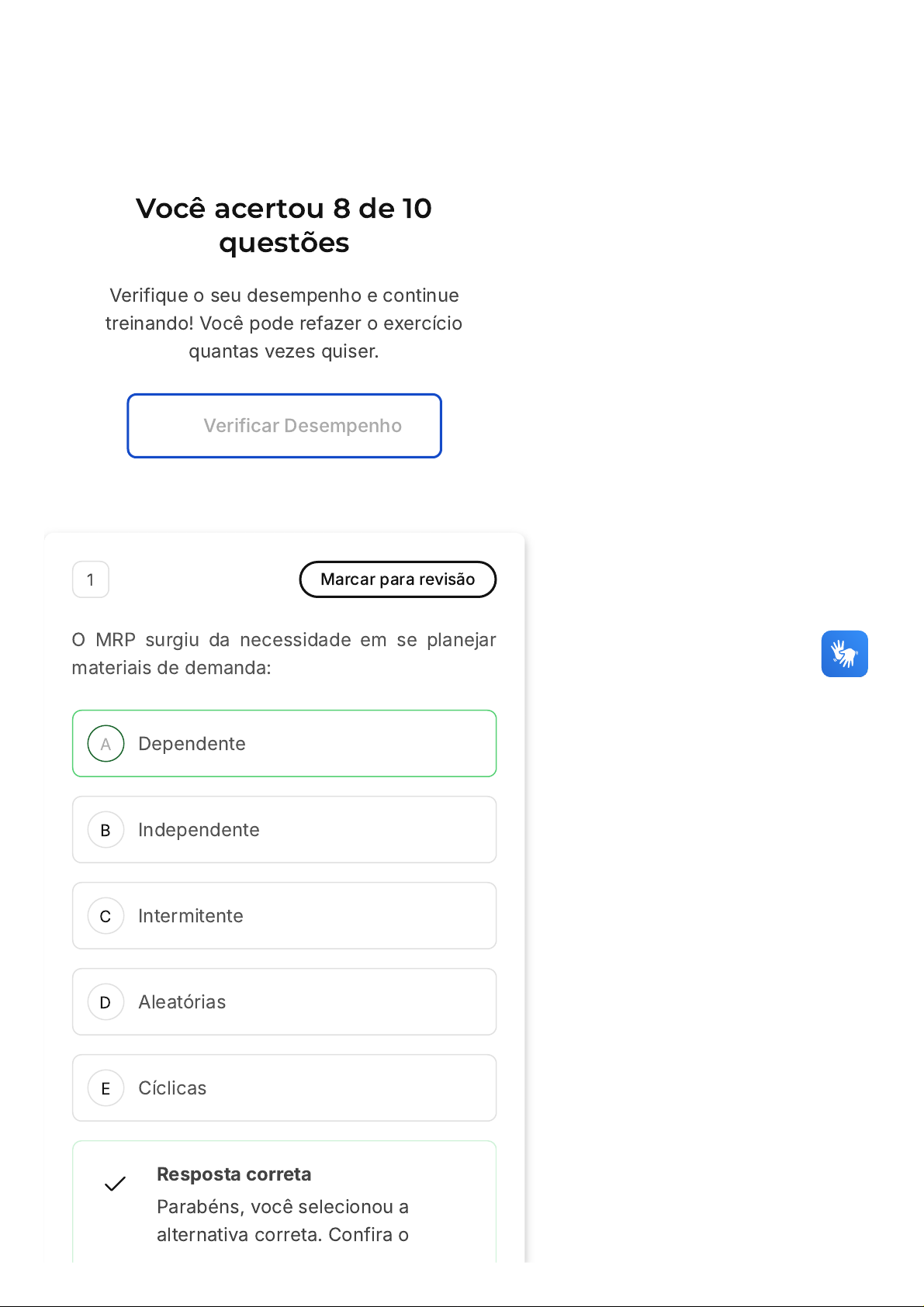Você acertou 8 de 10 questões Verifique o seu desempenho e continue treinando! Você pode refazer o exercício quantas vezes quiser. Verificar Desempenho A B C D E 1 Marcar para revisão O MRP surgiu da necessidade em se planejar materiais de demanda: Dependente Independente Intermitente Aleatórias Cíclicas Resposta correta Parabéns, você selecionou a alternativa correta. Confira o A B gabarito comentado! Gabarito Comentado O MRP (Material Requirement Planning ou Planejamento das Necessidades de Materiais) foi desenvolvido para auxiliar no planejamento de materiais de demanda dependente. A demanda dependente é aquela que está diretamente ligada à demanda de outros itens. Por exemplo, a demanda por pneus em uma fábrica de carros é dependente da quantidade de carros que serão produzidos. Portanto, a alternativa correta é a "Dependente". 2 Marcar para revisão O MRP (Material Requirements Planning - Planejamento das Necessidades de Materiais) é uma ferramenta que permite que as empresas efetuem o planejamento de todos os seus materiais. O cálculo das necessidades de materiais em função da demanda é fundamental. A Necessidade Líquida (Nliq) corresponde: A diferença entre as Ordens Planejadas de Compra e de Produção. As quantidades mínimas de materiais e produtos a serem comprados ou fabricados. Lista de exercícios Planejament… Sair C D E À quantidade necessária para o atendimento da Necessidade de Produção Projetada e para que o estoque de segurança parametrizado para o item seja atendido, não levando em consideração as condições de Lotes Mínimos e Lotes Múltiplos. À quantidade de cada item que se deseja manter em estoque. Aos recebimentos confirmados por meio de ordens firmes (confirmadas) através de execuções anteriores do MRP. Resposta incorreta Opa! A alternativa correta é a letra C. Confira o gabarito comentado! Gabarito Comentado A Necessidade Líquida (Nliq) é calculada subtraindo-se as Necessidades de Produção Projetadas (NProj) somadas à quantidade que desejamos manter como Estoque de Segurança (ES) da quantidade total disponível ( Emãos + Rfir). 3 Marcar para revisão São saídas do Sistema MRP: Questão 3 de 10 Corretas (8) Incorretas (2) Em branco (0) 1 2 3 4 5 6 7 8 9 10 A B C D E Ordens Firmes Ordens Planejadas Pedidos de Compras Programação de Produção Informações de capacidade Resposta incorreta Opa! A alternativa correta é a letra B. Confira o gabarito comentado! Gabarito Comentado O Sistema MRP (Planejamento de Recursos de Manufatura) é uma ferramenta de controle de produção que tem como objetivo principal determinar a quantidade de cada item que deve ser produzido e o momento adequado para a produção. Dentre as saídas desse sistema, estão as Ordens Planejadas, que são planos de produção futuros, ainda não liberados para o chão de fábrica. Portanto, a alternativa correta é a "Ordens Planejadas". 4 Marcar para revisão São riscos inerentes ao processo de MRP, EXCETO: A B C D E Vendas em quantidades superiores às demandas previstas no MPS Falta de pessoal Atrasos de fornecedores Tempos de ressuprimentos cadastrados inferiores aos reais Erros de saldos em estoques Resposta correta Parabéns, você selecionou a alternativa correta. Confira o gabarito comentado! Gabarito Comentado O MRP (Planejamento de Necessidades de Materiais) é um sistema de controle de produção que tem como objetivo principal determinar a quantidade de cada item que deve ser produzido e o momento adequado para a produção. Os riscos inerentes a esse processo incluem vendas em quantidades superiores às demandas previstas, atrasos de fornecedores, tempos de ressuprimentos cadastrados inferiores aos reais e erros de saldos em estoques. No entanto, a falta de pessoal não é um risco inerente ao processo de MRP, pois este é um sistema que depende mais da precisão das informações e do planejamento do que do número de A B C D E pessoas envolvidas. Portanto, a alternativa correta é a "B". 5 Marcar para revisão Os Sistemas de Planejamento dos Recursos de Manufatura são conhecidos pela sigla: ERP ECR CRM MRP MRP II Resposta correta Parabéns, você selecionou a alternativa correta. Confira o gabarito comentado! Gabarito Comentado A sigla MRP II representa os Sistemas de Planejamento dos Recursos de Manufatura. Esses sistemas são uma evolução do MRP (Planejamento de Necessidades de Materiais) e incluem outras funções além do planejamento de produção, como planejamento financeiro e de recursos A B C D E humanos. Portanto, a alternativa correta é a letra E, que indica a sigla MRP II. 6 Marcar para revisão O MRP (Material Requirements Planning - Planejamento das Necessidades de Materiais) é uma ferramenta que permite que as empresas efetuem o planejamento de todos os seus materiais. Como resultados gerados pelo MRP, podemos esperar: Ordens de venda. Ordens de compra. Ordens de ação. Ordens de embargo. Ordens de estoque. Resposta correta Parabéns, você selecionou a alternativa correta. Confira o gabarito comentado! Gabarito Comentado O MRP é uma ferramenta de planejamento que gera Ordens de Compra e Ordens de Produção para todos os itens que a empresa necessita, sejam eles comprados A B C ou fabricados. Essas ordens indicam as quantidades necessárias e as datas de início e término de cada material, abrangendo desde as matérias-primas até os produtos acabados. Além disso, o MRP também realiza todos os replanejamentos necessários em função de alterações de datas de entrega e cancelamento de pedidos de produtos acabados. Portanto, dentre as opções apresentadas, a alternativa B, "Ordens de compra", é a que melhor representa um resultado gerado pelo MRP. 7 Marcar para revisão O MRP (Material Requirements Planning - Planejamento das Necessidades de Materiais) é uma ferramenta que permite que as empresas efetuem o planejamento de todos os seus materiais. Ele define a quantidade e o momento certo no qual os p