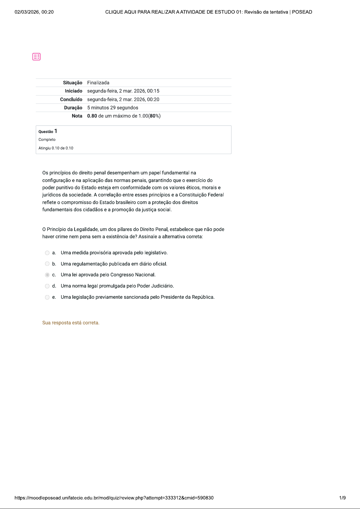 02/03/2026, 00:20 CLIQUE AQUI PARA REALIZAR AATIVIDADE DE ESTUDO 01: Revisão da tentativa POSEAD Situação Finalizada Iniciado segunda-feira, 2 mar. 2026, 00:15 Concluído segunda-feira, 2 mar. 2026, 00:20 Duração 5 minutos 29 segundos Nota 0.80 de um máximo de 1.00(80%) Questão 1 Completo Atingiu 0.10 de 0.10 Os princípios do direito penal desempenham um papel fundamental na configuração e na aplicação das normas penais, garantindo que o exercício do poder punitivo do Estado esteja em conformidade com os valores éticos, morais e jurídicos da sociedade. A correlação entre esses princípios e a Constituição Federal reflete o compromisso do Estado brasileiro com a proteção dos direitos fundamentais dos cidadãos e a promoção da justiça social. Princípio da Legalidade, um dos pilares do Direito Penal, estabelece que não pode haver crime nem pena sem a existência de? Assinale a alternativa correta: a. Uma medida provisória aprovada pelo legislativo. b. Uma regulamentação publicada em diário oficial. Uma lei aprovada pelo Congresso Nacional. d. Uma norma legal promulgada pelo Poder Judiciário. e. Uma legislação previamente sancionada pelo Presidente da República. Sua resposta está correta. 1/902/03/2026, 00:20 CLIQUE AQUI PARA REALIZAR AATIVIDADE DE ESTUDO 01: Revisão da tentativa POSEAD Questão 2 Completo Atingiu 0.10 de 0.10 Além das diferenças em relação ao regime inicial de cumprimento de pena, a reclusão e a detenção também apresentam distinções quanto aos efeitos secundários específicos da condenação. Esses efeitos secundários podem variar de acordo com a gravidade do delito e a modalidade de pena imposta. Sendo assim, cada caso deve ser analisado em sua singularidade, para que as aplicações de pena sejam corretas. Considerando essas informações, qual das seguintes afirmativas está correta sobre os efeitos secundários da condenação relacionados à reclusão? Assinale a alternativa correta: a. A incapacidade para exercer o poder familiar é uma medida aplicada apenas nos casos de detenção. b. A medida de segurança em regime de internação é aplicada nos casos de crimes puníveis com reclusão. Os efeitos secundários da condenação na reclusão incluem a perda dos direitos políticos. d. Não há previsão para incapacidade para exercer o poder familiar nos crimes puníveis com reclusão. e. A reclusão não acarreta efeitos secundários específicos da condenação. Sua resposta está correta. 2/902/03/2026, 00:20 CLIQUE AQUI PARA REALIZAR AATIVIDADE DE ESTUDO 01: Revisão da tentativa POSEAD Questão 3 Completo Atingiu 0.10 de 0.10 Direito Penal pode se relacionar com outras matérias do Direito, como mostrado na Unidade da apostila de Teoria Geral da Pena. Como, por exemplo, com Direito Administrativo com as infrações administrativas. Tais infrações são menos severas que as infrações penais, mas uma condenação penal pode acabar acarretando repercussões na esfera administrativa, como a destituição de cargo ou função pública. Tendo em vista o texto acima e a apostila de Teoria Geral da Pena, analise as assertivas abaixo e assinale como Verdadeiro (V) ou Falso (F): Direito Penal se relaciona com diversas matérias, entretanto, não se relaciona em nenhum momento com o Direito Tributário. civil é mais abrangente que a de transgressão penal. ( ) Direito Penal não extrai sua base do Direito Constitucional. A aplicação do Direito Penal não requer o cumprimento do devido processo legal. As responsabilidades civil e penal são autônomas. Assinale a alternativa correta: a. F-V-F-F-V. b. F-F-F-V-V. d. V-F-V-V-F. e. V-V-F-F-F. Sua resposta está correta. 3/902/03/2026, 00:20 CLIQUE AQUI PARA REALIZAR AATIVIDADE DE ESTUDO 01: Revisão da tentativa POSEAD Questão 4 Completo Atingiu 0.00 de 0.10 A prisão simples é uma forma de pena privativa de liberdade aplicada para contravenções penais, com diretrizes específicas estabelecidas pela Lei das Contravenções Penais. Conforme o artigo 6° desta lei, existem restrições sobre o cumprimento desta pena, incluindo a impossibilidade de regressão ao regime fechado e a necessidade de cumprimento sem rigor penitenciário. Assinale Verdadeiro (V) ou Falso (F) para as seguintes afirmações sobre a prisão simples: () A pena de prisão simples pode ser cumprida nos regimes fechado, semiaberto e aberto. () trabalho é opcional quando a pena aplicada não excede 15 dias. () A prisão simples deve ser cumprida separadamente dos condenados por crimes. () prazo máximo de prisão simples é de 05 anos. () A prisão simples pode ser cumprida com rigor penitenciário. Assinale a alternativa correta: a. b. F-F-F-V-V. V-V-V-F-F. d. V-F-V-V-V. e. F-V-V-F-F. Sua resposta está incorreta. 4/902/03/2026, 00:20 CLIQUE AQUI PARA REALIZAR AATIVIDADE DE ESTUDO 01: Revisão da tentativa POSEAD Questão 5 Completo Atingiu 0.10 de 0.10 A determinação do regime inicial da execução da pena é uma etapa crucial do processo penal, regida pelo art. 33, § 2°, do Código Penal. Este regime inicial é decidido pelo magistrado no momento da sentença, enquanto as progressões para regimes mais amenos ou regressões para regimes mais severos são decididas pelo juiz da vara de execuções penais. Para decidir sobre o regime inicial, o juiz deve considerar elementos como o tipo de delito, a quantidade de pena, a reincidência do acusado, as circunstâncias do artigo 59 do Código Penal, e o período de prisão preventiva. sistema carcerário brasileiro divide o encarceramento em três tipos: fechado, semiaberto e aberto. Considerando as disposições legais e os fatores que influenciam a determinação do regime inicial da execução da pena, assinale a alternativa correta: a. As progressões para regimes mais amenos ou regressões para regimes mais severos são decididas pelo magistrado que emitiu a sentença. b. regime de encarceramento fechado pode ser aplicado apenas em casos de delito