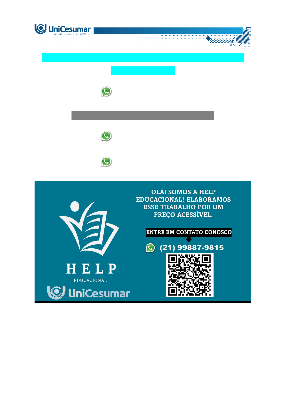 ATIVIDADE 1 – ECO – TRABALHO DE CONCLUSÃO DE CURSO - 51_2026 (21) 99887-9815 ASSESSORIA NOS SEUS TRABALHOS (21) 99887-9815 (21) 99887-9815 Prezado(a) Acadêmico(a), Com base nas orientações das aulas conceituais da disciplina de Trabalho de Conclusão de Curso, nesta atividade você deverá postar seu Projeto de Pesquisa, a partir dos temas pré-definidos no Regulamento da Disciplina de Trabalho de Conclusão de Curso, disponível na pasta Material da Disciplina. Sendo assim, o seu Projeto de Pesquisa deverá contemplar os seguintes tópicos: Introdução Objetivo geral Objetivos específicos Referencial Teórico Procedimentos Metodológicos Cronograma e Referências Orientações: - Para realizar esta atividade, você deverá utilizar o modelo disponível no Material da Disciplina, e anexá-lo no ambiente. - Desenvolva em seu trabalho todos os tópicos elencados para esta atividade. - Realize uma cuidadosa correção ortográfica. - Você deverá levar em consideração as normas para citações diretas e/ou indiretas ao utilizar textos de apoio. - Para verificar normas de citação, referências e demais estruturas de trabalho científico, consulte os arquivos disponíveis no Material da Disciplina e assista aos tutoriais presentes no ambiente da disciplina. - O formato do arquivo deve ser “texto” (doc ou docx). Não serão aceitos trabalhos em PDF. - Não serão aceitos trabalhos após o encerramento do prazo. - Não será atribuída nota em trabalhos que apresentarem plágio. - Não serão aceitos trabalhos após o encerramento do prazo, lembrando que NÃO haverá prazo de 50% para o envio desta atividade. Atenção: Para anexar o arquivo na atividade, clique sobre o botão "Selecionar arquivo". Após anexar o trabalho e certificar-se que se trata do arquivo correto, clique no botão "Responder" e, posteriormente, em "Finalizar". Após "Finalizar a Atividade", não será possível enviá-la novamente ou realizar qualquer modificação no arquivo enviado. A construção da nota da disciplina é gradual, portanto, a realização de todas as etapas é importante. Bom trabalho! OLÁ! SOMOS A HELP EDUCACIONAL! ELABORAMOS ESSE TRABALHO POR UM PREÇO ACESSÍVEL. ENTRE EM CONTATO CONOSCO (21) 99887-9815 image1.png image2.png image3.png