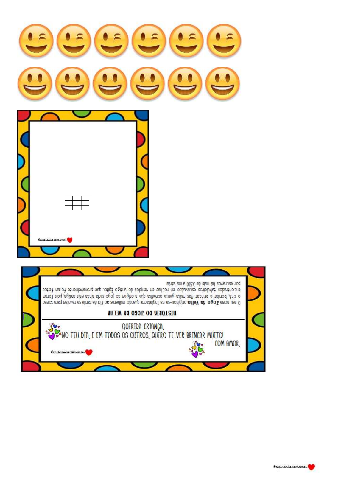 COMO MONTAR SEU JOGO DA VELHA? 1.RECORTE AS FIGURAS DE EMOJIS. ELAS SERÃO AS PEÇAS DOS JOGADORES; 2. COM OS PALITOS DE PICOLÉ, ORGANIZE SEU TABULEIRO NESSE FORMATO ; 3.AGORA É SÓ CONVIDAR ALGUÉM PARA JOGAR COM VOCÊ! BOA SORTE!