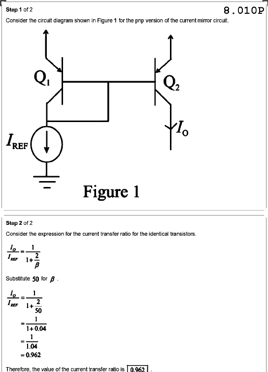Step 1 of 2 8.010P Consider the circuit diagram shown in Figure 1 for the pnp version of the current mirror circuit. Q2 I₀ I REF - Figure 1 Step 2 of 2 Consider the expression for the current transfer ratio for the identical transistors. Substitute 50 for 1 = 1+0.04 1 = 1.04 =0.962 Therefore, the value of the current transfer ratio is 0.962