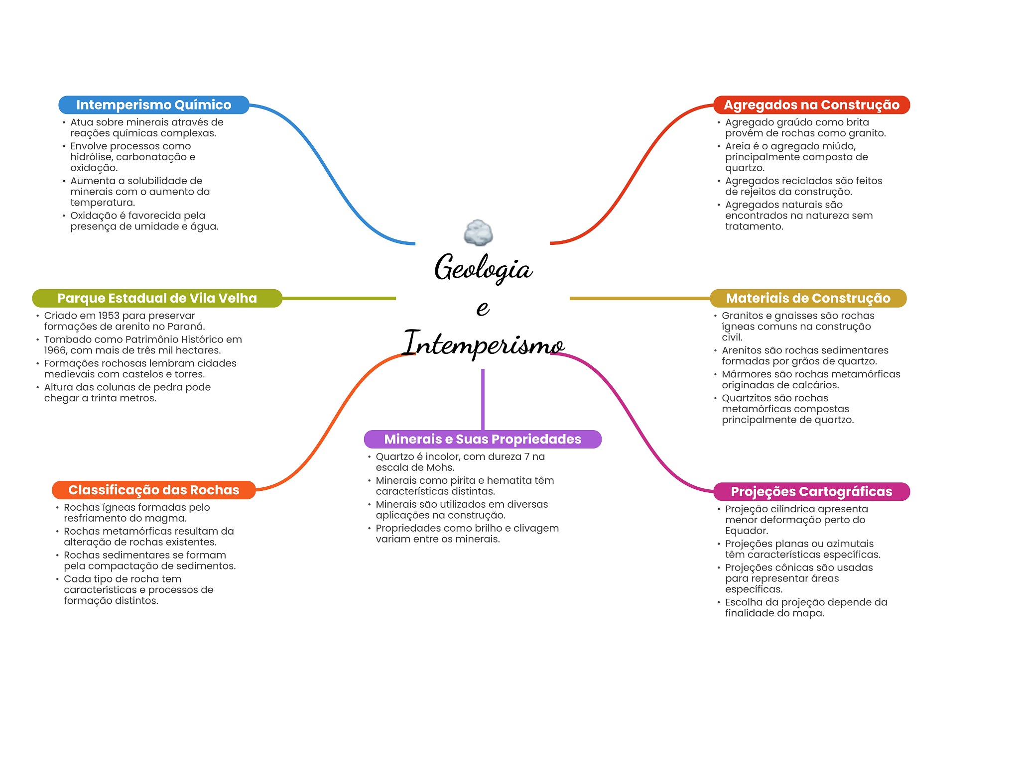 Intemperismo Químico Agregados na Construção Atua sobre minerais através de Agregado graúdo como brita reações químicas complexas. provém de rochas como granito. Envolve processos como Areia é agregado miúdo, hidrólise, carbonatação e principalmente composta de oxidação. quartzo. Aumenta a solubilidade de Agregados reciclados são feitos minerais com aumento da de rejeitos da construção. temperatura. Agregados naturais são Oxidação é favorecida pela encontrados na natureza sem presença de umidade e água. tratamento. Geologia Parque Estadual de Vila Velha Materiais de Construção e Criado em 1953 para preservar Granitos e gnaisses são rochas formações de arenito no Paraná. ígneas comuns na construção Tombado como Patrimônio Histórico em Intemperismo civil. 1966, com mais de três mil hectares. Arenitos são rochas sedimentares Formações rochosas lembram cidades formadas por grãos de quartzo. medievais com castelos e torres. Mármores são rochas metamórficas Altura das colunas de pedra pode originadas de calcários. chegar a trinta metros. Quartzitos são rochas metamórficas compostas principalmente de quartzo. Minerais e Suas Propriedades Quartzo é incolor, com dureza 7 na escala de Mohs. Minerais como pirita e hematita têm Classificação das Rochas características distintas. Projeções Cartográficas Rochas ígneas formadas pelo Minerais são utilizados em diversas Projeção cilíndrica apresenta resfriamento do magma. aplicações na construção. menor deformação perto do Rochas metamórficas resultam da Propriedades como brilho e clivagem Equador. alteração de rochas existentes. variam entre OS minerais. Projeções planas ou azimutais Rochas sedimentares se formam têm características específicas. pela compactação de sedimentos. Projeções cônicas são usadas Cada tipo de rocha tem para representar áreas características e processos de específicas. formação distintos. Escolha da projeção depende da finalidade do mapa.