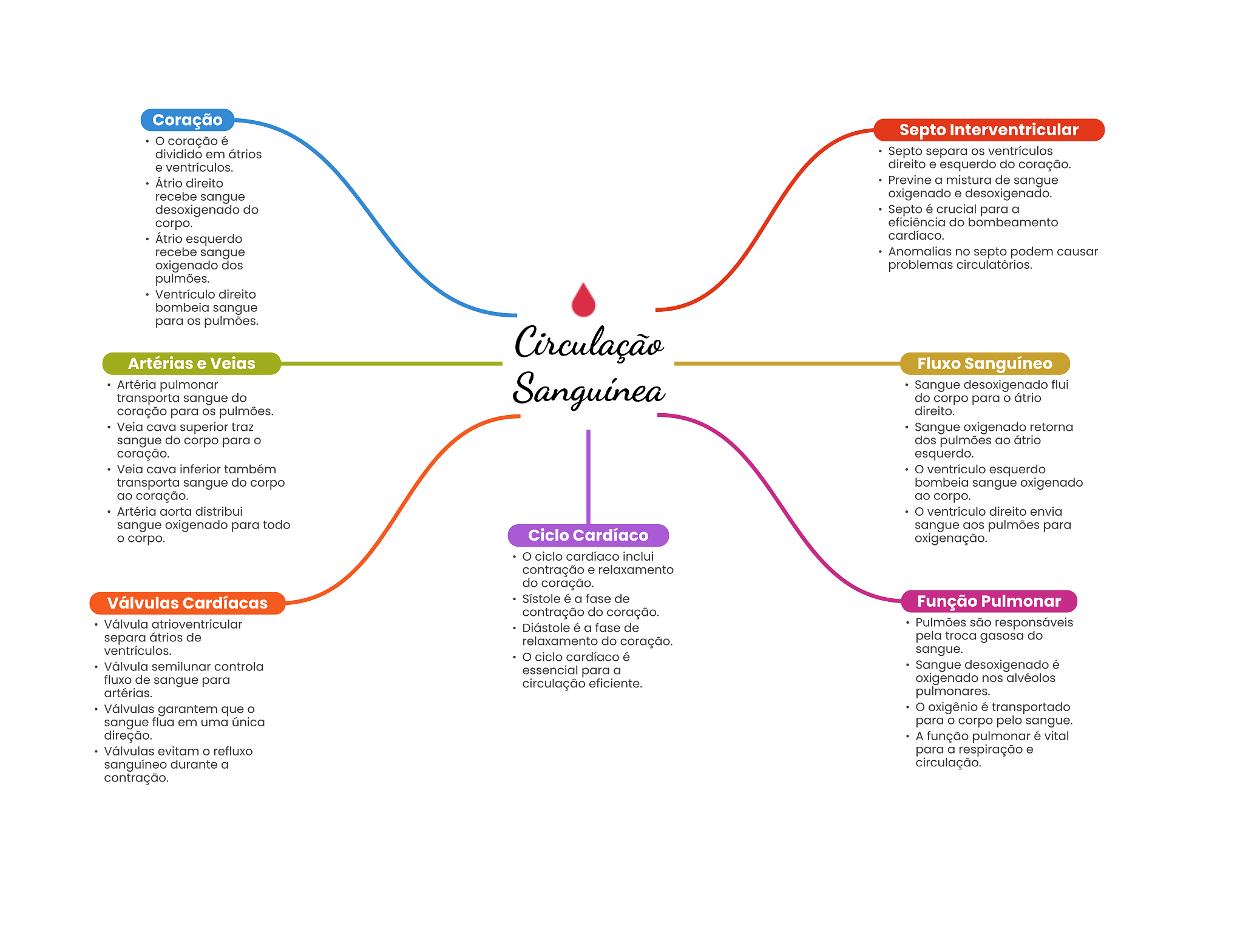 Coração Septo Interventricular coração é dividido em átrios Septo separa ventrículos e ventrículos. direito e esquerdo do coração. Átrio direito Previne a mistura de sangue recebe sangue oxigenado e desoxigenado. desoxigenado do Septo é crucial para a corpo. eficiência do bombeamento Átrio esquerdo cardíaco. recebe sangue Anomalias no septo podem causar oxigenado dos problemas circulatórios. pulmões. Ventrículo direito bombeia sangue para OS pulmões. Circulação Artérias e Veias Fluxo Sanguíneo Artéria pulmonar Sanguínea Sangue desoxigenado flui transporta sangue do do corpo para átrio coração para OS pulmões. direito. Veia cava superior traz Sangue oxigenado retorna sangue do corpo para O dos pulmões ao átrio coração. esquerdo. Veia cava inferior também O ventrículo esquerdo transporta sangue do corpo bombeia sangue oxigenado ao coração. ao corpo. Artéria aorta distribui O ventrículo direito envia sangue oxigenado para todo sangue aos pulmões para O corpo. Ciclo Cardíaco oxigenação. ciclo cardíaco inclui contração e relaxamento do coração. Válvulas Cardíacas é a fase de Função Pulmonar contração do coração. Válvula atrioventricular Diástole é a fase de Pulmões são responsáveis separa átrios de relaxamento do coração. pela troca gasosa do ventrículos. ciclo cardíaco é sangue. Válvula semilunar controla essencial para a Sangue desoxigenado é fluxo de sangue para circulação eficiente. oxigenado nos alvéolos artérias. pulmonares. Válvulas garantem que O oxigênio é transportado sangue flua em uma única para O corpo pelo sangue. direção. A função pulmonar é vital Válvulas evitam refluxo para a respiração e sanguíneo durante a circulação. contração.