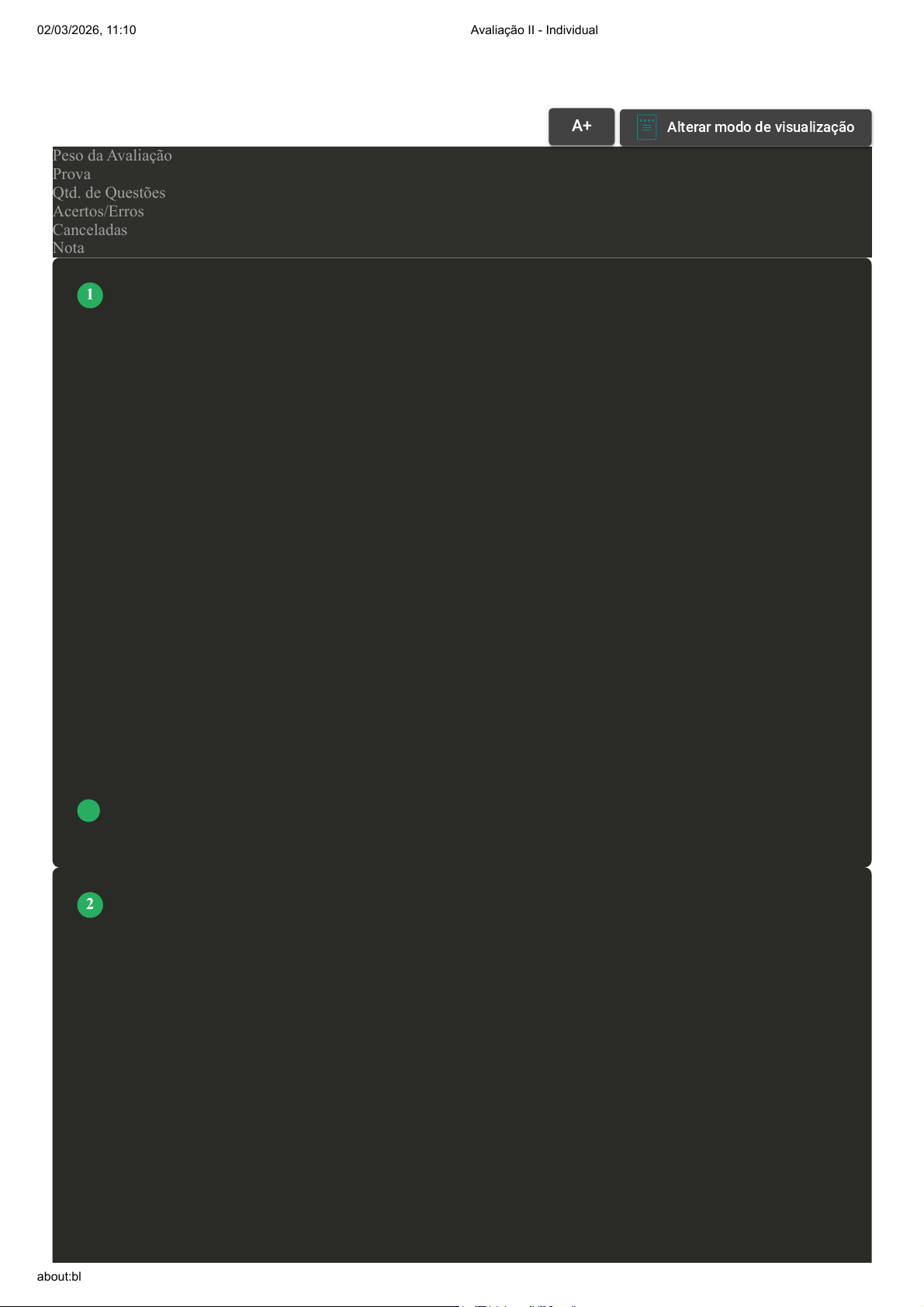 Prova Impressa GABARITO | Avaliação II - Individual (Cod.:1522151) Peso da Avaliação 2,00 Prova 102850383 Qtd. de Questões 10 Acertos/Erros 9/0 Canceladas 1 Nota 10,00 Com os holandeses, veio o Conde Maurício de Nassau, no ano de 1637. Estabeleceu-se no nordeste brasileiro e trouxe consigo médicos, geógrafos, escritores, pintores, entre outros profissionais. Os artistas que vieram não tinham ligação com a religião e, com isso, trouxeram algumas mudanças. Sobre o exposto, classifique V para as sentenças verdadeiras e F para as falsas: ( ) Quando o artista Eckhout registrou a fauna e a flora brasileira, a fotografia já tinha sido inventada. ( ) Podem ser considerados repórteres do século XVII, pois estes artistas registraram parte do cotidiano deste período histórico. ( ) O holandês Post pintou motivos religiosos quando ingressou ao Brasil. ( ) Foram os primeiros artistas no Brasil e na América a desenvolverem pinturas de paisagem, tipos étnicos, fauna e flora. Assinale a alternativa que apresenta a sequência CORRETA: A V - V - F - F. B F - F - F - V. C V - F - V - F. D F - V - F - V. Muitos artistas de diferentes nacionalidades deixaram seus registros sobre o Brasil na arquitetura, na pintura, na literatura e na música. Sobre as manifestações artísticas que mais caracterizam a arte no período colonial brasileiro, assinale a alternativa CORRETA: A Arquitetura e gravura. B Escultura e artesanato. C Escultura e cerâmica. VOLTAR A+Aumentar, FonteAlterar modo de visualização 1 2 02/03/2026, 11:10 Avaliação II - Individual about:blank 1/6 D Artes plásticas e arquitetura. Atenção: Esta questão foi cancelada, porém a pontuação foi considerada. O processo de colonização do Brasil trouxe ao país a arte barroca, que até hoje é responsável por tamanho encantamento em algumas igrejas. No Brasil, o barroco se manifestou por meio dos colonizadores portugueses, que tinham o objetivo de catequizar o povo que aqui habitava. Sobre o Barroco brasileiro, classifique V para as sentenças verdadeiras e F para as falsas: ( ) É na decoração das igrejas que emerge o esplendor da arte barroca, embora sua arquitetura seja exclusivamente brasileira. Em ambas as formas, em muitos casos, possuem o seu interior ornados por colunas, com suas curvas graciosas. ( ) A Igreja Nossa Senhora do Rosário, localizada na cidade de Embu, em São Paulo, é considerada expressão máxima do barroco mineiro, com os altares e pinturas muito bem conservadas. ( ) O barroco brasileiro pode ser percebido de duas formas: como o barroco litorâneo e o barroco interiorano que se apresenta com grande quantidade de ouro e pedras preciosas. ( ) Entre os escultores, destaca-se Antônio Francisco Lisboa, o qual também é reconhecido pelo trabalho de entalhador e arquiteto. Assinale a alternativa que apresenta a sequência CORRETA: A F - V - F - V. B V - F - F - F. C F - F - V - V. D F - V - V - V. O artista holandês Albert Eckhout (1610-1666) veio ao Brasil, em 1637, na comitiva de Maurício de Nassau. Tinha 27 anos e aqui viveu por quase sete anos. Era pintor, desenhista de tipos e costumes, paisagista e naturalista de excepcional domínio do traço e das cores. Durante sua permanência no Nordeste, Eckhout pintou, entre outras obras, oito grandes telas representando homens e mulheres habitantes do Brasil. Sobre o artista, analise as sentenças a seguir: I- Foi considerado o primeiro europeu a pintar as pinturas do Brasil, no período colonial. II- Suas naturezas mortas eram novidade por estas terras e Eckhout abraçou os temas da cultura brasileira. III- As obras de Albert Eckhout são consideradas documentos de importância científica e etnográfica, de qualidade técnica quanto ao uso das cores e composições. IV- Dedicou-se mais à pintura de retratos, pois rendia mais dinheiro no período colonial. Assinale a alternativa CORRETA: A Somente a sentença I está correta. 3 4 02/03/2026, 11:10 Avaliação II - Individual about:blank 2/6 B As sentenças II e III estão corretas. C As sentenças I e III estão corretas. D As sentenças III e IV estão corretas. O Santuário do Bom Jesus de Matosinhos, em Congonhas do Campo, Minas Gerais, é um bom exemplo de manifestação da Arte Barroca. O santuário é composto por uma igreja e doze esculturas, representando profetas, realizadas a partir de pedra-sabão. Baseado no exposto e na imagem anexa, assinale a alternativa CORRETA que apresenta o nome do autor: A Antônio José da Silva. B José Joaquim Rocha. C José Patrício da Silva. 5 02/03/2026, 11:10 Avaliação II - Individual about:blank 3/6 D Antônio Francisco Lisboa. O holandês Frans Post chegou a Pernambuco, em 1637, como membro da comitiva de artistas e cientistas trazida pelo conde Maurício de Nassau para documentar o Novo Mundo durante seu governo no Brasil. Filho do pintor de vitrais Jan Janszoon Post (15-- - 1614) e irmão do arquiteto e pintor Pieter Jansz Post (1608 - 1669), Post volta-se cedo para um dos gêneros de pintura mais importantes da Holanda na época, a pintura de paisagem. Os holandeses influenciaram muito a nossa arte com seu jeito de fazê-la. Partindo desse pressuposto, classifique V para as sentenças verdadeiras e F para as falsas: ( ) Post foi considerado o artista mais importante da expedição. Realizava suas obras em traçado de perspectiva que valorizava o céu e os movimentos das nuvens. ( ) Em suas pinturas utilizava paletas de cores holandesa para representar as nossas cenas tropicais, mostrando um desenho sóbrio e simplificado, mantendo a luminosidade da atmosfera local. ( ) Foi o primeiro pintor a registrar as peculiaridades das paisagens brasileiras, retratando temas como a natureza morta, retratos e as paisagens. ( ) Dedicou-se mais à pintura de retratos, pois rendia mais dinheiro no período colonial. Assinale a alternativa que apresenta a sequência CORRETA: A V - F - F - V. B V - V - V - F. C F - V - F - V. D V - V - F - V. O Barroco no Brasil 