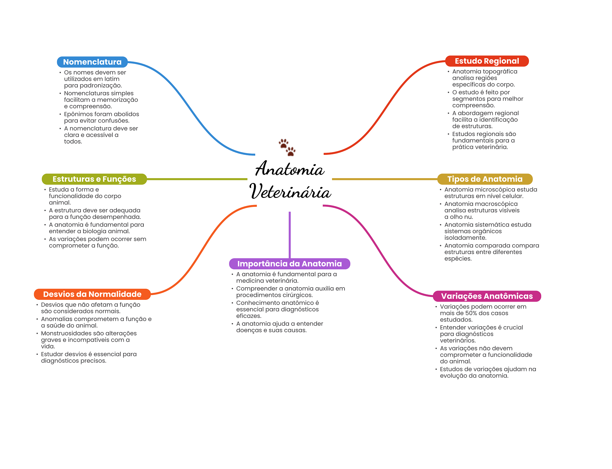 Nomenclatura Estudo Regional Os nomes devem ser Anatomia topográfica utilizados em latim analisa regiões para padronização. específicas do corpo. Nomenclaturas simples estudo é feito por facilitam a memorização segmentos para melhor e compreensão. compreensão. Epônimos foram abolidos A abordagem regional para evitar confusões. facilita a identificação A nomenclatura deve ser de estruturas. clara e acessível a Estudos regionais são todos. fundamentais para a prática veterinária. Anatomia Estruturas e Funções Tipos de Anatomia Estuda a forma e funcionalidade do corpo Veterinária Anatomia microscópica estuda estruturas em nível celular. animal. Anatomia macroscópica A estrutura deve ser adequada analisa estruturas visíveis para a função desempenhada. a olho nu. A anatomia é fundamental para Anatomia sistemática estuda entender a biologia animal. sistemas orgânicos As variações podem ocorrer sem isoladamente. comprometer a função. Anatomia comparada compara estruturas entre diferentes espécies. Importância da Anatomia A anatomia é fundamental para a medicina veterinária. Compreender a anatomia auxilia em Desvios da Normalidade procedimentos cirúrgicos. Variações Anatômicas Desvios que não afetam a função Conhecimento anatômico é são considerados normais. essencial para diagnósticos Variações podem ocorrer em eficazes. mais de 50% dos casos Anomalias comprometem a função e estudados. a saúde do animal. A anatomia ajuda a entender doenças e suas causas. Entender variações é crucial Monstruosidades são alterações para diagnósticos graves e incompatíveis com a veterinários. vida. As variações não devem Estudar desvios é essencial para comprometer a funcionalidade diagnósticos precisos. do animal. Estudos de variações ajudam na evolução da anatomia.