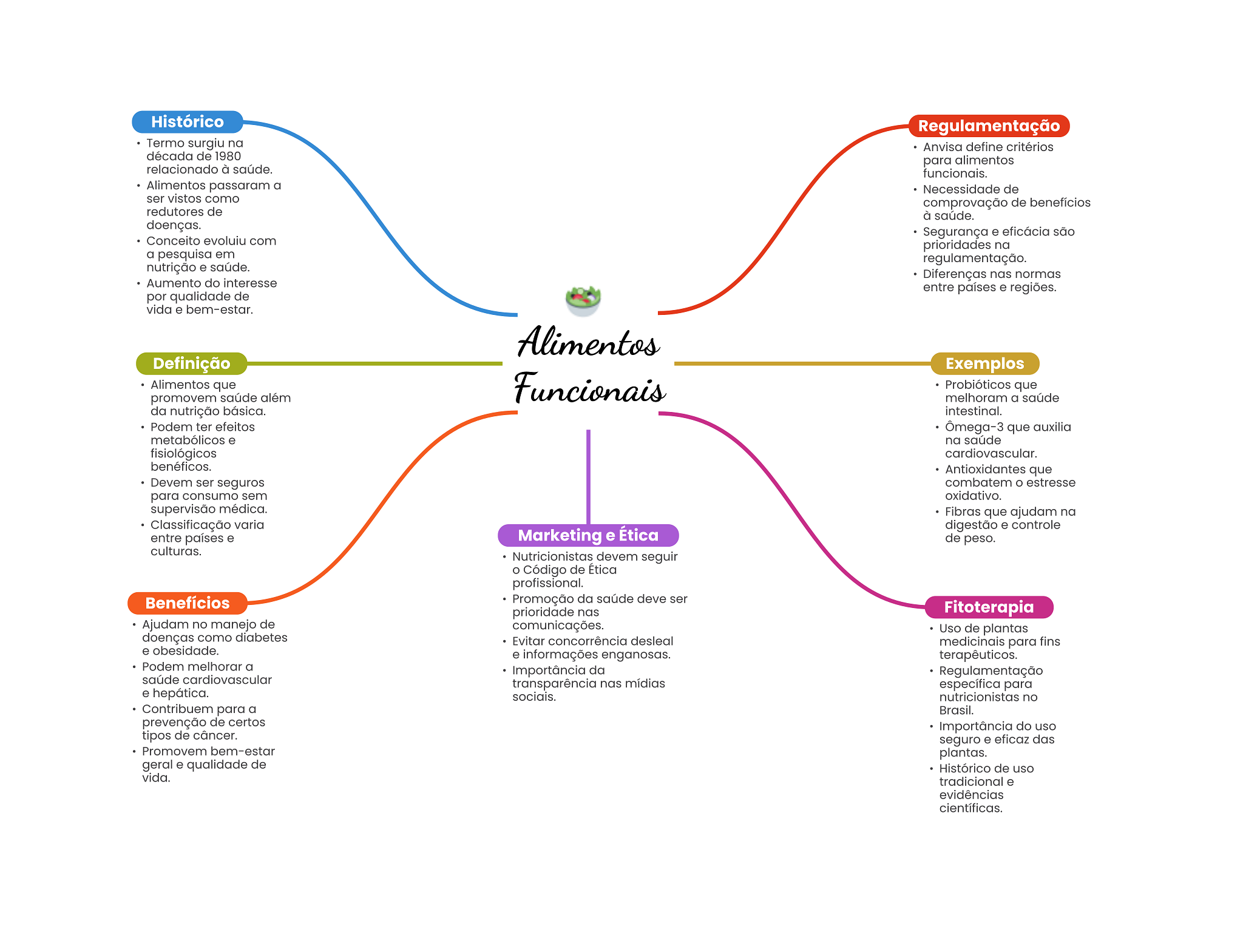 Histórico Regulamentação Termo surgiu na Anvisa define critérios década de 1980 para alimentos relacionado à saúde. funcionais. Alimentos passaram a Necessidade de ser vistos como comprovação de benefícios redutores de à saúde. doenças. Segurança e eficácia são Conceito evoluiu com prioridades na a pesquisa em regulamentação. nutrição e saúde. Diferenças nas normas Aumento do interesse entre países e regiões. por qualidade de vida e bem-estar. Alimentos Definição Exemplos Alimentos que promovem saúde além Funcionais Probióticos que melhoram a saúde da nutrição básica. intestinal. Podem ter efeitos Ômega-3 que auxilia metabólicos e na saúde fisiológicos cardiovascular. benéficos. Antioxidantes que Devem ser seguros combatem O estresse para consumo sem oxidativo. supervisão médica. Fibras que ajudam na Classificação varia digestão e controle entre países e Marketing e Ética de peso. culturas. Nutricionistas devem seguir O Código de Ética profissional. Benefícios Promoção da saúde deve ser prioridade nas Fitoterapia Ajudam no manejo de comunicações. Uso de plantas doenças como diabetes Evitar concorrência desleal medicinais para fins e obesidade. e informações enganosas. terapêuticos. Podem melhorar a Importância da Regulamentação saúde cardiovascular transparência nas mídias específica para e - hepática. sociais. nutricionistas no Contribuem para a Brasil. prevenção de certos Importância do uso tipos de câncer. seguro e eficaz das Promovem bem-estar plantas. geral e qualidade de Histórico de uso vida. tradicional e evidências científicas.