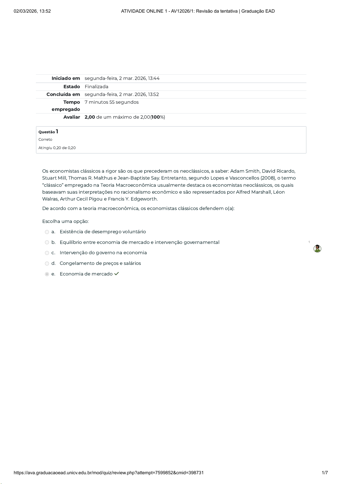 Iniciado em segunda-feira, 2 mar. 2026, 13:44 Estado Finalizada Concluída em segunda-feira, 2 mar. 2026, 13:52 Tempo empregado 7 minutos 55 segundos Avaliar 2,00 de um máximo de 2,00(100%) Questão 1 Correto Atingiu 0,20 de 0,20 Os economistas clássicos a rigor são os que precederam os neoclássicos, a saber: Adam Smith, David Ricardo, Stuart Mill, Thomas R. Malthus e Jean-Baptiste Say. Entretanto, segundo Lopes e Vasconcellos (2008), o termo “clássico” empregado na Teoria Macroeconômica usualmente destaca os economistas neoclássicos, os quais baseavam suas interpretações no racionalismo econômico e são representados por Alfred Marshall, Léon Walras, Arthur Cecil Pigou e Francis Y. Edgeworth. De acordo com a teoria macroeconômica, os economistas clássicos defendem o(a): Escolha uma opção: a. Existência de desemprego voluntário b. Equilíbrio entre economia de mercado e intervenção governamental c. Intervenção do governo na economia d. Congelamento de preços e salários e. Economia de mercado ✓ 1 02/03/2026, 13:52 ATIVIDADE ONLINE 1 - AV12026/1: Revisão da tentativa | Graduação EAD https://ava.graduacaoead.unicv.edu.br/mod/quiz/review.php?attempt=7599852&cmid=398731 1/7 Questão 2 Correto Atingiu 0,20 de 0,20 No caso de uma economia de pequeno porte com perfeita mobilidade de capitais, em que a curva BP é horizontal, pressupondo que há um único nível de taxa de juros que equilibra BP: quando a taxa de juros interna (i) é igual à taxa de juros externa (i^*), se tem-se câmbio fixo e é realizado uma política monetária expansionista,o aumento da oferta de moeda levará a um deslocamento da curva LM para a direita. Esse movimento deslocará o equilíbrio interno do ponto A para o ponto B, no qual teremos uma taxa de juros menor que a taxa de juros externa e um nível de renda maior. Sobre as consequências de a taxa de juros externa estar maior que a taxa de juros interna, analise as afirmativas a seguir: I – Haverá entrada massiva de capital no país. II – Ocorrerá aumento da renda III – O balanço de pagamentos ficará com déficit IV – Haverá redução das reservas internacionais É correto o que se afirma em: Escolha uma opção: a. I, II e IV b. II, III e IV ✓ c. I, II e III d. I, III e IV e. I, II, III e IV 1 02/03/2026, 13:52 ATIVIDADE ONLINE 1 - AV12026/1: Revisão da tentativa | Graduação EAD https://ava.graduacaoead.unicv.edu.br/mod/quiz/review.php?attempt=7599852&cmid=398731 2/7 Questão 3 Correto Atingiu 0,20 de 0,20 Questão 4 Correto Atingiu 0,20 de 0,20 O Modelo IS-LM é um modelo originário do trabalho de Hichs (1937), denominada “Mr. Keynes andtheclassics: a suggestedinterpretation”, no qual o autor tenta sintetizar as contribuições de Keynes (1996 [1936]) em sua Teoria Geral. Os pressupostos básicos são mantidos os mesmos do modelo keynesiano simples, em que a demanda determina o produto, Princípio da Demanda Efetiva, e o nível de preços é considerado constante. No IS-LM, é acrescentado o mercado monetário e, consequentemente, a determinação da taxa de juros de equilíbrio, que passa a ser variável importante e influente sobre o nível de renda da economia. Sobre a curva LM, analise as afirmativas a seguir: I – A oferta de moeda é uma variável endógena. II – A taxa de juros representa o custo de oportunidade de reter moeda. III – A taxa de juros diminui conforme aumenta a demanda por moeda diminui. IV – No modelo IS-LM, o ponto de encontro entre oferta e demanda por moeda determina o nível ótimo de taxa de juros da economia. É correto o que se afirma em: Escolha uma opção: a. I e III b. I e IV c. III e IV d. II e III e. II e IV ✓ No modelo IS-LM-BP podemos ter uma situação intermediária, para uma economia de grande porte, em que a mobilidade de capitais é imperfeita. Nesse caso, a renda e a taxa de juros se tornam importantes na determinação do equilíbrio do Balanço de Pagamentos. Aumentos na renda provocarão elevações na importação e deterioração no saldo em transações correntes (déficit), levando a uma maior necessidade de capitais externos para financiá-la. No caso descrito no enunciado, a maior necessidade de capitais externos para financiar o déficit nas transações correntes, tem como resultado prático: Escolha uma opção: a. O aumento na taxa de juros externa ✓ b. Aumenta na pressão por importações c. Redução no produto da economia. d. A redução na taxa de juros externa e. A redução na taxa de juros interna 1 02/03/2026, 13:52 ATIVIDADE ONLINE 1 - AV12026/1: Revisão da tentativa | Graduação EAD https://ava.graduacaoead.unicv.edu.br/mod/quiz/review.php?attempt=7599852&cmid=398731 3/7 Questão 5 Correto Atingiu 0,20 de 0,20 O modelo IS-LM é um modelo de equações simultâneas. Nele, temos a determinação simultânea da taxa de juros e da renda que equilibram o mercado de bens e o mercado monetário na economia. Parte-se do mercado monetário, em que a interação entre oferta e demanda de moeda determina a taxa de juros de equilíbrio. Nesse modelo, o investimento agregado (I), componente da Demanda Agregada (DA) da economia, é impactado negativamente pela taxa de juros, pois quanto maior a taxa de juros, menor o investimento. Dessa forma, a taxa de juros, estabelecida no mercado monetário, impacta a Demanda Agregada por meio dos investimentos. Assinale verdadeiro ou falso: São considerados exógenos no modelo IS-LM as seguintes variáveis: ( ) Oferta de moeda ( ) Gastos do governo ( ) Nível de preços ( ) Demanda ( ) Tributos Escolha uma opção: a. V-V-V-F-V ✓ b. V-F-V-F-F c. F-F-F-V-V d. F-V-V-V-F e. F-V-F-V-V 1 02/03/2026, 13:52 ATIVIDADE ONLINE 1 - AV12026/1: Revisão da tentativa | Graduação EAD https://ava.graduacaoead.unicv.edu.br/mod/quiz/review.php?attempt=7599852&cmid=398731 4/7 Questão 6 Correto Atingiu 0,20 de 0,20 Questão 7 Correto Atingiu 0,20 de 0,20 Uma política monetária expansionista para uma economia sem mobi