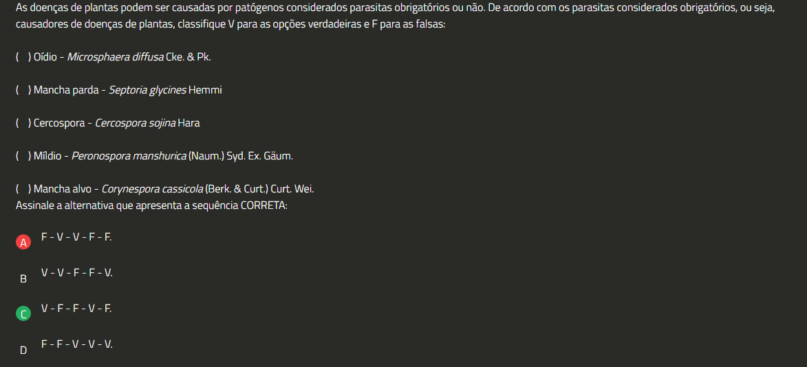 As doenças de plantas podem ser causadas por patógenos considerados parasitas obrigatórios ou não. De acordo com 05 parasitas considerados obrigatórios, ou seja, causadores de doenças de plantas, classifique V para as opções verdadeiras e F para as falsas: Oídio - Microsphaera diffusa Cke. & Pk. Mancha parda - Septoria glycines Hemmi ( ) Cercospora - Cercospora sojina Hara Míldio - Peronospora manshurica (Naum.) Syd. Ex. Gäum. Mancha alvo - Corynespora cassicola (Berk. & Curt.) Curt. Wei. Assinale a alternativa que apresenta a sequência CORRETA: F-V-V-F-F. A V-V-F-F-V. V-F-F-V-F. F-F-V-V-V. D