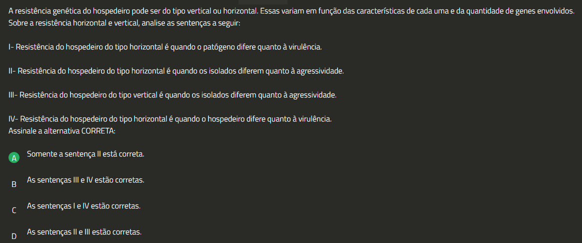 A resistência genética do hospedeiro pode ser do tipo vertical ou horizontal. Essas variam em função das características de cada uma e da quantidade de genes envolvidos. Sobre a resistência horizontal e vertical, analise as sentenças a seguir: I- Resistência do hospedeiro do tipo horizontal é quando 0 patógeno difere quanto à virulência. II- Resistência do hospedeiro do tipo horizontal é quando isolados diferem quanto à agressividade. III- Resistência do hospedeiro do tipo vertical é quando isolados diferem quanto à agressividade. IV- Resistência do hospedeiro do tipo horizontal é quando 0 hospedeiro difere quanto à virulência. Assinale a alternativa CORRETA: A Somente a sentença II está correta. B As sentenças III e IV estão corretas. As sentenças I e IV estão corretas. D As sentenças e III estão corretas.