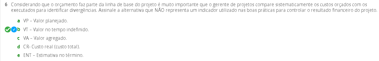 6 Considerando que 0 orçamento faz parte da linha de base do projeto é muito importante que 0 gerente de projetos compare sistematicamente os custos orçados com os executados para identificar divergências. Assinale a alternativa que NÃO representa um indicador utilizado nas boas práticas para controlar 0 resultado financeiro do projeto. a VP - Valor planejado. b VI Valor no tempo VA - Valor agregado. CR- Custo real (custo total). e ENT - Estimativa no término.