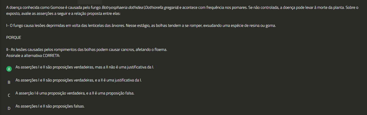 A doença conhecida como Gomose é causada pelo fungo Botryosphaeria dothidea (Dothiorella gregaria) e acontece com frequência nos pomares. Se não controlada, a doença pode levar à morte da planta. Sobre 0 exposto, avalie as asserções a seguir ea relação proposta entre elas: fungo causa lesões deprimidas em volta das lenticelas das árvores. Nesse estágio, as bolhas tendem a se romper, exsudando uma espécie de resina ou goma. PORQUE II- As lesões causadas pelos rompimentos das bolhas podem causar cancros, afetando 0 floema. Assinale a alternativa CORRETA: A As asserções I e II são proposições verdadeiras, mas a II não é uma justificativa da As asserções le são proposições verdadeiras, e a é uma justificativa da I. A asserção lé uma proposição verdadeira, e a é uma proposição falsa. D As asserções I e II são proposições falsas.