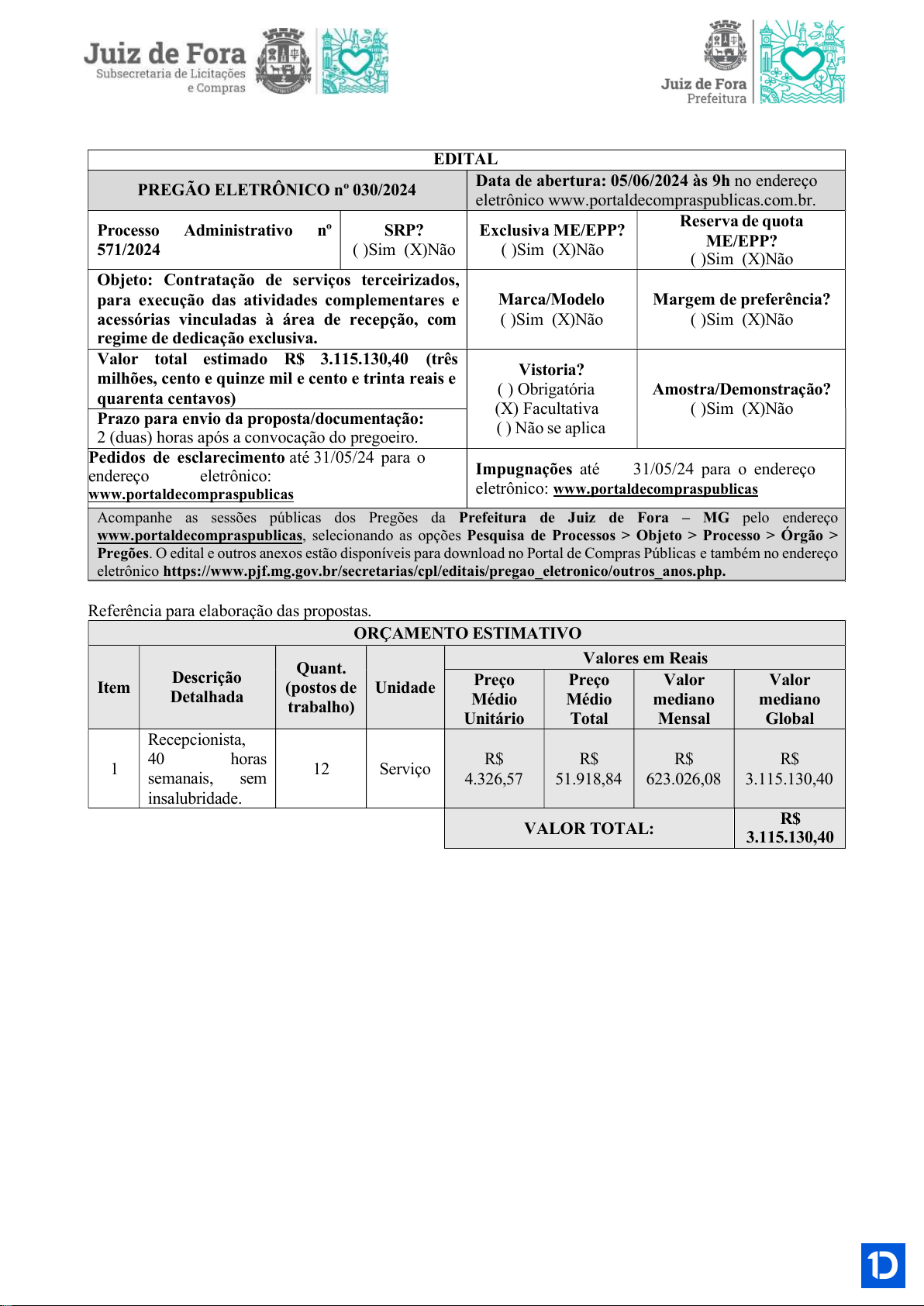 EDITAL PREGÃO ELETRÔNICO nº 030/2024 Data de abertura: 05/06/2024 às 9h no endereço eletrônico www.portaldecompraspublicas.com.br. Processo Administrativo nº 571/2024 SRP? ( )Sim (X)Não Exclusiva ME/EPP? ( )Sim (X)Não Reserva de quota ME/EPP? ( )Sim (X)Não Objeto: Contratação de serviços terceirizados, para execução das atividades complementares e acessórias vinculadas à área de recepção, com regime de dedicação exclusiva. Marca/Modelo ( )Sim (X)Não Margem de preferência? ( )Sim (X)Não Valor total estimado R$ 3.115.130,40 (três milhões, cento e quinze mil e cento e trinta reais e quarenta centavos) Vistoria? ( ) Obrigatória (X) Facultativa ( ) Não se aplica Amostra/Demonstração? ( )Sim (X)Não Prazo para envio da proposta/documentação: 2 (duas) horas após a convocação do pregoeiro. Pedidos de esclarecimento até 31/05/24 para o endereço eletrônico: www.portaldecompraspublicas Impugnações até 31/05/24 para o endereço eletrônico: www.portaldecompraspublicas Acompanhe as sessões públicas dos Pregões da Prefeitura de Juiz de Fora – MG pelo endereço www.portaldecompraspublicas, selecionando as opções Pesquisa de Processos > Objeto > Processo > Órgão > Pregões. O edital e outros anexos estão disponíveis para download no Portal de Compras Públicas e também no endereço eletrônico https://www.pjf.mg.gov.br/secretarias/cpl/editais/pregao_eletronico/outros_anos.php. Referência para elaboração das propostas. ORÇAMENTO ESTIMATIVO Item Descrição Detalhada Quant. (postos de trabalho) Unidade Valores em Reais Preço Médio Unitário Preço Médio Total Valor mediano Mensal Valor mediano Global 1 Recepcionista, 40 horas semanais, sem insalubridade. 12 Serviço R$ 4.326,57 R$ 51.918,84 R$ 623.026,08 R$ 3.115.130,40 VALOR TOTAL: R$ 3.115.130,40 A ss in ad o po r 1 pe ss oa : T A IN A H M O R E IR A M A R R A Z Z O D A C O S T A P ar a ve rif ic ar a v al id ad e da s as si na tu ra s, a ce ss e ht tp s: //j ui zd ef or a. 1d oc .c om .b r/ ve rif ic ac ao /E 00 2- 5B 2C -9 3A 4- C C 52 e in fo rm e o có di go E 00 2- 5B 2C -9 3A 4- C C 52 2 EDITAL PREGÃO ELETRÔNICO nº 030/2024 – PROCON/JF O Município de Juiz de Fora - MG, por meio da Agência de Proteção e Defesa do Consumidor de Juiz de Fora – PROCON/JF, torna público que fará realizar licitação, sob a modalidade de PREGÃO ELETRÔNICO, modo de disputa ABERTO, pelo critério de julgamento MENOR PREÇO GLOBAL para a prestação de serviços terceirizados, para execução das atividades complementares e acessórias vinculadas à área de recepção, com regime de dedicação exclusiva devidamente descritos, caracterizados e especificados no Termo de Referência, na forma da lei. A presente licitação se rege por toda a legislação aplicável à espécie, especialmente pelas normas de caráter geral da Lei Federal nº 14.133/2021, pela Lei Complementar Federal nº 123/2006, com as alterações promovidas pela Lei Complementar nº 147/2014, Lei Municipal nº 12.211/2011, Decreto Municipal nº 15.635/2022, Decreto Municipal nº 15.610/2022 e demais legislações aplicáveis, bem como pelos preceitos de Direito Público, pelas disposições deste Edital e de seus Anexos, normas que as licitantes declaram conhecer e a elas se sujeitarem incondicional e irrestritamente. A sessão pública do Pregão Eletrônico ocorrerá no dia 05/06/2024 às 09h00, horário de Brasília – DF, no endereço eletrônico www.portaldecompraspublicas.com.br. 1. DO OBJETO 1.1. O objeto da presente licitação é para a prestação de serviços terceirizados, para execução das atividades complementares e acessórias vinculadas à área de recepção, com regime de dedicação exclusiva, conforme as especificações constantes do Termo de Referência, Anexo I. 1.2. Integra este Edital, como se nele estivesse transcrito o Termo de Referência (Anexo I), assim como todas as especificações neste contidas. 1.3. A vencedora do certame irá fornecer a mão de obra especializada e todos os uniformes necessários para a prestação dos serviços previstos no contrato. 2. DOS RECURSOS ORÇAMENTÁRIOS 2.1. Os recursos necessários à aquisição do objeto ora licitado correrão à conta da seguinte dotação orçamentária nº: Programa de Trabalho: 14.122.0007.2004.1003 – Natureza da Despesa: 33.90.37.01 – Fonte de Recursos: 1759000000. 2.2. O valor total estimado para a licitação é de R$ 3.115.130,40 (três milhões, cento e quinze mil e cento e trinta reais e quarenta centavos), sendo R$ 51.918,84 (cinquenta e um mil e novecentos e dezoito reais e oitenta e quatro centavos) por mês e R$ 623.026,08 (seiscentos e vinte e três mil, vinte e seis reais e oito centavos) por ano. 3. DO CRITÉRIO DE JULGAMENTO 3.1. O critério de julgamento da presente licitação é o menor preço global. 4. DAS CONDIÇÕES DE PARTICIPAÇÃO 4.1. Para a participação nesta licitação é necessário que o interessado esteja credenciado regulamente junto ao Portal de Compras Públicas e Portal Nacional de Compras. A ss in ad o po r 1 pe ss oa : T A IN A H M O R E IR A M A R R A Z Z O D A C O S T A P ar a ve rif ic ar a v al id ad e da s as si na tu ra s, a ce ss e ht tp s: //j ui zd ef or a. 1d oc .c om .b r/ ve rif ic ac ao /E 00 2- 5B 2C -9 3A 4- C C 52 e in fo rm e o có di go E 00 2- 5B 2C -9 3A 4- C C 52 3 4.2. A licitante responde integralmente por todos os atos praticados no pregão eletrônico por seus representantes devidamente credenciados, assim como pela utilização da senha de acesso ao sistema, ainda que indevidamente, inclusive por pessoa não credenciada como sua representante. 4.3. Cada representante credenciado poderá representar apenas uma licitante, em cada pregão eletrônico. 4.4. O envio da proposta vinculará a licitante ao cumprimento de todas as condições e obrigações inerentes ao certame. 4.5. Não serão admitidas nesta licitação as empresas suspensas do direito de licitar, no prazo e n