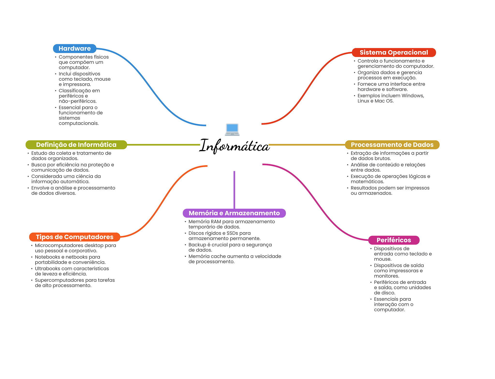 Hardware Sistema Operacional Componentes físicos que compõem um Controla O funcionamento e computador. gerenciamento do computador. Inclui dispositivos Organiza dados e gerencia como teclado, mouse processos em execução. e impressora. Fornece uma interface entre Classificação em hardware e software. periféricos e Exemplos incluem Windows, não-periféricos. Linux e Mac OS. Essencial para funcionamento de sistemas computacionais. Definição de Informática Informática Processamento de Dados Estudo da coleta e tratamento de Extração de informações a partir dados organizados. de dados brutos. Busca por eficiência na proteção e Análise de conteúdo e relações comunicação de dados. entre dados. Considerada uma ciência da Execução de operações lógicas e informação automática. matemáticas. Envolve a análise e processamento Resultados podem ser impressos de dados diversos. ou armazenados. Memória e Armazenamento Memória RAM para armazenamento temporário de dados. Discos rígidos e SSDs para Tipos de Computadores armazenamento permanente. Periféricos Microcomputadores desktop para Backup é crucial para a segurança uso pessoal e corporativo. de dados. Dispositivos de entrada como teclado e Notebooks e netbooks para Memória cache aumenta a velocidade mouse. portabilidade e conveniência. de processamento. Dispositivos de saída Ultrabooks com características como impressoras e de leveza e eficiência. monitores. Supercomputadores para tarefas Periféricos de entrada de alto processamento. e saída, como unidades de disco. Essenciais para interação com O computador.