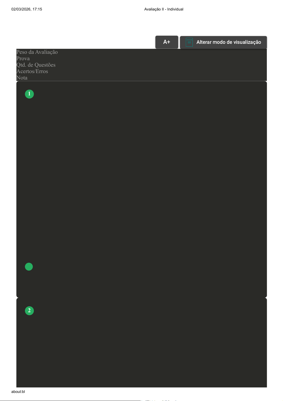 Prova Impressa GABARITO | Avaliação II - Individual (Cod.:1600933) Peso da Avaliação 1,50 Prova 114537075 Qtd. de Questões 10 Acertos/Erros 8/2 Nota 8,00 Durante o tratamento de uma doença podem ocorrer falhas na terapia medicamentosa devido a erros durante o processo de prescrição, dispensação e administração dos medicamentos. A ausência de informações importantes, prescrições ilegíveis, polifarmácia e interação medicamentosa contribuem para a ocorrência de falhas durante esse processo, que pode resultar em graves danos e ser capaz de levar até a morte do paciente. Fonte: SANTOS, P. R. A. et al. Ações para segurança na prescrição, uso e administração de medicamentos em unidades de pronto atendimento. Revista Gaúcha de Enfermagem, v. 40, 2019. Disponível em: https://bityli.com/ygbbKILe. Acesso em: 11 jul. 2024. Sobre a prescrição de um medicamento, analise as afirmativas a seguir: I. O paciente tem um papel fundamental no momento da prescrição, transmitindo ao profissional as queixas de saúde. II. Antes de prescrever um medicamento, o profissional precisa, primeiramente, identificar o problema, definir o objetivo terapêutico e escolher o tratamento. III. A prescrição deve ser feita de forma clara, compreensível e detalhada, a fim de evitar erros no momento da dispensação do medicamento e o uso pelo paciente. IV. A prescrição é um documento que orienta o uso de um medicamento para o paciente, definida com base em um plano terapêutico, visando ao prognóstico e à qualidade de vida. É correto o que se afirma em: A II e IV, apenas. B III e IV, apenas. C I, apenas. D I, II, III e IV. E I, II e III, apenas. Considere o seguinte caso: Uma paciente do sexo feminino, 70 anos, fazia uso diariamente dos seguintes fármacos: sinvastatina (200 mg/dia) para a dislipidemia; hidroclorotiazida (25 mg) e enalapril (20 mg/dia) para a hipertensão arterial; metformina (850 mg/dia) para a diabetes mellitus e metotrexato (17,5 mg/dia) para a artrite reumatoide. Além disso, fazia uso de omeprazol e dipirona, e tomava chá com ervas medicinais diariamente. Sobre os medicamentos tomados pela paciente, assinale a alternativa correta: A O uso das substâncias medicinais não interfere nos fármacos utilizados. B A paciente faz uso racional de medicamentos, sendo necessário o uso de diversos fármacos para o tratamento. VOLTAR A+Aumentar, FonteAlterar modo de visualização 1 2 02/03/2026, 17:15 Avaliação II - Individual about:blank 1/6 C Os diversos medicamentos utilizados pela paciente representam uma falha na adesão à farmacoterapia. D Ao se automedicar, a paciente aumenta a possibilidade de interação medicamentosa. E A polifarmácia é evitável na paciente, considerando as doenças-base. A Política Nacional de Medicamentos (PNM), aprovada em 1998, tem como objetivo garantir o acesso aos medicamentos à população, assegurando a disponibilidade de produtos considerados essenciais, seguros, eficazes e de qualidade, além de promover o uso racional de medicamentos. Fonte: BRASIL. Ministério da Saúde. Política Nacional de Medicamentos 2001. Brasília: Ministério da Saúde, 2001. Sobre a Política Nacional de Medicamentos, analise as afirmativas a seguir: I. Faz parte dos esforços voltados à consolidação do Sistema Único de Saúde. II. Abrange todo o setor de saúde e garante uma melhor qualidade de vida da população. III. Integra a Assistência Farmacêutica, priorizando os medicamentos necessários à atenção básica. É correto o que se afirma em: A I, II e III. B I e II, apenas. C I, apenas. D II e III, apenas. E III, apenas. Um indivíduo pode fazer uso de um medicamento sem a supervisão ou prescrição de um farmacêutico, sendo esse ato conhecido como automedicação. Essa prática, considerada muito comum na sociedade, também provoca uma grande preocupação, pois a automedicação pode ocasionar consequências graves à saúde, como as intoxicações medicamentosas devido aos processos farmacocinéticos e interações com medicamentos e alimentos. Fonte: XAVIER, M. S. et al. Automedicação e o risco à saúde: uma revisão de literatura. Brazilian Journal of Health Review, v. 4, n. 1, p. 225-240, 2021. Disponível em: https://bityli.com/khwfgRhm. Acesso em: 11 jul. 2024. Sobre o exposto, avalie as asserções a seguir e a relação proposta entre elas: I. Apesar dos riscos de intoxicação medicamentosa, a automedicação é considerada uma prática de uso racional de medicamentos. PORQUE II. A prática apresenta uma grande importância, pois ajuda a não sobrecarregar o sistema de saúde. A respeito dessas asserções, assinale a opção correta: A As asserções I e II são verdadeiras, e a II é uma justificativa correta da I. B As asserções I e II são verdadeiras, mas a II não é uma justificativa correta da I. C A asserção I é uma proposição falsa e a II é uma proposição verdadeira. 3 4 02/03/2026, 17:15 Avaliação II - Individual about:blank 2/6 D As asserções I e II são falsas. E A asserção I é uma proposição verdadeira e a II é uma proposição falsa. As etapas da assistência farmacêutica são de grande importância, sendo a seleção de medicamentos a primeira delas. O processo de seleção de medicamentos deve ser fundamentado em critérios técnico- científicos e baseado em processos de busca de evidências de eficácia, segurança, conveniência para o paciente, qualidade e custo favorável. Fonte: BRASIL. Conselho Nacional de Secretários de Saúde. Assistência Farmacêutica no SUS / Conselho Nacional de Secretários de Saúde. – Brasília : CONASS, 2007. Sobre a seleção de medicamentos, analise as afirmativas a seguir: I. A seleção estabelece a lista de medicamentos que serão disponibilizados no serviço de saúde. II. A seleção é a etapa fundamental e mais importante do ciclo, pois é o gatilho para o seu desenvolvimento. III. A seleção propicia ganhos terapêuticos e econômicos 