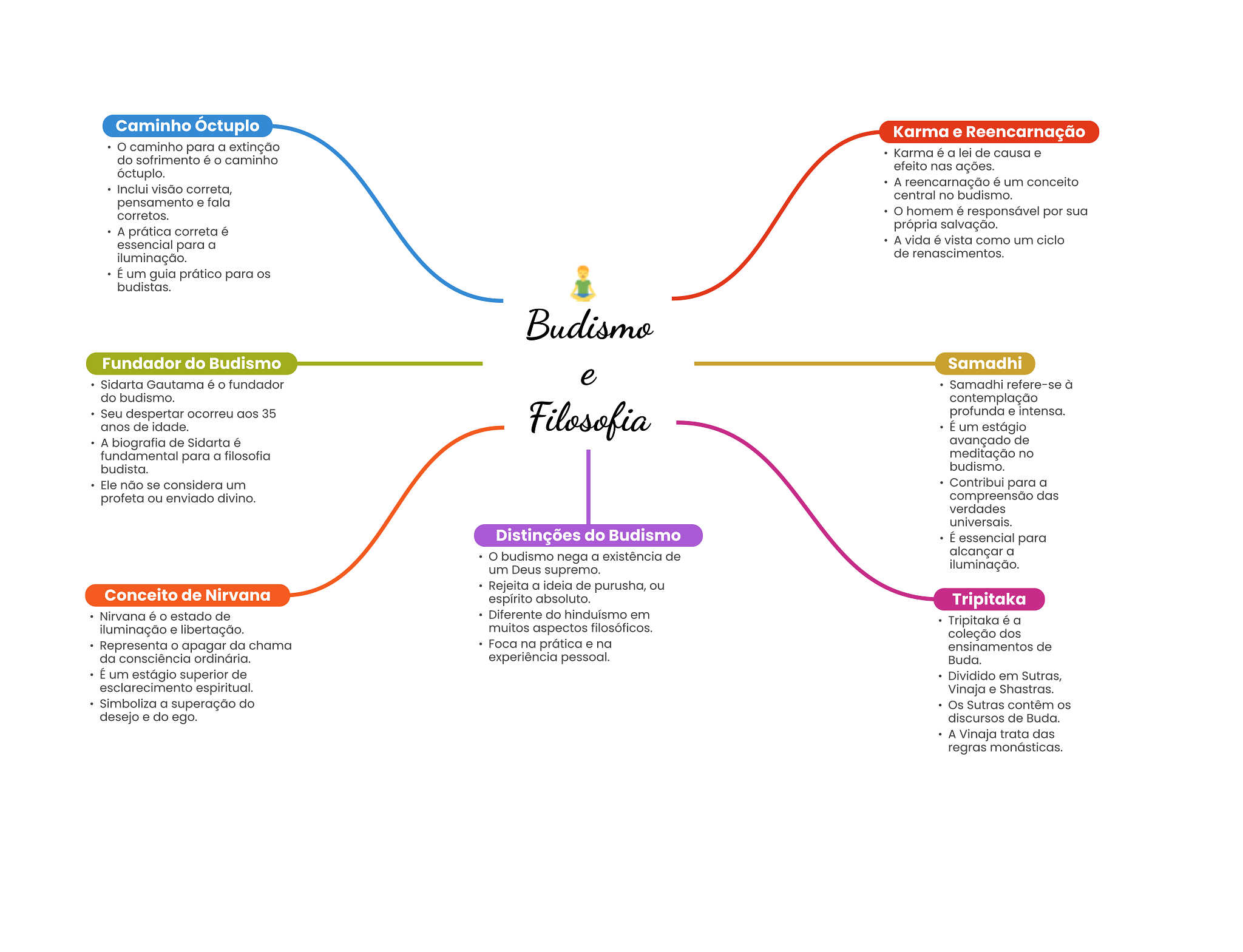 Caminho Óctuplo Karma e Reencarnação caminho para a extinção Karma é a lei de causa e do sofrimento é caminho óctuplo. efeito nas ações. A reencarnação é um conceito Inclui visão correta, central no budismo. pensamento e fala corretos. homem é responsável por sua A prática correta é própria salvação. essencial para a A vida é vista como um ciclo iluminação. de renascimentos. É um guia prático para OS budistas. Budismo Fundador do Budismo Samadhi Sidarta Gautama é O fundador e Samadhi refere-se à do budismo. contemplação Seu despertar ocorreu aos 35 Filosofia profunda e intensa. anos de idade. É um estágio A biografia de Sidarta é avançado de fundamental para a filosofia meditação no budista. budismo. Ele não se considera um Contribui para a profeta ou enviado divino. compreensão das verdades universais. Distinções do Budismo É essencial para budismo nega a existência de alcançar a um Deus supremo. iluminação. Rejeita a ideia de purusha, ou Conceito de Nirvana espírito absoluto. Tripitaka Nirvana é estado de Diferente do hinduísmo em Tripitaka é a iluminação e libertação. muitos aspectos filosóficos. coleção dos Representa apagar da chama Foca na prática e na ensinamentos de da consciência ordinária. experiência pessoal. Buda. É um estágio superior de Dividido em Sutras, esclarecimento espiritual. Vinaja e Shastras. Simboliza a superação do Os Sutras contêm desejo e do ego. discursos de Buda. A Vinaja trata das regras monásticas.