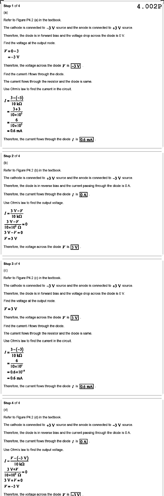 Step of 4 4.002P (a) Refer to Figure P4.2 (a) in the textbook. The cathode is connected to -3 V source and the anode is connected to +3 V source. Therefore, the diode is in forward bias and the voltage drop across the diode is 0 V. Find the voltage at the output node. =-3V Therefore, the voltage across the diode V is -3V Find the current / flows through the diode. The current flows through the resistor and the diode is same. Use Ohm's law to find the current in the circuit. I = 3-(-3) 3+3 = 6 = Therefore, the current flows through the diode is Step of 4 (b) Refer to Figure P4.2 (b) in the textbook. The cathode is connected to +3 V source and the anode is connected to -3 V source. Therefore, the diode is in reverse bias and the current passing through the diode is 0 A. Therefore, the current flows through the diode I is Use Ohm's law to find the output voltage. 3V-V I = 10 kΩ 3V-V 0 Ω 3V-V=0 V=3V Therefore, the voltage across the diode V is 3V Step of 4 (c) Refer to Figure P4.2 (c) in the textbook. The cathode is connected to -3 V source and the anode is connected to +3 V source. Therefore, the diode is in forward bias and the voltage drop across the diode is 0 V. Find the voltage at the output node. V=3V Therefore, the voltage across the diode V is 3V Find the current / flows through the diode. The current flows through the resistor and the diode is same. Use Ohm's law to find the current in the circuit. = 3-(-3) 6 = = 0.6 mA Therefore, the current flows through the diode is 0.6 mA Step of 4 (d) Refer to Figure P4.2 (d) in the textbook. The cathode is connected to +3 V source and the anode is connected to -3 V source. Therefore, the diode is in reverse bias and the current passing through the diode is 0 A. Therefore, the current flows through the diode is Use Ohm's law to find the output voltage. I = V-(-3V) 10 kΩ 3 V+V 0 Ω 3 V+V=0 Therefore, the voltage across the diode V is