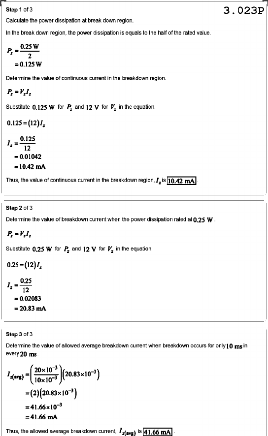 Step 1 of 3 3.023P Calculate the power dissipation at break down region. In the break down region, the power dissipation is equals to the half of the rated value. = 0.125 W Determine the value of continuous current in the breakdown region. Substitute 0.125 W for and 12 V for V₂ in the equation. =0.01042 = 10.42 mA Thus, the value of continuous current in the breakdown region, is 10.42 mA Step 2 of 3 Determine the value of breakdown current when the power dissipation rated at 0.25 W. Substitute 0.25 W for and 12 V for in the equation. = = 20.83 mA Step 3 of 3 Determine the value of allowed average breakdown current when breakdown occurs for only 10 ms in every 20 = =41.66x10⁻³ Thus, the allowed average breakdown current, z(avg) is 41.66 mA