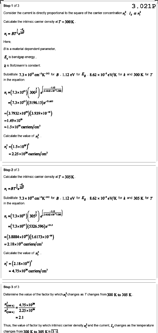 Step 1 of 3 3.021P Consider the current is directly proportional to the square of the carrier concentration Iₛ a Calculate the intrinsic carrier density at T = 300K Here, B is a material dependent parameter, is bandgap k is Boltzmann's constant. Substitute 7.3 for 1.12 eV for 1 8.62 10⁻⁵ eV/K for k and 300 K for T in the equation. = Calculate the value of Step 2 of 3 Calculate the intrinsic carrier density at T = Substitute for 1.12 eV for E₈ 1 8.62 10⁻⁵ eV/K for k and 305 K for T in the equation. =(3.8884x10*)(5.6173x10*) = Calculate the value of Step 3 of 3 Determine the value of the factor by which changes as T changes from 300 K to 305 K. =2.1 Thus, the value of factor by which intrinsic carrier density and the current, Iₛ changes as the temperature changes from 300 K to 305 K is 2.1