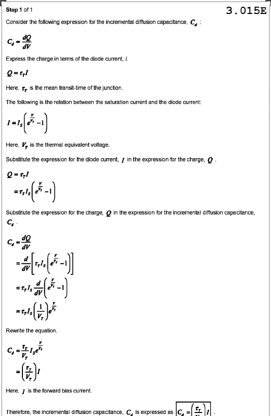 Step 1 of 1 3.015E Consider the following expression for the incremental diffusion capacitance, Express the charge in terms of the diode current, I. Here, is the mean transit-time of the junction. The following is the relation between the saturation current and the diode current: Here, is the thermal equivalent voltage. Substitute the expression for the diode current, I in the expression for the charge, . Substitute the expression for the charge, in the expression for the incremental diffusion capacitance, Rewrite the equation. Here, I is the forward bias current. Therefore, the incremental diffusion capacitance, is expressed as