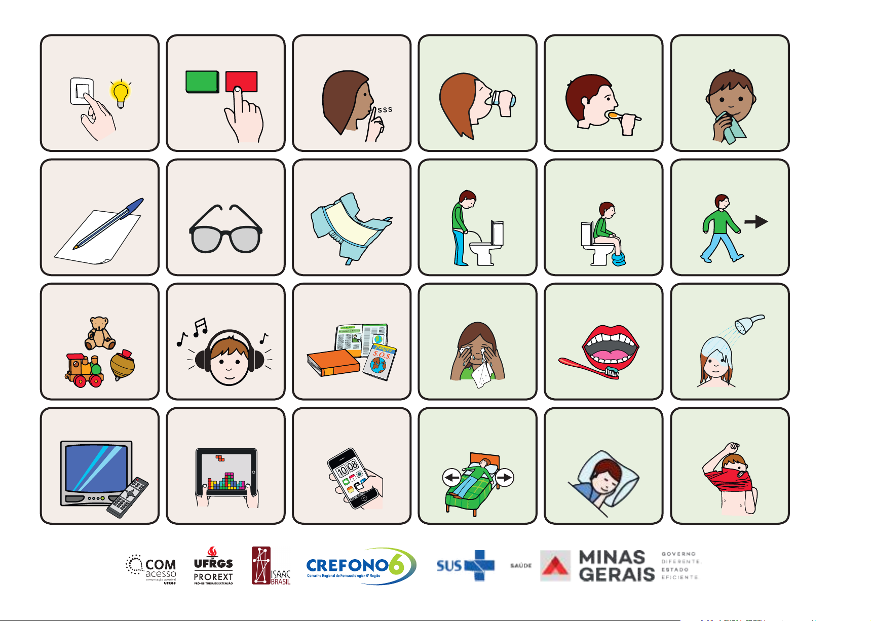 LAVAR ROSTO HIGIENE ORAL FAZER XIXI FAZER COCÔ IR/ANDAR DORMIRREPOSICIONAR NA CAMA CELULARTABLETTV COMERBEBERLUZ LIGA/DESLIGA SILÊNCIO FRALDA LIGA DESLIGA VESTIR BANHOLEITURAMÚSICABRINQUEDOS ÓCULOSÓCULOSPAPEL E CANETA UMEDECER BOCA PI C TO G R A M A S: S er gi o Pa la o - A RA SA AC (h tt p: // w w w .a ra sa ac .o rg /) L ic en ce : CC (B Y – N C- SA ) PR O JE TO : E du ar do C ar do so ; D ai an ne S er a� m M ar tin s | C O LA BO RA ÇÃ O : R ita B er sc h; M ic he lle B or ge s; A na B eu st d a Si lv a; M ar a Sa rt or et to ; R en at a Bo no tt o w w w .u fr gs .b r/ co m ac es so /p ra nc ha s- ca a- ho sp ita la r/ CALOR FRIO MEDO QUANTO TEMPO? COMO ESTOU? E DEPOIS? CHAMAR FAMÍLIACHAMAR MÉDICO CHAMAR ENFERMEIRA A E B C F G SOLETRARNÃO SEI PERGUNTAS DE SIM OU NÃO OBRIGADO AJUDA VISITA FAMÍLIA OUTRA COISAMAIS ROUPA MOLHADA REMÉDIOSOXIGÊNIO ASPIRAÇÃO SEGURA MINHA MÃO BEM MAL PI C TO G R A M A S: S er gi o Pa la o - A RA SA AC (h tt p: // w w w .a ra sa ac .o rg /) L ic en ce : CC (B Y – N C- SA ) PR O JE TO : E du ar do C ar do so ; D ai an ne S er a� m M ar tin s | C O LA BO RA ÇÃ O : R ita B er sc h; M ic he lle B or ge s; A na B eu st d a Si lv a; M ar a Sa rt or et to ; R en at a Bo no tt o w w w .u fr gs .b r/ co m ac es so /p ra nc ha s- ca a- ho sp ita la r/