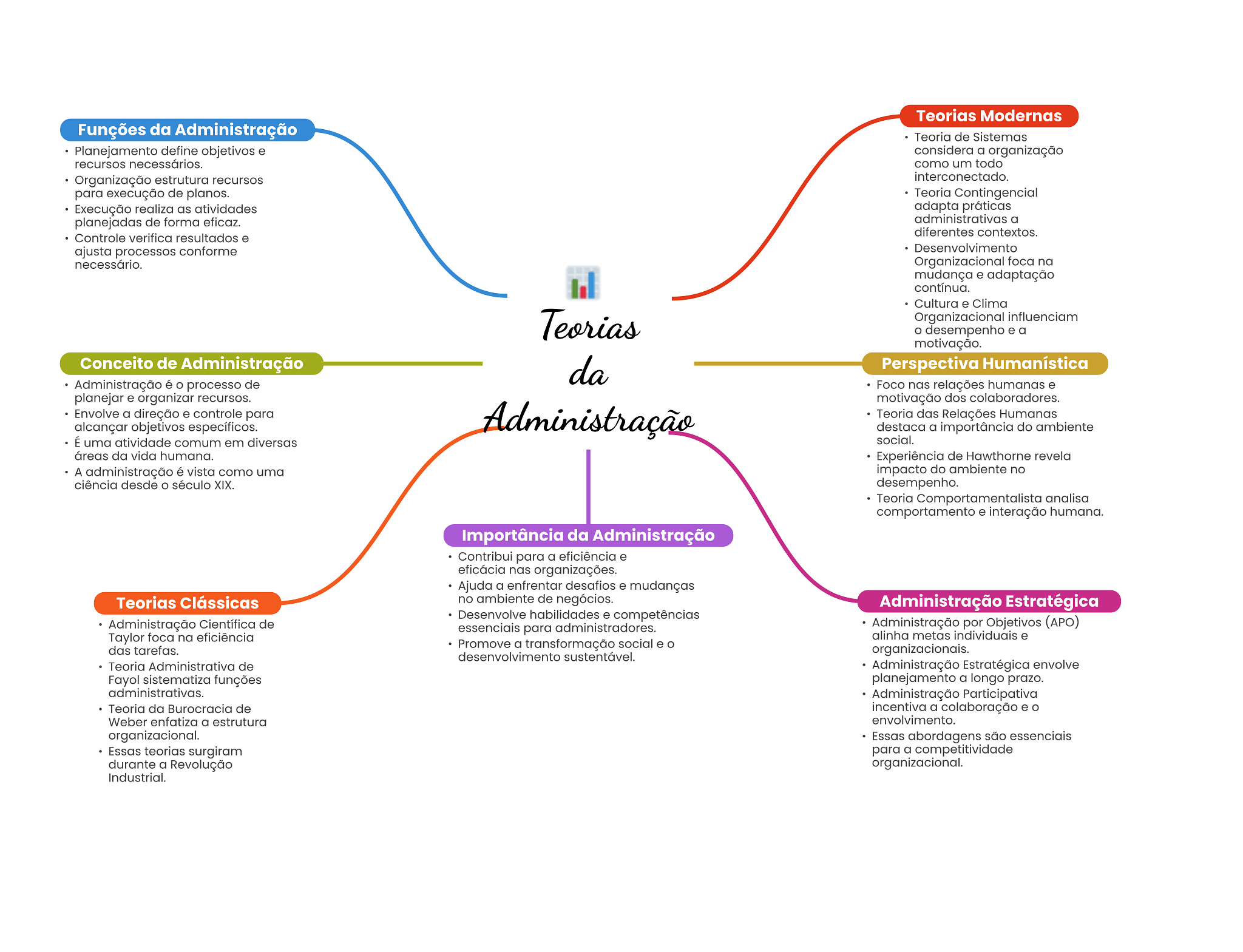 Teorias Modernas Funções da Administração Teoria de Sistemas Planejamento define objetivos e considera a organização recursos necessários. como um todo Organização estrutura recursos interconectado. para execução de planos. Teoria Contingencial Execução realiza as atividades adapta práticas planejadas de forma eficaz. administrativas a Controle verifica resultados e diferentes contextos. ajusta processos conforme Desenvolvimento necessário. Organizacional foca na mudança e adaptação contínua. Cultura e Clima Teorias Organizacional influenciam desempenho e a motivação. Conceito de Administração da Perspectiva Humanística Administração é processo de Foco nas relações humanas e planejar e organizar recursos. motivação dos colaboradores. Envolve a direção e controle para Administração Teoria das Relações Humanas alcançar objetivos específicos. destaca a importância do ambiente É uma atividade comum em diversas social. áreas da vida humana. Experiência de Hawthorne revela A administração é vista como uma impacto do ambiente no ciência desde século XIX. desempenho. Teoria Comportamentalista analisa comportamento e interação humana. Importância da Administração Contribui para a eficiência e eficácia nas organizações. Ajuda a enfrentar desafios e mudanças Teorias Clássicas no ambiente de negócios. Administração Estratégica Desenvolve habilidades e competências Administração Científica de essenciais para administradores. Administração por Objetivos (APO) Taylor foca na eficiência alinha metas individuais e das tarefas. Promove a transformação social e organizacionais. desenvolvimento sustentável. Teoria Administrativa de Administração Estratégica envolve Fayol sistematiza funções planejamento a longo prazo. administrativas. Administração Participativa Teoria da Burocracia de incentiva a colaboração e Weber enfatiza a estrutura envolvimento. organizacional. Essas abordagens são essenciais Essas teorias surgiram para a competitividade durante a Revolução organizacional. Industrial.