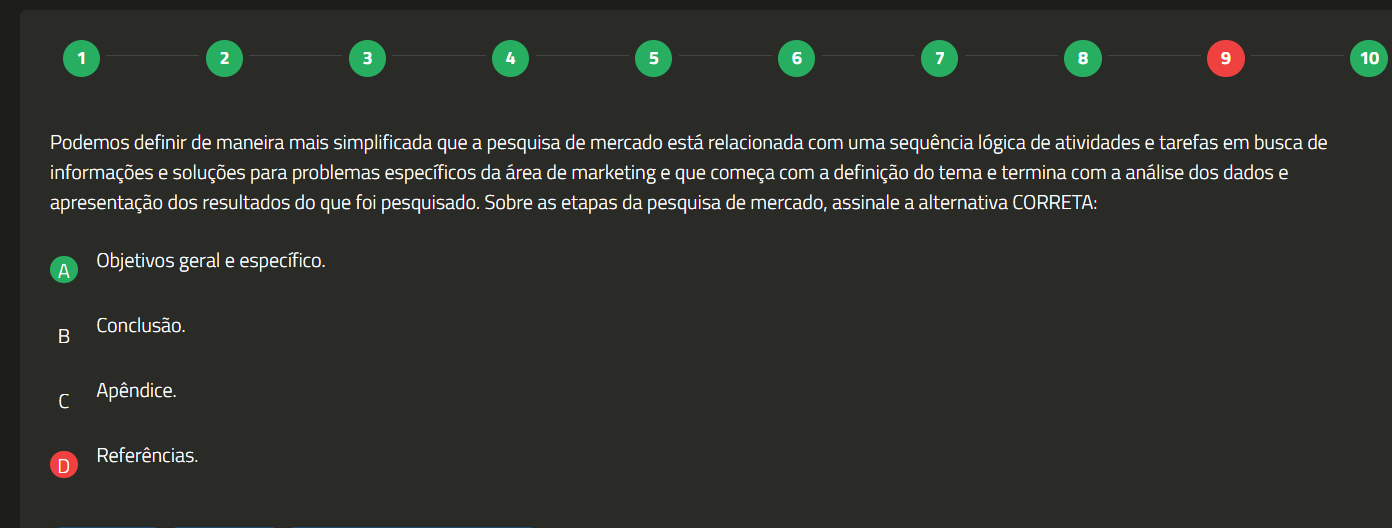 1 2 3 4 5 6 7 8 9 10 Podemos definir de maneira mais simplificada que a pesquisa de mercado está relacionada com uma sequência lógica de atividades e tarefas em busca de informações e soluções para problemas específicos da área de marketing e que começa com a definição do tema e termina com a análise dos dados e apresentação dos resultados do que foi pesquisado. Sobre as etapas da pesquisa de mercado, assinale a alternativa CORRETA: A Objetivos geral e específico. Conclusão. Apêndice. Referências. D