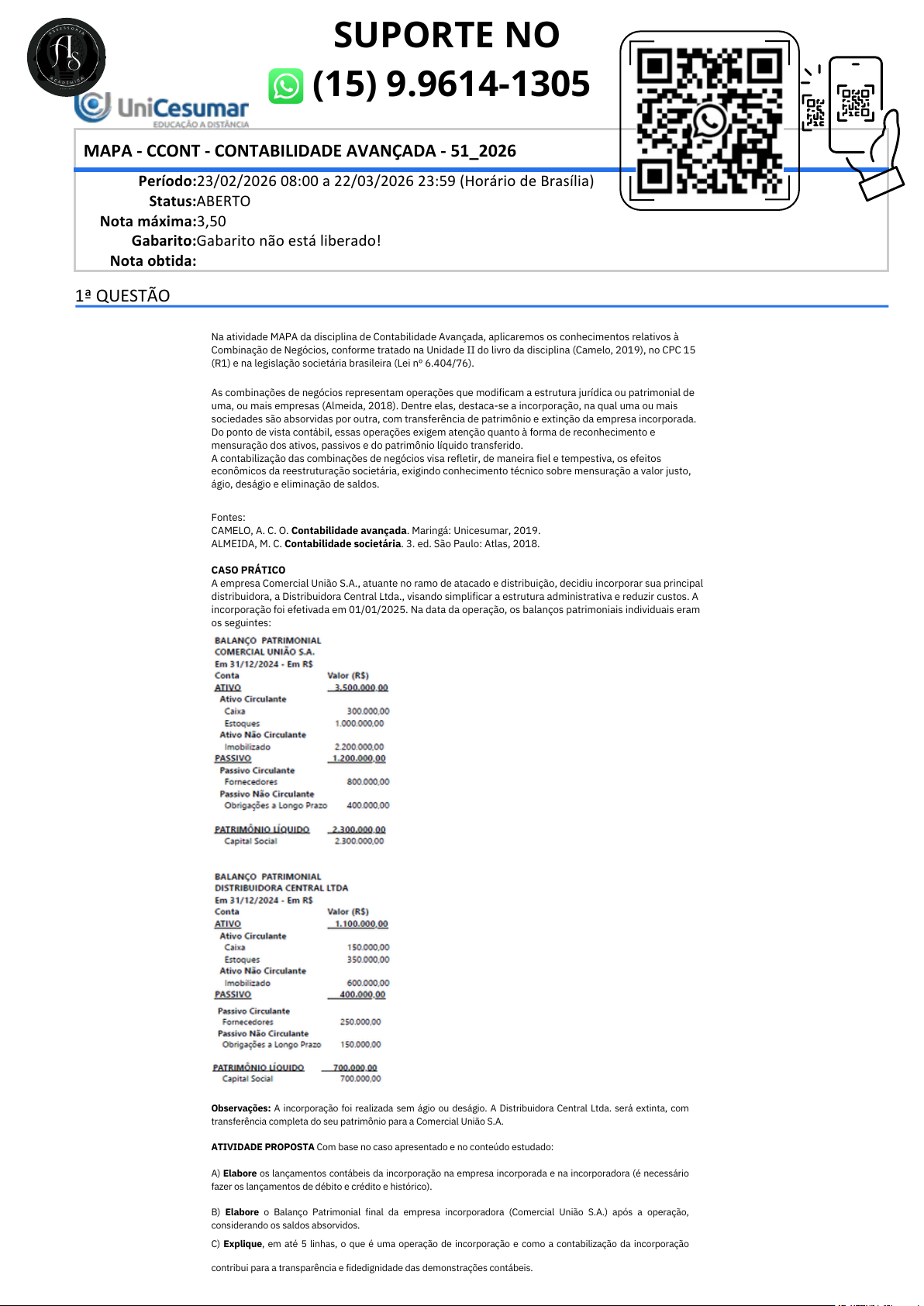1ª QUESTÃO MAPA - CCONT - CONTABILIDADE AVANÇADA - 51_2026 Período:23/02/2026 08:00 a 22/03/2026 23:59 (Horário de Brasília) Status:ABERTO Nota máxima:3,50 Gabarito:Gabarito não está liberado! Nota obtida: SUPORTE NO (15) 9.9614-1305 Na atividade MAPA da disciplina de Contabilidade Avançada, aplicaremos os conhecimentos relativos à Combinação de Negócios, conforme tratado na Unidade II do livro da disciplina (Camelo, 2019), no CPC 15 (R1) e na legislação societária brasileira (Lei nº 6.404/76). As combinações de negócios representam operações que modificam a estrutura jurídica ou patrimonial de uma, ou mais empresas (Almeida, 2018). Dentre elas, destaca-se a incorporação, na qual uma ou mais sociedades são absorvidas por outra, com transferência de patrimônio e extinção da empresa incorporada. Do ponto de vista contábil, essas operações exigem atenção quanto à forma de reconhecimento e mensuração dos ativos, passivos e do patrimônio líquido transferido. A contabilização das combinações de negócios visa refletir, de maneira fiel e tempestiva, os efeitos econômicos da reestruturação societária, exigindo conhecimento técnico sobre mensuração a valor justo, ágio, deságio e eliminação de saldos. Fontes: CAMELO, A. C. O. Contabilidade avançada. Maringá: Unicesumar, 2019. ALMEIDA, M. C. Contabilidade societária. 3. ed. São Paulo: Atlas, 2018. CASO PRÁTICO A empresa Comercial União S.A., atuante no ramo de atacado e distribuição, decidiu incorporar sua principal distribuidora, a Distribuidora Central Ltda., visando simplificar a estrutura administrativa e reduzir custos. A incorporação foi efetivada em 01/01/2025. Na data da operação, os balanços patrimoniais individuais eram os seguintes: Observações: A incorporação foi realizada sem ágio ou deságio. A Distribuidora Central Ltda. será extinta, com transferência completa do seu patrimônio para a Comercial União S.A. ATIVIDADE PROPOSTA Com base no caso apresentado e no conteúdo estudado: A) Elabore os lançamentos contábeis da incorporação na empresa incorporada e na incorporadora (é necessário fazer os lançamentos de débito e crédito e histórico). B) Elabore o Balanço Patrimonial final da empresa incorporadora (Comercial União S.A.) após a operação, considerando os saldos absorvidos. C) Explique, em até 5 linhas, o que é uma operação de incorporação e como a contabilização da incorporação contribui para a transparência e fidedignidade das demonstrações contábeis.