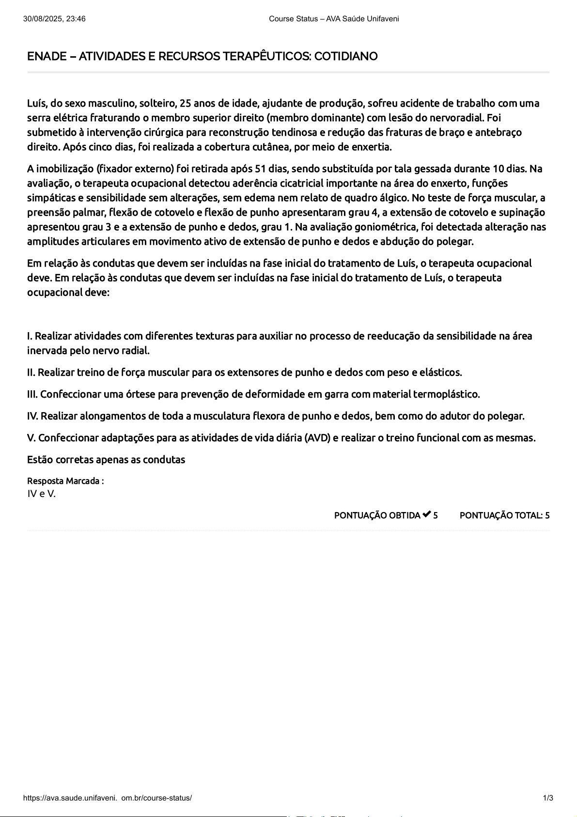 ENADE – ATIVIDADES E RECURSOS TERAPÊUTICOS: COTIDIANO PONTUAÇÃO TOTAL: 5PONTUAÇÃO OBTIDA 5 Luís, do sexo masculino, solteiro, 25 anos de idade, ajudante de produção, sofreu acidente de trabalho com uma serra elétrica fraturando o membro superior direito (membro dominante) com lesão do nervoradial. Foi submetido à intervenção cirúrgica para reconstrução tendinosa e redução das fraturas de braço e antebraço direito. Após cinco dias, foi realizada a cobertura cutânea, por meio de enxertia. A imobilização (fixador externo) foi retirada após 51 dias, sendo substituída por tala gessada durante 10 dias. Na avaliação, o terapeuta ocupacional detectou aderência cicatricial importante na área do enxerto, funções simpáticas e sensibilidade sem alterações, sem edema nem relato de quadro álgico. No teste de força muscular, a preensão palmar, flexão de cotovelo e flexão de punho apresentaram grau 4, a extensão de cotovelo e supinação apresentou grau 3 e a extensão de punho e dedos, grau 1. Na avaliação goniométrica, foi detectada alteração nas amplitudes articulares em movimento ativo de extensão de punho e dedos e abdução do polegar. Em relação às condutas que devem ser incluídas na fase inicial do tratamento de Luís, o terapeuta ocupacional deve. Em relação às condutas que devem ser incluídas na fase inicial do tratamento de Luís, o terapeuta ocupacional deve: I. Realizar atividades com diferentes texturas para auxiliar no processo de reeducação da sensibilidade na área inervada pelo nervo radial. II. Realizar treino de força muscular para os extensores de punho e dedos com peso e elásticos. III. Confeccionar uma órtese para prevenção de deformidade em garra com material termoplástico. IV. Realizar alongamentos de toda a musculatura flexora de punho e dedos, bem como do adutor do polegar. V. Confeccionar adaptações para as atividades de vida diária (AVD) e realizar o treino funcional com as mesmas. Estão corretas apenas as condutas Resposta Marcada : IV e V. 30/08/2025, 23:46 Course Status – AVA Saúde Unifaveni https://ava.saude.unifaveni.com.br/course-status/ 1/3 PONTUAÇÃO TOTAL: 5PONTUAÇÃO OBTIDA 5 Mauro, 18 anos de idade, estudante, foi atendido na unidade básica de saúde devido às queixas de queimaduras nas mãos e antebraços e dificuldades para realizar atividades que exigiam coordenação motora fina, o que comprometia sua rotina escolar. Seu problema foi diagnosticado como hanseníase e, posteriormente, foi encaminhado para a terapia ocupacional de um serviço-escola, onde foi realizada avaliação de sensibilidade e de força muscular, momento de conscientização e orientação para prevenção de incapacidades, conforme aponta o Programa Nacional de Controle da Hanseníase. Nessa situação, avalie a pertinência e a descrição dos procedimentos apresentados a seguir. I. Para a avaliação da sensibilidade e da força muscular, devem ser utilizados parâmetros individuais para cada um dos membros superiores, direito e esquerdo. II. Para avaliação da sensibilidade térmica, empregam-se tubos de ensaio com água quente, morna e fria e, para avaliação de dor, utiliza-se um alfinete tocando a pele com os dois extremos. III. Para avaliação da sensibilidade tátil, utiliza-se a ponta dos dedos ou uma borracha de lápis, para obter dados superficiais, e os monofilamentos de Semmes-Weinstein, para uma avaliação mais precisa. IV. Para avaliação da sensibilidade tátil, térmica e dolorosa, considera-se, além dos instrumentos pertinentes, a posição corporal, para evitar desvio de atenção e ansiedade, já que há necessidade de oclusão dos olhos durante sua realização. V. Para avaliação muscular da região correspondente ao nervo ulnar, examina-se o movimento de abdução do polegar e, para a avaliação da região do nervo mediano, o movimento de abdução do dedo mínimo. É correto apenas o que se afirma em: Resposta Marcada : II, III e IV. PONTUAÇÃO TOTAL: 5PONTUAÇÃO OBTIDA 5 Em uma maternidade pública da periferia de grande metrópole, a adolescente Anastácia, de 14 anos de idade, diabética insulino-dependente, deu à luz a Bruno, pesando 5,4 kg, de parto fórceps, a termo. O neonato apresentou desconforto respiratório imediato, sofreu fratura de clavícula direita associada à lesão do plexo braquial ipsolateral. Foi levado à UTI neonatal, pois necessitou de suporte ventilatório com entubação, sendo mantido na isolete. No mesmo dia, atendendo vao pedido de interconsulta da equipe multiprofissional, o médico ortopedista foi chamado à unidade de terapia intensiva neonatal e solicitou a pronta avaliação e conduta do terapeuta ocupacional. A maternidade onde nasceu Bruno se organiza com os pressupostos da linha do cuidado e com as diretrizes de atenção integral à saúde. Nessa situação, identifique a sequência de ações terapêuticas ocupacionais que devem ser seguidas no cuidado. I. Acolher a mãe, considerando os fatores contextuais e suas demandas na situação de internação. II. Orientar movimentação passiva e ativa para prevenir os danos articular e muscular. III. Utilizar atividades lúdicas para a estimulação do desenvolvimento neuropsicomotor IV. Orientar a mãe quanto aos cuidados, posicionamento e manuseio do bebê V. Identificar a necessidade de adaptações para a realização de cuidados ao bebê pela mãe. A opção que apresenta a ordenação correta é Resposta Marcada : I, IV, V, II e III. 30/08/2025, 23:46 Course Status – AVA Saúde Unifaveni https://ava.saude.unifaveni.com.br/course-status/ 2/3 20 / 20 PONTUAÇÃO TOTAL: 5PONTUAÇÃO OBTIDA 5 Carlos, 11 anos de idade, foi encaminhado pela escola para o serviço de Terapia Ocupacional com a queixa de que apresenta episódios de agressividade, sexualidade exacerbada, isolamento, dificuldade para realizar atividades que exijam leitura e (ou) raciocínio lógico e, ainda, reclamações de que os