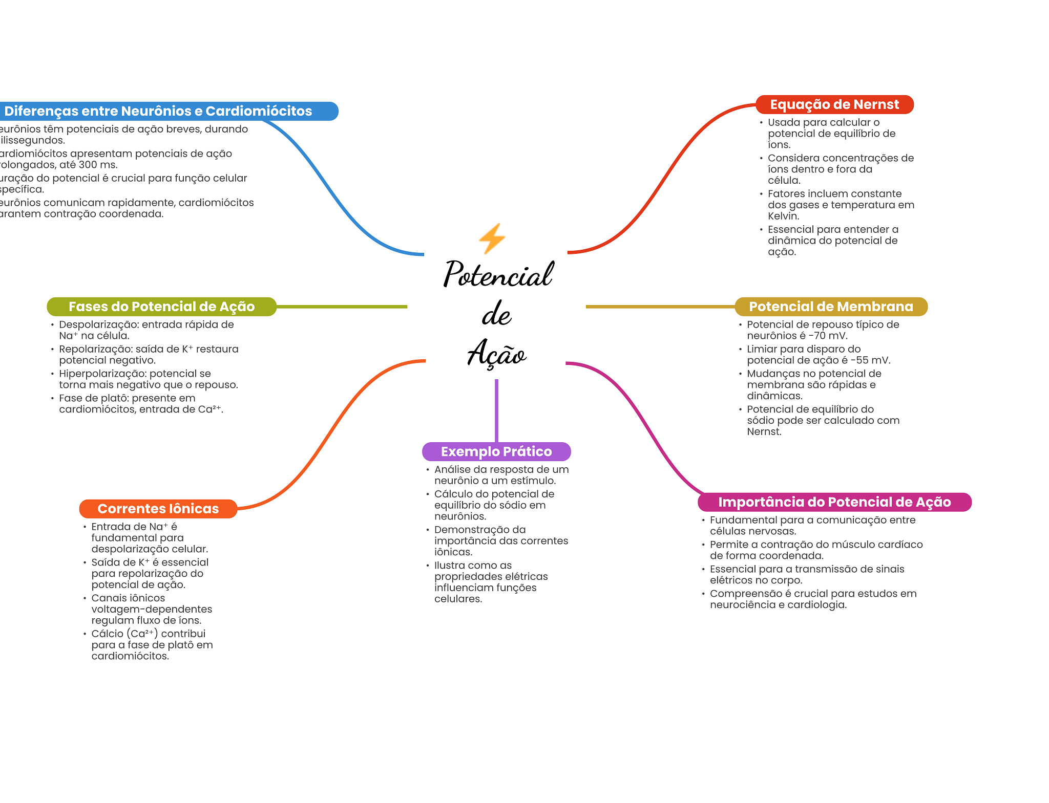 Diferenças entre Neurônios e Cardiomiócitos Equação de Nernst Usada para calcular eurônios têm potenciais de ação breves, durando potencial de equilíbrio de ilissegundos. íons. ardiomiócitos apresentam potenciais de ação Considera concentrações de olongados, até 300 ms. íons dentro e fora da uração do potencial é crucial para função celular célula. Fatores incluem constante eurônios comunicam rapidamente, cardiomiócitos dos gases e temperatura em arantem contração coordenada. Kelvin. Essencial para entender a dinâmica do potencial de ação. Potencial Fases do Potencial de Ação de Potencial de Membrana Despolarização: entrada rápida de Potencial de repouso típico de Na+ na célula. neurônios é -70 mV. Repolarização: saída de K+ restaura Ação Limiar para disparo do potencial negativo. potencial de ação é -55 mV. Hiperpolarização: potencial se Mudanças no potencial de torna mais negativo que repouso. membrana são rápidas e Fase de platô: presente em dinâmicas. cardiomiócitos, entrada de Potencial de equilíbrio do sódio pode ser calculado com Nernst. Exemplo Prático Análise da resposta de um neurônio a um estímulo. Cálculo do potencial de Correntes lônicas equilíbrio do sódio em Importância do Potencial de Ação neurônios. Entrada de Na+ é Fundamental para a comunicação entre Demonstração da células nervosas. fundamental para importância das correntes despolarização celular. Permite a contração do músculo cardíaco iônicas. de forma coordenada. Saída de K+ é essencial como as para repolarização do Essencial para a transmissão de sinais propriedades elétricas potencial de ação. elétricos no corpo. influenciam funções Canais iônicos celulares. Compreensão é crucial para estudos em neurociência e cardiologia. regulam fluxo de íons. Cálcio contribui para a fase de platô em cardiomiócitos.