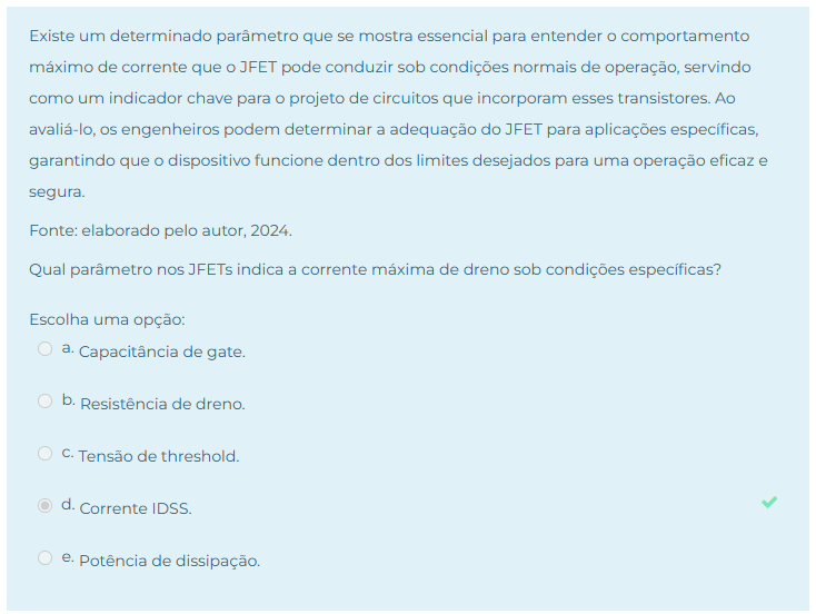 Existe um determinado parâmetro que se mostra essencial para entender O comportamento máximo de corrente que O JFET pode conduzir sob condições normais de operação, servindo como um indicador chave para O projeto de circuitos que incorporam esses transistores. Ao avaliá-lo, engenheiros podem determinar a adequação do JFET para aplicações específicas, garantindo que O dispositivo funcione dentro dos limites desejados para uma operação eficaz e segura. Fonte: elaborado pelo autor, 2024. Qual parâmetro nos JFETs indica a corrente máxima de dreno sob condições específicas? Escolha uma opção: a. Capacitância de gate. b. Resistência de dreno. C. Tensão de threshold. d. Corrente IDSS. e. Potência de dissipação.