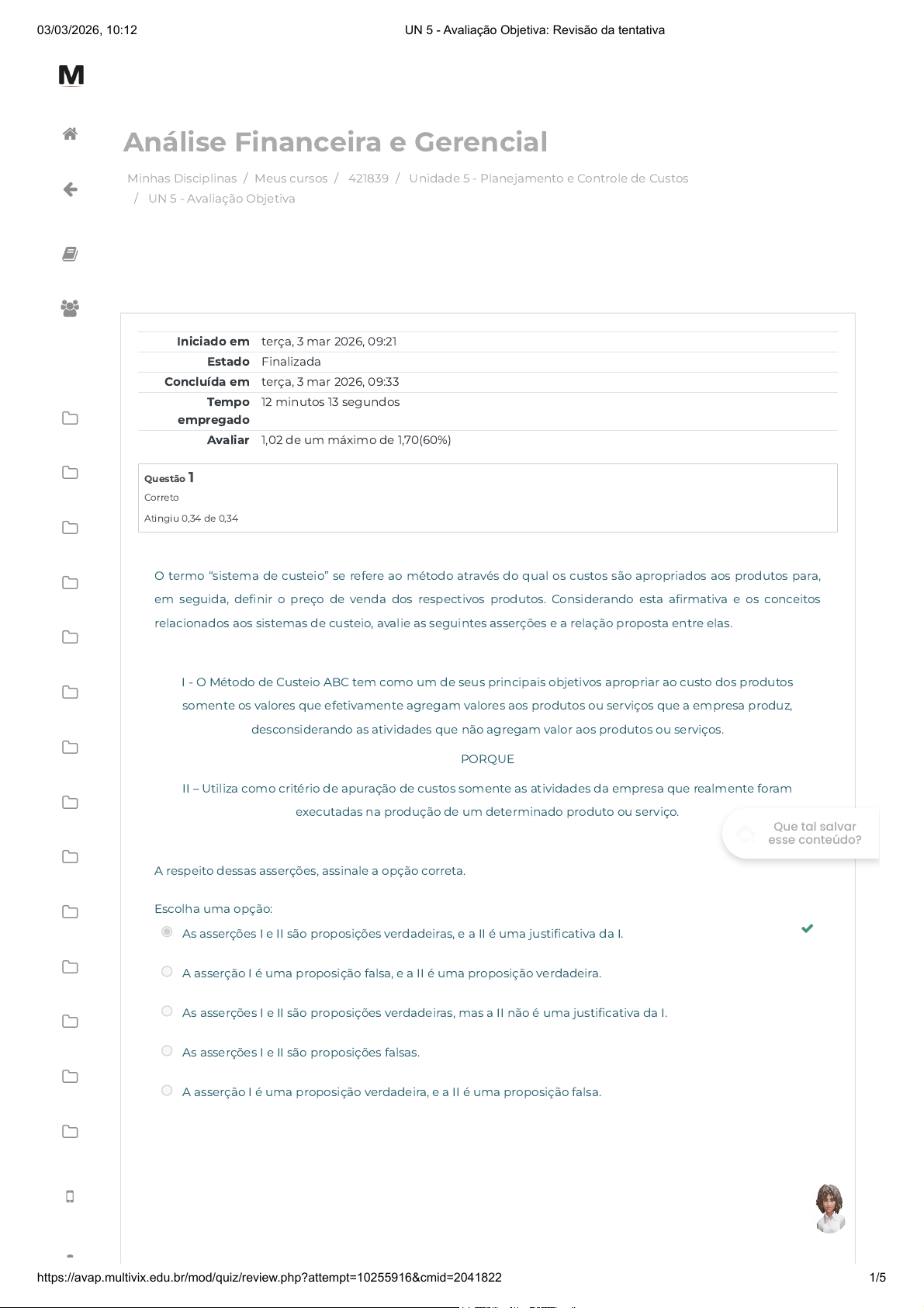 Minhas Disciplinas / Meus cursos / 421839 / Unidade 5 - Planejamento e Controle de Custos / UN 5 - Avaliação Objetiva Análise Financeira e Gerencial Iniciado em terça, 3 mar 2026, 09:21 Estado Finalizada Concluída em terça, 3 mar 2026, 09:33 Tempo empregado 12 minutos 13 segundos Avaliar 1,02 de um máximo de 1,70(60%) Questão 1 Correto Atingiu 0,34 de 0,34 O termo “sistema de custeio” se refere ao método através do qual os custos são apropriados aos produtos para, em seguida, definir o preço de venda dos respectivos produtos. Considerando esta afirmativa e os conceitos relacionados aos sistemas de custeio, avalie as seguintes asserções e a relação proposta entre elas. I - O Método de Custeio ABC tem como um de seus principais objetivos apropriar ao custo dos produtos somente os valores que efetivamente agregam valores aos produtos ou serviços que a empresa produz, desconsiderando as atividades que não agregam valor aos produtos ou serviços. PORQUE II – Utiliza como critério de apuração de custos somente as atividades da empresa que realmente foram executadas na produção de um determinado produto ou serviço. A respeito dessas asserções, assinale a opção correta. Escolha uma opção: As asserções I e II são proposições verdadeiras, e a II é uma justificativa da I. A asserção I é uma proposição falsa, e a II é uma proposição verdadeira. As asserções I e II são proposições verdadeiras, mas a II não é uma justificativa da I. As asserções I e II são proposições falsas. A asserção I é uma proposição verdadeira, e a II é uma proposição falsa. Que tal salvar esse conteúdo? 03/03/2026, 10:12 UN 5 - Avaliação Objetiva: Revisão da tentativa https://avap.multivix.edu.br/mod/quiz/review.php?attempt=10255916&cmid=2041822 1/5 https://avap.multivix.edu.br/my/ https://avap.multivix.edu.br/course/view.php?id=38635 https://avap.multivix.edu.br/course/view.php?id=38635§ion=6 https://avap.multivix.edu.br/mod/quiz/view.php?id=2041822 https://avap.multivix.edu.br/my/ https://avap.multivix.edu.br/course/view.php?id=38635 https://avap.multivix.edu.br/user/index.php?id=38635 https://avap.multivix.edu.br/course/view.php?id=38635§ion=1 https://avap.multivix.edu.br/course/view.php?id=38635§ion=2 https://avap.multivix.edu.br/course/view.php?id=38635§ion=3 https://avap.multivix.edu.br/course/view.php?id=38635§ion=4 https://avap.multivix.edu.br/course/view.php?id=38635§ion=5 https://avap.multivix.edu.br/course/view.php?id=38635§ion=6 https://avap.multivix.edu.br/course/view.php?id=38635§ion=7 https://avap.multivix.edu.br/course/view.php?id=38635§ion=8 https://avap.multivix.edu.br/course/view.php?id=38635§ion=9 https://avap.multivix.edu.br/course/view.php?id=38635§ion=10 https://avap.multivix.edu.br/course/view.php?id=38635§ion=11 https://avap.multivix.edu.br/course/view.php?id=38635§ion=12 https://avap.multivix.edu.br/course/view.php?id=38635§ion=13 https://avap.multivix.edu.br/course/view.php?id=38635§ion=14 https://avap.multivix.edu.br/hooks/portal/ https://avap.multivix.edu.br/mod/page/view.php?id=1252%2F%22%20target%3D%22_blank https://avap.multivix.edu.br/ https://avap.multivix.edu.br/ https://avap.multivix.edu.br/ https://avap.multivix.edu.br/ https://avap.multivix.edu.br/ https://avap.multivix.edu.br/ Questão 2 Correto Atingiu 0,34 de 0,34 Após a apuração do custo que realmente incorreu (Custo Real) na produção da empresa em determinado mês, o gestor poderá comparar este custo com o Custo Padrão, no sentido de verificar a eficiência das operações da empresa. Tendo como base os conceitos relacionados ao Custo-Padrão, analise os dados da tabela apresentada a seguir: Empresa Exemplo - Comparativo Custo Padrão x Custo Real - Mês 03 Produto Custo Padrão Custo Real Variação MOD MD CIF´s Custo Unit. MOD MD CIF´s Custo Unit. Valor % Produto Grey 39,00 64,00 20,00 123,00 35,10 65,00 19,50 119,60 -3,40 -2,8% Produto White 40,00 76,00 20,00 136,00 46,20 75,50 21,00 142,70 6,70 4,9% Produto Yelow 11,00 22,00 20,00 53,00 9,75 22,50 19,50 51,75 -1,25 -2,4% Fonte: Elaborado pelo autor. De acordo com as informações apresentadas no quadro acima, é correto afirmar que a análise comparativa entre Escolha uma opção: os valores unitários do Custo-Padrão e do Custo Real da Empresa Exemplo Ltda. indica que comportamento dos custos dos produtos Grey e Yelow foram favoráveis à empresa. os itens do Custo-Padrão e do Custo Real do Produto Grey indica que os itens Mão de Obra Direta e Materiais Diretos foram desfavoráveis à empresa. os itens do Custo-Padrão e do Custo Real do Produto White indica que os itens Mão de Obra Direta e Custos Indiretos de Fabricação foram favoráveis à empresa. os itens do Custo-Padrão e do Custo Real do Yelow indica que os itens Mão de Obra Direta, Materiais Diretos e Custos Indiretos de Fabricação foram desfavoráveis à empresa. os valores unitários do Custo-Padrão e do Custo Real da Empresa Exemplo Ltda. indica que comportamento do custo do produto White foi favorável à empresa. Que tal salvar esse conteúdo? 03/03/2026, 10:12 UN 5 - Avaliação Objetiva: Revisão da tentativa https://avap.multivix.edu.br/mod/quiz/review.php?attempt=10255916&cmid=2041822 2/5 https://avap.multivix.edu.br/my/ https://avap.multivix.edu.br/course/view.php?id=38635 https://avap.multivix.edu.br/user/index.php?id=38635 https://avap.multivix.edu.br/course/view.php?id=38635§ion=1 https://avap.multivix.edu.br/course/view.php?id=38635§ion=2 https://avap.multivix.edu.br/course/view.php?id=38635§ion=3 https://avap.multivix.edu.br/course/view.php?id=38635§ion=4 https://avap.multivix.edu.br/course/view.php?id=38635§ion=5 https://avap.multivix.edu.br/course/view.php?id=38635§ion=6 https://avap.multivix.edu.br/course/view.php?id=38635§ion=7 https://avap.multivix.edu.br/course/view.php?id=38635§ion=8 https://avap.multivix.edu.br/course/view.php?id=38635§ion=9 https://avap.multivix.edu.br/course/view.p