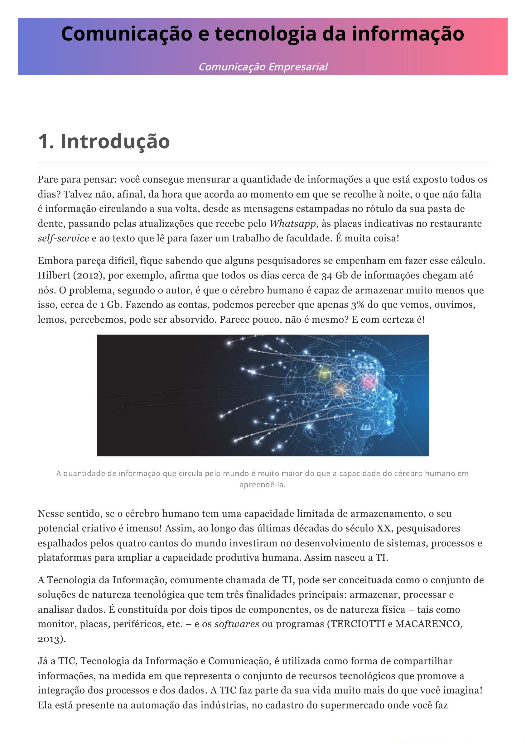 22/12/2021 09:01 Comunicação e tecnologia da informação https://cead.uvv.br/graduacao/conteudo.php?aula=comunicacao-e-tecnologia-da-informacao&dcp=comunicacao-empresarial&topico=4 1/24 Comunicação e tecnologia da informação Comunicação Empresarial 1. Introdução Pare para pensar: você consegue mensurar a quantidade de informações a que está exposto todos os dias? Talvez não, afinal, da hora que acorda ao momento em que se recolhe à noite, o que não falta é informação circulando a sua volta, desde as mensagens estampadas no rótulo da sua pasta de dente, passando pelas atualizações que recebe pelo Whatsapp, às placas indicativas no restaurante self-service e ao texto que lê para fazer um trabalho de faculdade. É muita coisa! Embora pareça difícil, fique sabendo que alguns pesquisadores se empenham em fazer esse cálculo. Hilbert (2012), por exemplo, afirma que todos os dias cerca de 34 Gb de informações chegam até nós. O problema, segundo o autor, é que o cérebro humano é capaz de armazenar muito menos que isso, cerca de 1 Gb. Fazendo as contas, podemos perceber que apenas 3% do que vemos, ouvimos, lemos, percebemos, pode ser absorvido. Parece pouco, não é mesmo? E com certeza é! Nesse sentido, se o cérebro humano tem uma capacidade limitada de armazenamento, o seu potencial criativo é imenso! Assim, ao longo das últimas décadas do século XX, pesquisadores espalhados pelos quatro cantos do mundo investiram no desenvolvimento de sistemas, processos e plataformas para ampliar a capacidade produtiva humana. Assim nasceu a TI. A Tecnologia da Informação, comumente chamada de TI, pode ser conceituada como o conjunto de soluções de natureza tecnológica que tem três finalidades principais: armazenar, processar e analisar dados. É constituída por dois tipos de componentes, os de natureza física – tais como monitor, placas, periféricos, etc. – e os softwares ou programas (TERCIOTTI e MACARENCO, 2013). Já a TIC, Tecnologia da Informação e Comunicação, é utilizada como forma de compartilhar informações, na medida em que representa o conjunto de recursos tecnológicos que promove a integração dos processos e dos dados. A TIC faz parte da sua vida muito mais do que você imagina! Ela está presente na automação das indústrias, no cadastro do supermercado onde você faz A quantidade de informação que circula pelo mundo é muito maior do que a capacidade do cérebro humano em apreendê-la. https://cead.uvv.br/conteudo/wp-content/uploads/2019/02/Sem-t%C3%ADtulo-1-5-768x281.jpg 22/12/2021 09:01 Comunicação e tecnologia da informação https://cead.uvv.br/graduacao/conteudo.php?aula=comunicacao-e-tecnologia-da-informacao&dcp=comunicacao-empresarial&topico=4 2/24 compras, nas transações digitais do Internet Banking e, até aqui, em nossa plataforma digital de estudos, claro. É a TIC que integra os sistemas que fazem a internet acontecer, gerando a rede mundial de computadores. O fato é que a revolução tecnológica digital, acelerada nos contextos militares americanos a partir dos anos de 1960, mudou o mundo e a forma como as pessoas se comunicam. Neto e Costa (2015) lembram que computadores, internet e intranet, e-mail, redes sociais e aparelhos de smartphones são símbolos e sínteses do processo. O impacto de tais mudanças pode ser sentido em todos os níveis da vida humana, criando o que Castells (1999) vai chamar de sociedade em rede. Você pode estar se perguntando por que estamos trazendo esse assunto para ser conteúdo de uma disciplina sobre comunicação empresarial e podemos já responder dizendo que a TIC revolucionou a comunicação, tanto considerando o âmbito interno (nosso assunto na lição passada) quanto o ambiente externo das organizações. A tecnologia trouxe diversos ganhos para as empresas – como maior armazenamento de informações, mais agilidade na resolução de problemas e gestão mais eficiente do conhecimento. Para a comunicação, os ganhos foram igualmente notáveis e, podemos destacar entre eles, a maior possibilidade de troca de experiências entre as equipes, através de um mais fácil compartilhamento de problemas, ideias e soluções. Nesse sentido, a TIC permitiu que, no âmbito interno, as equipes de um mesmo departamento estejam em comunicação mais direta (comunicação intradepartamental), assim como as equipes de departamentos diferentes (interdepartamental) e até aquelas que trabalham em unidades diferentes de uma mesma organização, com distância geográfica por vezes continental. Além disso, a informatização do banco de talentos permite acessar o perfil dos colaboradores e identificar com facilidade dados para alocação de recursos humanos e montagem de novas equipes. Não podemos nos esquecer das facilidades geradas para educação corporativa on-line (comunidades de aprendizagem virtual interna) e também para gestão do conhecimento. Você sabe o que é tecnologia? Estamos falando tanto de tecnologia nessa lição que é importante saber do que se trata. Ao contrário do que muitos pensam, tecnologia não significa, necessariamente, uso de computadores, softwares ou aplicativos de última geração. Tecnologia representa um modo inteligente de resolver um problema e que permanece em constante transformação. Nesse sentido, existem muitas coisas à sua volta que representam instrumentos tecnológicos, como o travesseiro antialérgico que você usa para dormir ou o shampoo biodegradável com que lava seus cabelos todos os dias. O desenvolvimento tecnológico é fruto da inteligência humana, ocorre desde o princípio da vida na Terra e passou por todas as épocas e contextos sociais. Se hoje muitos dos recursos tecnológicos partem de microchips cada vez menores e mais potentes, muitas das grandes invenções tecnológicas que garantiram nossa sobrevivência enquanto espécie partiram do domínio dos elementos da natureza. 22/12/2021 09:01 Comunicação e tecnologia da
