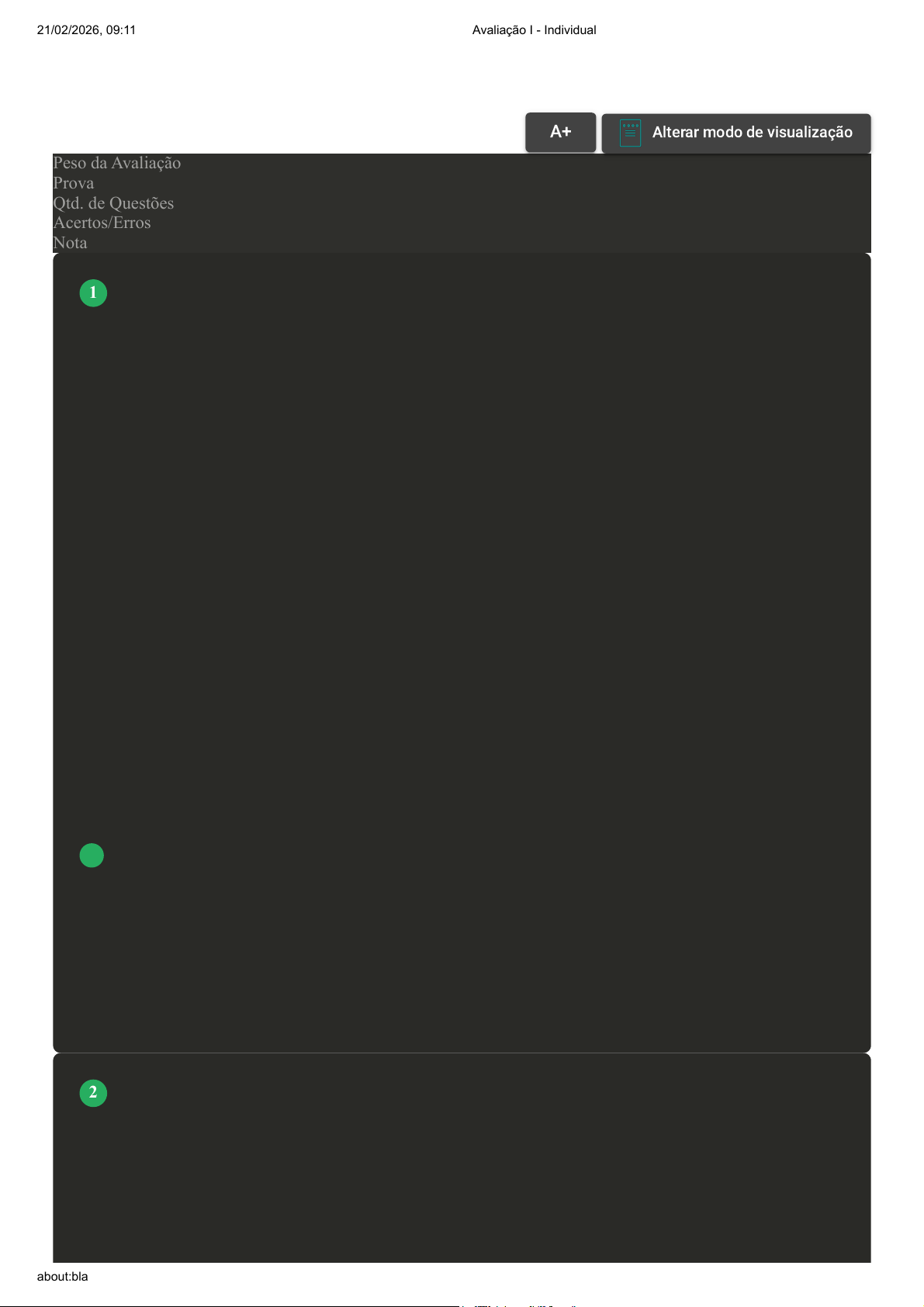 Prova Impressa GABARITO | Avaliação I - Individual (Cod.:1596992) Peso da Avaliação 1,50 Prova 113698935 Qtd. de Questões 10 Acertos/Erros 10/0 Nota 10,00 Um dos impasses que circundam a vida dos adolescentes e jovens é o de conciliar os estudos com o trabalho. Muitas vezes, a inserção precoce no mundo do trabalho, devido às necessidades de sobrevivência, impede que o projeto de vida seja direcionado, qualificado e consciente. Antes disso, já acontece o abandono escolar e o direito de aprender e de fazer escolhas é tolhido. Fonte: BRASIL. Ministério da Educação. Projeto de vida: ser ou existir? Base Nacional Comum Curricular. Disponível em: https://basenacionalcomum.mec.gov.br/implementacao/praticas/caderno-de- praticas/aprofundamentos/200-projeto-de-vida-ser-ou-existir. Acesso em: 18 jun. 2025. Sobre a necessidade de se trabalhar muito jovem, analise qual afirmativa aponta para como isso dificulta no processo de se estabelecer um projeto de vida: I. O trabalho precoce enfraquece o projeto de vida. II. A necessidade de sustento limita o projeto de vida do jovem. III. As responsabilidades assumidas muito cedo dificultam o desenvolvimento do projeto de vida com base no aprendizado. IV. Os obstáculos enfrentados por quem precisa trabalhar desde cedo comprometem o direito de aprender e inviabilizam um projeto de vida orientado, qualificado e consciente. É correto o que se afirma em: A III e IV, apenas. B I, apenas. C I, II, III e IV. D I, II e III, apenas. E II e IV, apenas. Ao idealizarmos nosso estado desejado, é essencial avaliar com atenção a dimensão e a complexidade desse objetivo. Isso nos permite identificar, com clareza, quais ações e recursos serão necessários, bem como o tempo estimado para sua concretização. Ter essa visão clara é fundamental para garantir a chamada ecologia do objetivo — ou seja, o propósito deve ser benéfico tanto para você quanto para todas as pessoas envolvidas. Caso contrário, em vez de realização, pode gerar frustração. Fonte: MULLER, C. et al. Perspectivas Profissionais. Núcleo de Educação a Distância. Florianópolis: Arqué, 2023. VOLTAR A+Aumentar, FonteAlterar modo de visualização 1 2 21/02/2026, 09:11 Avaliação I - Individual about:blank 1/7 Com base nas informações apresentadas, avalie as asserções a seguir e a relação proposta entre elas: I.O estado desejado pode ser definido sem a necessidade de considerar sua complexidade ou o tempo para sua realização. PORQUE II. O objetivo almejado não precisa ser benéfico para os demais envolvidos, desde que atenda aos seus interesses pessoais. A respeito dessas asserções, assinale a opção correta: A As asserções I e II são falsas. B As asserções I e II são verdadeiras, e a II é uma justificativa correta da I. C A asserção I é uma proposição falsa e a II é uma proposição verdadeira. D As asserções I e II são verdadeiras, mas a II não é uma justificativa correta da I. E A asserção I é uma proposição verdadeira e a II é uma proposição falsa. Ter um projeto de vida é, em essência, o primeiro passo rumo à prosperidade verdadeira. O projeto de vida funciona como um mapa que orienta as escolhas, prioridades e ações do indivíduo, permitindo que ele direcione seus esforços de forma consciente e planejada. Quando se tem clareza sobre o que se deseja e se busca, cria-se uma base sólida para o crescimento pessoal e profissional, ampliando as chances de sucesso e realização. Prosperidade, nesse contexto, vai além da mera acumulação de bens materiais; ela envolve também o desenvolvimento emocional, intelectual e social. Portanto, quem possui um projeto de vida definido tem mais capacidade para superar obstáculos, aproveitar oportunidades e construir uma trajetória significativa. O projeto de vida e a prosperidade são inseparáveis, pois um alimenta e sustenta o outro, promovendo um viver pleno, equilibrado e com propósito. Fonte: MULLER, C. et al. Perspectivas Profissionais. Núcleo de Educação a Distância. Florianópolis: Arqué, 2023. O projeto de vida e prosperidade se relacionam bem, assim, analise as afirmativas a seguir sobre a importância do planejamento e da consciência na construção de uma vida plena e significativa: A Ter um projeto de vida bem estruturado permite direcionar esforços conscientes e promove a prosperidade em todas as dimensões da vida, incluindo o crescimento pessoal, emocional e social. B Ter um projeto de vida definido é secundário, pois o importante é focar apenas no sucesso financeiro imediato. C Planejar o projeto de vida limita a liberdade individual, pois impede ações espontâneas e inesperadas. D O sucesso financeiro surge de forma automática, independentemente do planejamento ou da definição de um projeto de vida. 3 21/02/2026, 09:11 Avaliação I - Individual about:blank 2/7 E A prosperidade é medida apenas pela acumulação de bens materiais, independentemente do desenvolvimento pessoal e social. O ser humano pode ser representado por diversos estímulos, externos e internos, que geram seu comportamento e sensações. Dessa forma, há a subdivisão dessas áreas em esferas e como essas impactam diretamente na vida das pessoas. É possível identificar as áreas profissional, social, relacionamentos, lazer, necessidades, financeira, saúde e outras, e com elas, as pessoas são acompanhadas de sentimentos. É muito comum que ocorram alterações nelas por estímulos externos, o que torna o ambiente capaz de se alterar a qualquer instante. Uma vez que há a necessidade de mudança por contínuo desconforto, se faz necessário o planejamento, identificação de como uma pessoa está em cada área e o que este está fazendo para contornar a situação atual. Logo, cria-se a necessidade de pensar e planejar um estado desejado, levando em consideração objetivos claros que possam desenvolver essas esferas, e, por consequência, a qualidade de vida individual. Fonte: VIEIR