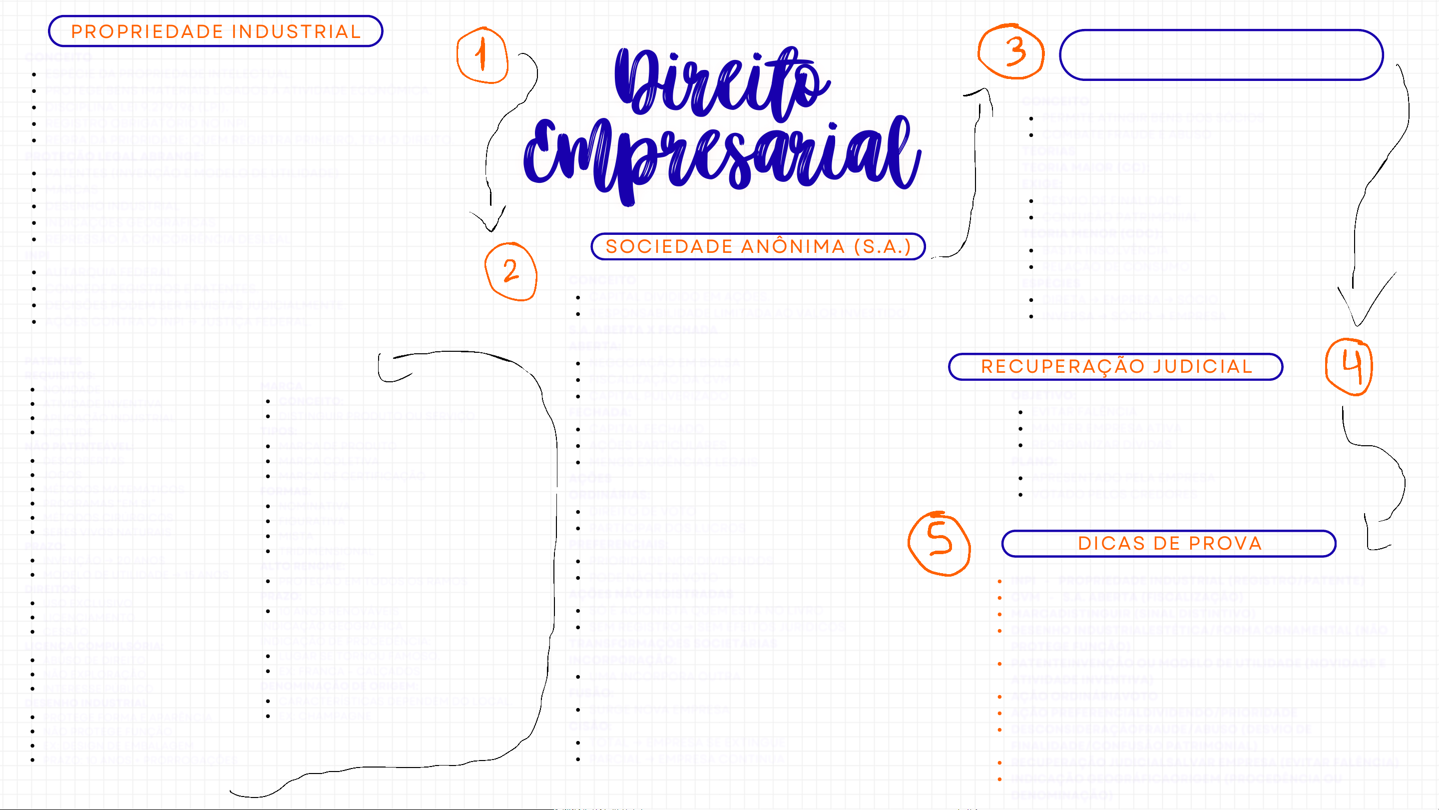 Direito Empresarial PROPRIEDADE INDUSTRIAL CONCEITO ESPÉCIE DA PROPRIEDADE INTELECTUAL. PROTEGE BENS IMATERIAIS LIGADOS À ATIVIDADE ECONÔMICA. DISCIPLINA: LEI 9.279/96 (LPI). REGISTRO OBRIGATÓRIO NO INPI. REGRA DA PRIORIDADE: QUEM REGISTRA PRIMEIRO, TEM O DIREITO. PROTEÇÃO LEGAL ABRANGE: PATENTES (INVENÇÃO E MODELO DE UTILIDADE) MARCAS DESENHO INDUSTRIAL INDICAÇÕES GEOGRÁFICAS REPRESSÃO À CONCORRÊNCIA DESLEAL INPI AUTARQUIA FEDERAL. CONCEDE REGISTROS E PATENTES. DECISÕES PODEM SER REVISTAS JUDICIALMENTE. AÇÕES CONTRA O INPI → JUSTIÇA FEDERAL. @stheerpala PATENTES REQUISITOS: NOVIDADE ATIVIDADE INVENTIVA APLICAÇÃO INDUSTRIAL LICITUDE NÃO PATENTEÁVEL: DESCOBERTAS JOGOS MÉTODOS MATEMÁTICOS PROGRAMAS “EM SI” MÉTODOS CIRÚRGICOS SERES VIVOS NATURAIS PRAZO: INVENÇÃO → 20 ANOS MODELO DE UTILIDADE → 15 ANOS DIREITOS: USO EXCLUSIVO LICENCIAMENTO CESSÃO LICENÇA COMPULSÓRIA: ABUSO DE DIREITO NÃO EXPLORAÇÃO INTERESSE PÚBLICO DESENHO INDUSTRIAL PROTEGE FORMA E APARÊNCIA NÃO PROTEGE FUNÇÃO EX: DESIGN DE EMBALAGEM PRAZO: 10 ANOS + PRORROGAÇÕES MARCA CONCEITO: DISTINGUIR PRODUTO OU SERVIÇO TIPOS: MARCA DE PRODUTO MARCA COLETIVA MARCA DE CERTIFICAÇÃO FORMAS: NOMINATIVA FIGURATIVA MISTA TRIDIMENSIONAL ALTO RENOME: PROTEÇÃO EM TODOS OS RAMOS PRAZO: 10 ANOS RENOVÁVEIS INDICAÇÃO GEOGRÁFICA INDICAÇÃO DE PROCEDÊNCIA: LUGAR SE TORNOU FAMOSO. EX: FRANCA – CALÇADOS DENOMINAÇÃO DE ORIGEM: CARACTERÍSTICAS DEPENDEM DO LOCAL. EX: CHAMPAGNE SOCIEDADE ANÔNIMA (S.A.) CONCEITO CAPITAL DIVIDIDO EM AÇÕES. RESPONSABILIDADE LIMITADA AO VALOR INVESTIDO. S.A. ABERTA X FECHADA ABERTA: NEGOCIAÇÃO EM BOLSA FISCALIZAÇÃO DA CVM CAPITAL PULVERIZADO FECHADA: CAPITAL FECHADO AÇÕES PARTICULARES MENOS EXIGÊNCIAS LEGAIS AÇÕES ORDINÁRIAS: DIREITO DE VOTO PARTICIPAR DOS LUCROS PREFERENCIAIS: PRIORIDADE NOS DIVIDENDOS PODE NÃO TER VOTO AÇÕES NÃO REGISTRADAS SÓ É ACIONISTA QUEM ESTÁ NO LIVRO SEM REGISTRO → SEM EFEITOS JURÍDICOS TRANSFORMAÇÕES SOCIETÁRIAS INCORPORAÇÃO: UMA INCORPORA OUTRA FUSÃO: SURGE NOVA EMPRESA CISÃO: TOTAL → EMPRESA SE EXTINGUE PARCIAL → EMPRESA CONTINUA DESCONSIDERAÇÃO DA PERSONALIDADE JURÍDICA CONCEITO PERMITE ATINGIR BENS DOS SÓCIOS COMBATE FRAUDE E ABUSO TEORIAS TEORIA MAIOR (CC): EXIGE: DESVIO DE FINALIDADE CONFUSÃO PATRIMONIAL TEORIA MENOR (CDC): BASTA INSOLVÊNCIA RELAÇÃO DE CONSUMO ESPÉCIES DIRETA → EMPRESA → SÓCIO INVERSA → SÓCIO → EMPRESA RECUPERAÇÃO JUDICIAL OBJETIVO: EVITAR FALÊNCIA MANTER EMPRESA ATIVA REORGANIZAR DÍVIDAS PLANO: APRESENTADO PELA EMPRESA VOTADO PELOS CREDORES DICAS DE PROVA INPI - PROPRIEDADE INDUSTRIAL (REGISTRO/PATENTE) CVM - S.A. ABERTA (FISCALIZAÇÃO) MARCADISTINGUIR (SINAL DISTINTIVO) DESENHO INDUSTRIALESTÉTICA/FORMA ORNAMENTAL (NÃO PROTEGE FUNÇÃO) PATENTEINVENÇÃO OU MODELO DE UTILIDADE (NOVIDADE E ATIVIDADE INVENTIVA) AÇÃO ORDINÁRIAVOTO AÇÃO PREFERENCIALDIVIDENDO/PRIORIDADE DESCONSIDERAÇÃOFRAUDE/ABUSO (DESVIO DE FINALIDADE/CONFUSÃO PATRIMONIAL) RECUPERAÇÃO JUDICIALSALVAR EMPRESA (EVITAR FALÊNCIA) INDICAÇÃO GEOGRÁFICAORIGEM (PROCEDÊNCIA OU DENOMINAÇÃO)