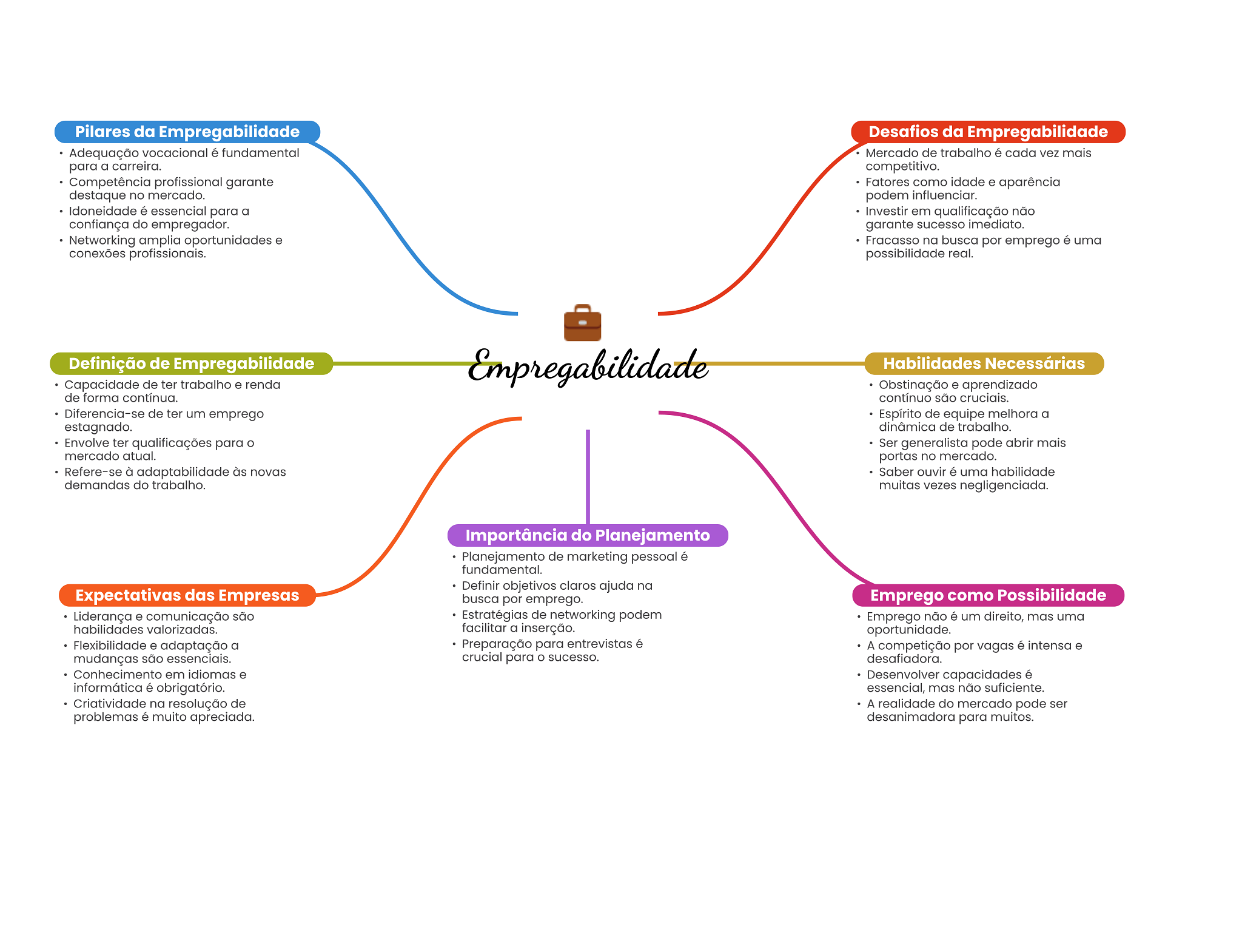 Pilares da Empregabilidade Desafios da Empregabilidade Adequação vocacional é fundamental Mercado de trabalho é cada vez mais para a carreira. competitivo. Competência profissional garante Fatores como idade e aparência destaque no mercado. podem influenciar. Idoneidade é essencial para a Investir em qualificação não confiança do empregador. garante sucesso imediato. Networking amplia oportunidades e Fracasso na busca por emprego é uma conexões profissionais. possibilidade real. Definição de Empregabilidade Empregabilidade Habilidades Necessárias Capacidade de ter trabalho e renda Obstinação e aprendizado de forma contínua. contínuo são cruciais. Diferencia-se de ter um emprego Espírito de equipe melhora a estagnado. dinâmica de trabalho. Envolve ter qualificações para O Ser generalista pode abrir mais mercado atual. portas no mercado. Refere-se à adaptabilidade às novas Saber ouvir é uma habilidade demandas do trabalho. muitas vezes negligenciada. Importância do Planejamento Planejamento de marketing pessoal é fundamental. Definir objetivos claros ajuda na Expectativas das Empresas busca por emprego. Emprego como Possibilidade Liderança e comunicação são Estratégias de networking podem Emprego não é um direito, mas uma habilidades valorizadas. facilitar a inserção. oportunidade. Flexibilidade e adaptação a Preparação para entrevistas é A competição por vagas é intensa e mudanças são essenciais. crucial para sucesso. desafiadora. Conhecimento em idiomas e Desenvolver capacidades é informática é obrigatório. essencial, mas não suficiente. Criatividade na resolução de A realidade do mercado pode ser problemas é muito apreciada. desanimadora para muitos.