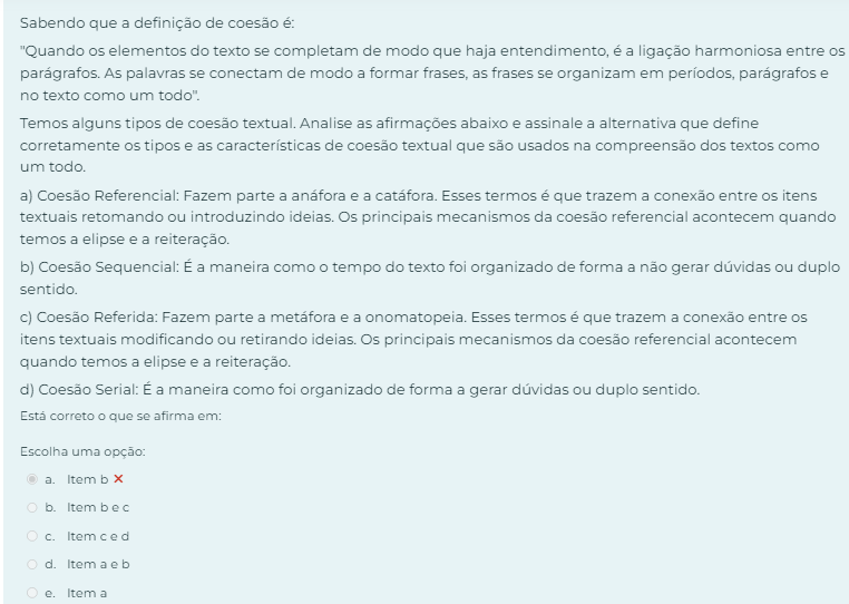 Sabendo que a definição de coesão é: "Quando elementos do texto se completam de modo que haja entendimento, é a ligação harmoniosa entre As palavras se conectam de modo a formar frases, as frases se organizam em períodos, parágrafos e no texto como um todo". Temos alguns tipos de coesão textual. Analise as afirmações abaixo e assinale a alternativa que define corretamente tipos e as características de coesão textual que são usados na compreensão dos textos como um todo. a) Coesão Referencial: Fazem parte a anáfora e a catáfora. Esses termos que trazem a conexão entre itens textuais retomando ou introduzindo ideias. Os principais mecanismos da coesão referencial acontecem quando temos a elipse e a reiteração. b) Coesão Sequencial: a maneira como O tempo do texto foi organizado de forma a não gerar dúvidas ou duplo sentido. c) Coesão Referida: Fazem parte a metáfora e a onomatopeia. Esses termos é que trazem a conexão entre itens textuais modificando ou retirando ideias. Os principais mecanismos da coesão referencial acontecem quando temos a elipse e a reiteração. d) Coesão Serial: É a maneira como foi organizado de forma a gerar dúvidas ou duplo sentido. correto que se afirma em: Escolha uma opção: C.