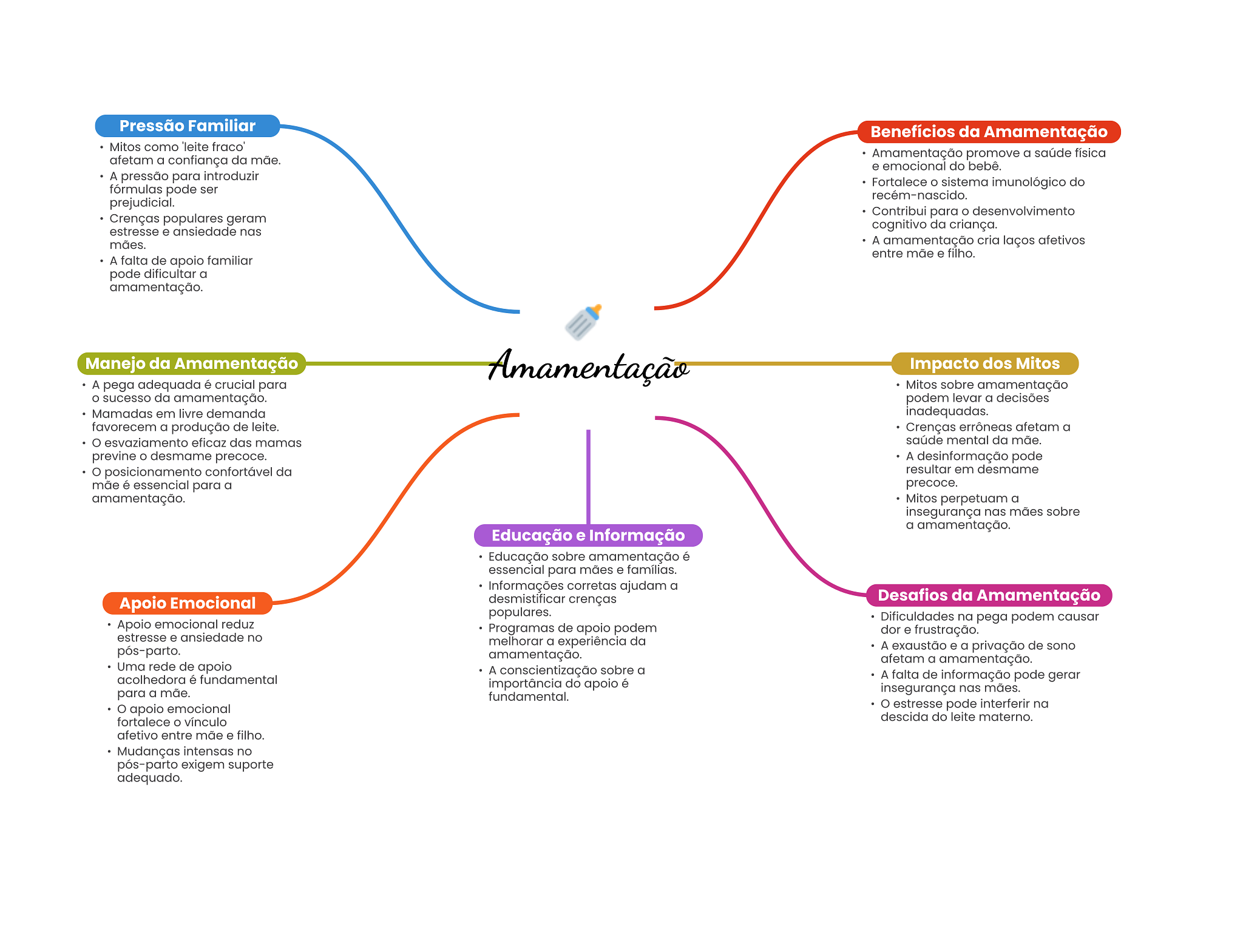Pressão Familiar Benefícios da Amamentação Mitos como 'leite fraco' Amamentação promove a saúde física afetam a confiança da mãe. e emocional do bebê. A pressão para introduzir fórmulas pode ser Fortalece sistema imunológico do recém-nascido. prejudicial. Contribui para desenvolvimento Crenças populares geram estresse e ansiedade nas cognitivo da criança. mães. A amamentação cria laços afetivos entre mãe e filho. A falta de apoio familiar pode dificultar a amamentação. Manejo da Amamentação Amamentação Impacto dos Mitos A pega adequada é crucial para Mitos sobre amamentação sucesso da amamentação. podem levar a decisões Mamadas em livre demanda inadequadas. favorecem a produção de leite. Crenças errôneas afetam a esvaziamento eficaz das mamas saúde mental da mãe. previne desmame precoce. A desinformação pode posicionamento confortável da resultar em desmame mãe é essencial para a precoce. amamentação. Mitos perpetuam a insegurança nas mães sobre a amamentação. Educação e Informação Educação sobre amamentação é essencial para mães e famílias. Informações corretas ajudam a Apoio Emocional desmistificar crenças Desafios da Amamentação populares. Dificuldades na pega podem causar Apoio emocional reduz Programas de apoio podem dor e frustração. estresse e ansiedade no melhorar a experiência da pós-parto. A exaustão e a privação de sono amamentação. afetam a amamentação. Uma rede de apoio A conscientização sobre a acolhedora é fundamental A falta de informação pode gerar importância do apoio é para a mãe. insegurança nas mães. fundamental. apoio emocional estresse pode interferir na fortalece vínculo descida do leite materno. afetivo entre mãe e filho. Mudanças intensas no pós-parto exigem suporte adequado.