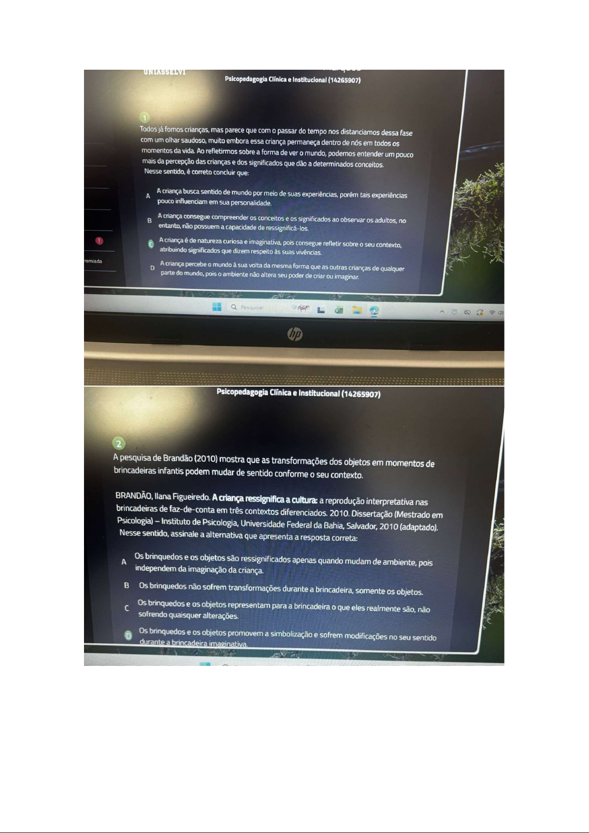 UNIASSELVI Psicopedagogia Clínica e Institucional (14265907) Todos já fomos crianças, mas parece que com passar do tempo nos distanciamos dessa fase com um olhar saudoso, muito embora essa criança permaneça dentro de nós em todos momentos da vida. Ao refletirmos sobre a forma de ver mundo, podemos entender um pouco mais da percepção das crianças e dos significados que dão a determinados conceitos. Nesse sentido, é correto concluir que: A criança busca sentido de mundo por meio de suas experiências, porém tais experiências A pouco influenciam em sua personalidade. A criança consegue compreender conceitos e significados ao observar os adultos, no entanto, não possuem a capacidade de ressignificá-los. A criança é de natureza curiosa e imaginativa, pois consegue refletir sobre seu contexto, atribuindo significados que dizem respeito às suas vivências. remiada D A criança percebe mundo à sua volta da mesma forma que as outras crianças de qualquer parte do mundo, pois ambiente não altera seu poder de criar ou imaginar. Pesquisar hp Psicopedagogia Clínica e Institucional (14265907) 2 A pesquisa de Brandão (2010) mostra que as transformações dos objetos em momentos de brincadeiras infantis podem mudar de sentido conforme seu contexto. BRANDÃO, llana Figueiredo. A criança ressignifica a cultura: a reprodução interpretativa nas brincadeiras de faz-de-conta em três contextos diferenciados. 2010. Dissertação (Mestrado em Psicologia) Instituto de Psicologia, Universidade Federal da Bahia, Salvador, 2010 (adaptado). Nesse sentido, assinale a alternativa que apresenta a resposta correta: Os brinquedos e objetos são ressignificados apenas quando mudam de ambiente, pois A independem da imaginação da criança. Os brinquedos não sofrem transformações durante a brincadeira, somente objetos. Os brinquedos e objetos representam para a brincadeira que eles realmente são, não sofrendo quaisquer alterações. Os brinquedos e os objetos promovem a simbolização e sofrem modificações no seu sentido durante a brincadeira imaginativa.Psicopedagogia Clinica e Institucional (14265907) A imaginação de uma criança expressada no desenho auxilia a compreensão do desenvolvimento infantil. Sobre desenho e a criança, assinale a alternativa correta: A As emoções da criança são refletidas nas cores utilizadas, pois os traços requerem somente coordenação motora. Uma superfície branca é desinteressante para a criança, motivo pelo qual é preciso que adulto inicie a atividade. A criança, quando desenha, reflete em seus traços uma extensão do seu "eu" interior. D desenho demostra sempre as emoções positivas da criança, pois as frustrações não são reveladas em traços e cores. Pesquisar Psicopedagogia Clínica e Institucional (14265907) 4 Na proposta das escolas de Reggio Emilia, atitudes com fantasiar e criar não são apenas coerentes com a proposta da escuta, mas também são encorajadas nos projetos escolares. Com relação às práticas que envolvem criar e fantasiar nessas escolas, analise as sentenças que seguem: I - Os projetos envolvem 0 experimentar, imaginar e "dar voz" às suas criações, tudo por meio das diferentes linguagens. II As produções das crianças são observadas e analisadas pelos professores, alunos e comunidade, objetivando retroalimentar a aprendizagem e indicar próximos passos para progredir. III Os projetos e as atividades que promovem criar e brincar são meios para registrar portfólios, pois esse é principal objetivo. Assinale a alternativa que apresenta a resposta correta: As sentenças e II estão corretas. Pesquisar