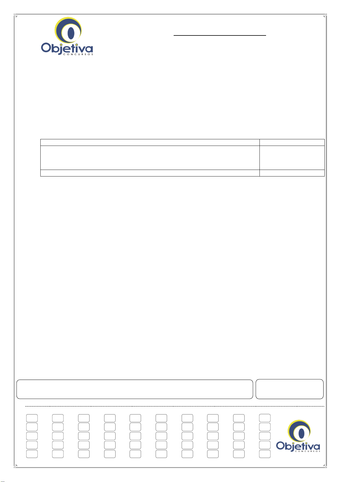 “embaixador” possui dois femininos: “embaixadora” e “embaixatriz”. II. O substantivo “oficial” não se altera para feminino. Sendo assim, o feminino é “a oficial”. a) Os itens I e II estão corretos. b) Somente o item I está correto. c) Somente o item II está correto. d) Os itens I e II estão incorretos. MATEMÁTICA 11) Uma turma de certa universidade possui 60 alunos. Sabe-se que a razão entre a quantidade de homens e mulheres é igual a 1/2 e que há mais mulheres do que homens nessa turma. Sendo assim, ao todo, quantas mulheres há nessa turma? a) 40 b) 30 c) 20 d) 10 12) Sabe-se que o segundo termo de certo progressão geométrica é igual a 6 e que o sexto termo é igual a 486. Sendo assim, qual a razão dessa progressão? a) 5 b) 4 c) 3 d) 2 13) Bruno recebe um salário mensal de R$ 2.600,00. Sabe-se que ele gasta 45% do seu salário com o valor do aluguel. Sendo assim, pode-se afirmar que o valor que ele gasta com aluguel é igual a: a) R$ 1.210,00 b) R$ 1.170,00 c) R$ 1.120,00 d) R$ 1.090,00 14) Sabe-se que, em certo jogo de basquete, uma das equipes conseguiu fazer um total de 50 cestas. Sabendo- se que todas as cestas valeram ou 3 pontos ou 2 pontos e que essa equipe fez um total de 114 pontos, ao todo, quantas cestas de 3 pontos essa equipe fez? a) 36 b) 28 c) 14 d) 10 15) Pedro possui 10 canetas em sua coleção. Ele deve escolher duas delas para levar para a escola. Sendo assim, de quantas maneiras distintas ele pode escolher as canetas que irá levar? a) 45 b) 60 c) 75 d) 90 3 www.objetivas.com.br 16) Em certa confeitaria, para se fazer 14 bolos, é utilizado um total de 56 ovos. Considerando-se a mesma proporção, ao todo, quantos ovos devem ser utilizados para se fazer 24 bolos? a) 48 b) 72 c) 84 d) 96 17) Certo boleto que possui valor nominal de R$ 650,00 foi pago com atraso de 8 meses. Sabendo-se que a taxa de juros simples mensal desse boleto é de 1,5%, qual o valor total pago por esse boleto? a) R$ 728,00 b) R$ 730,00 c) R$ 732,00 d) R$ 734,00 18) Considerando-se um quadrado que possui 81cm² de área, pode-se afirmar que o perímetro desse quadrado é igual a: a) 28cm b) 32cm c) 36cm d) 40cm 19) Uma urna contém 3 bolas de cor azul, 2 bolas de cor verde e 1 bola de cor vermelha. Ao retirar aleatoriamente 2 bolas dessa urna, sem reposição entre as retiradas, qual a probabilidade de que as bolas retiradas sejam as duas verdes? a) 1/10 b) 1/15 c) 1/20 d) 1/30 20) Ângela, Bárbara e Carolina vão viajar nas férias para Paris, Madri e Roma, não necessariamente nessa ordem, e cada uma vai para um local diferente. Das afirmações abaixo, sabe-se que uma é verdadeira e as outras duas são falsas. Sendo assim, analisar as afirmações abaixo e assinalar a alternativa CORRETA: • Ângela não vai viajar para Madri. • Bárbara vai viajar para Madri. • Carolina não vai viajar para Roma. a) Ângela vai viajar para Roma. b) Bárbara vai viajar para Madri. c) Bárbara vai viajar para Paris. d) Carolina vai viajar para Paris. CONHECIMENTOS GERAIS 21) Tarsila do Amaral foi uma importante pintora que fez parte do movimento modernista e seu quadro Abaporu inaugura o movimento antropofágico dentro das artes plásticas. A artista citada no trecho nasceu no(a): a) Chile. b) Bolívia. c) Brasil. d) Uruguai. 22) “Brasil enfrenta uma nova epidemia de dengue. A doença, que estava em baixa há dois anos, apresentou crescimento de 600%, em comparação ao mesmo período de 2018, e tem como principal causador o vírus de tipo dois”. https://jornal.usp.br/atualidades... - adaptado. Em relação ao disposto na notícia acima, assinalar a alternativa CORRETA: a) A transmissão da dengue acontece através da picada do mosquito Aedes Aegypti. b) A dengue é uma doença contagiosa que passa de pessoa para pessoa. c) Em contato com a água parada, o mosquito Aedes Aegypti não pode se reproduzir. d) É necessário o acúmulo de água parada para conseguir prevenir a doença. 23) Conforme a Lei Orgânica do Município, na execução orçamentária é vedado, entre outros: I. O início de programas ou projetos incluídos nas respectivas leis anuais. II. A realização de emendas ou a assunção de obrigações diretas que excedam os créditos orçamentários ou adicionais. III. A realização de operações de crédito que excedam ao montante das despesas de capital, ressalvadas as autorizadas mediante créditos suplementares ou especiais com finalidade precisa, aprovados pela Câmara por maioria absoluta. Está(ão) CORRETO(S): a) Somente o item I. b) Somente os itens I e II. c) Somente os itens II e III. d) Todos os itens. www.objetivas.com.br 4 24) Em conformidade com a Lei Orgânica do Município, analisar a sentença abaixo: A Lei Orgânica poderá ser emendada por proposta do Prefeito apenas (1ª parte). São de iniciativa privativa do Prefeito as leis que disponham sobre, entre outros, servidores públicos, seu regime jurídico, provimento de cargos, estabilidade e aposentadoria (2ª parte). A sentença está: a) Correta somente em sua 1ª parte. b) Correta somente em sua 2ª parte. c) Totalmente correta. d) Totalmente incorreta. 25) Sobre as orientações previstas na Lei Complementar nº 007/1990 - Regime Jurídico dos Servidores Públicos do Município, marcar C para as afirmativas Certas, E para as Erradas e, após, assinalar a alternativa que apresenta a sequência CORRETA: (---) A investidura em cargo público não depende de aprovação prévia em concurso público de provas ou de provas e títulos, ressalvadas as nomeações e exonerações para cargos em comissão. (---) Os cargos em comissão e as funções de confiança serão exercidos, preferencialmente, por servidores ocupantes em cargos de carreira técnica ou profissional, nos casos e condições previstos em lei. a) C - C. b) C - E. c) E - C. d) E - E. 26) Segundo a Lei Complementar nº 007/1990 - Regime Jurídico dos Servidores Públicos do Município, sobre a posse e o exercício, ma