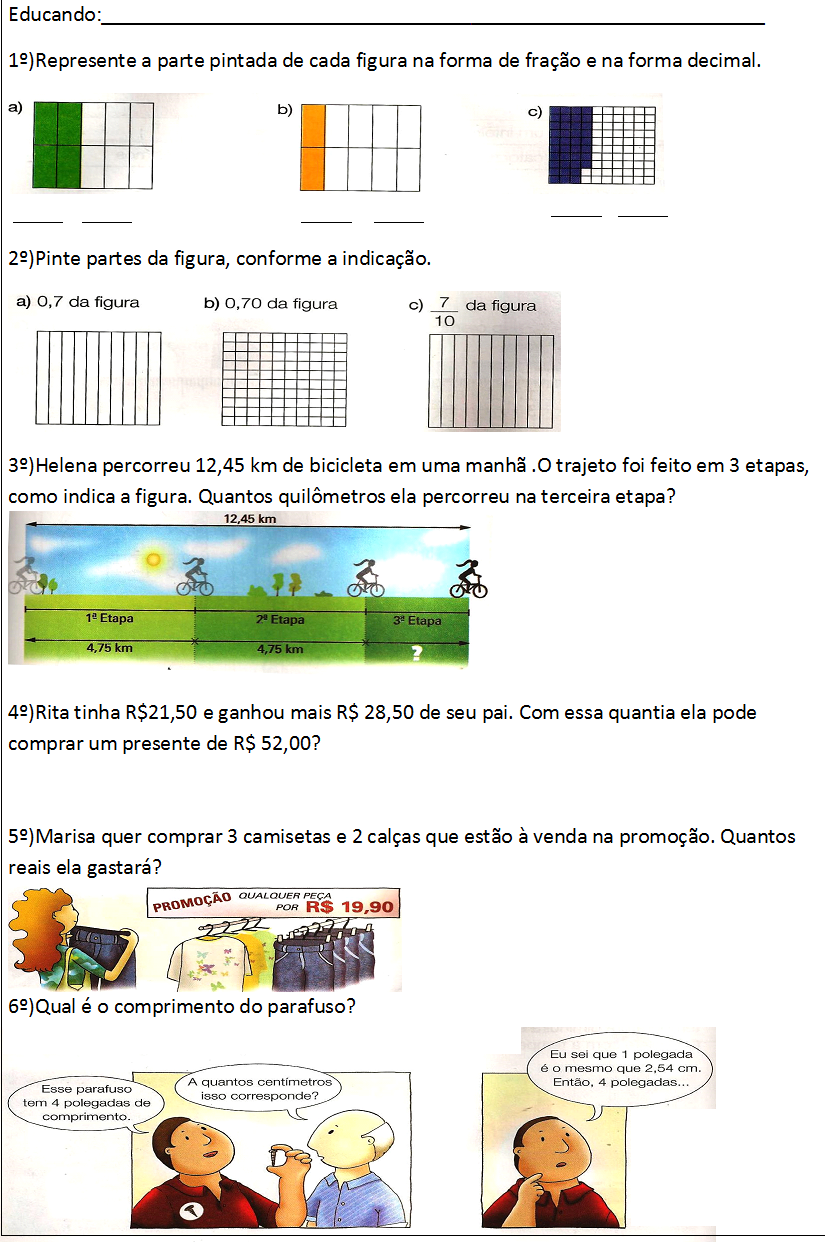 Educando: Represente a parte pintada de cada figura na forma de fração e na forma decimal. a) b) c) Pinte partes da figura, conforme a indicação. a) 0,7 da figura b) 0,70 da figura c) 7 da figura 10 Helena percorreu 12,45 km de bicicleta em uma manhã trajeto foi feito em 3 etapas, como indica a figura. Quantos quilômetros ela percorreu na terceira etapa? 12,45 km Etapa Etapa Etapa 4,75 km 4,75 km ? Rita tinha R$21,50 e ganhou mais R$ 28,50 de seu pai. Com essa quantia ela pode comprar um presente de R$ 52,00? Marisa quer comprar 3 camisetas e 2 calças que estão à venda na promoção. Quantos reais ela gastará? PROMOÇÃO QUALQUER PEÇA POR R$ 19,90 Qual é O comprimento do parafuso? Eu sei que 1 polegada é O mesmo que 2,54 cm. A quantos centimetros Então, 4 polegadas... Esse parafuso isso corresponde? tem 4 polegadas de comprimento.
