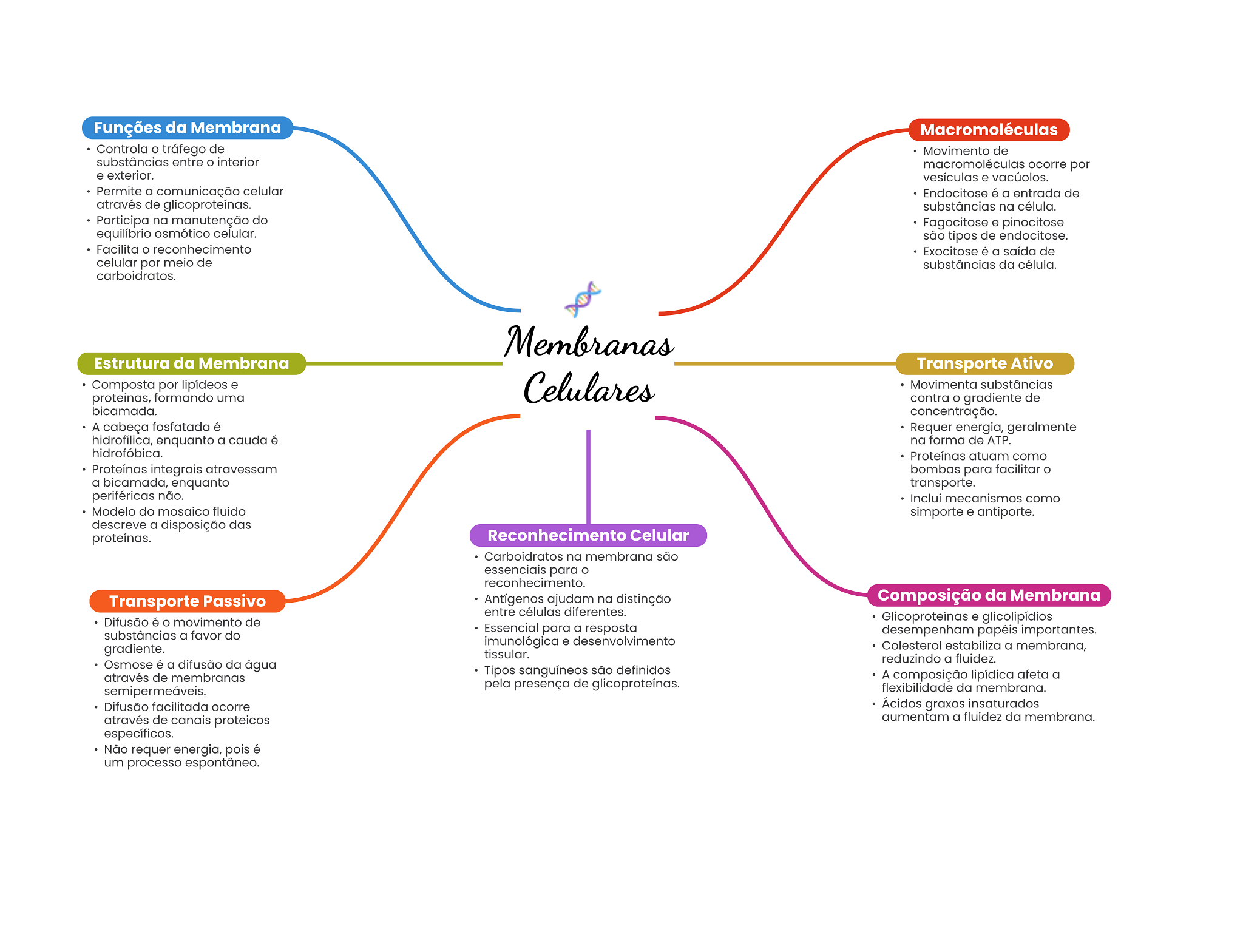 Funções da Membrana Macromoléculas Controla tráfego de Movimento de substâncias entre interior macromoléculas ocorre por e exterior. vesículas e vacúolos. Permite a comunicação celular Endocitose é a entrada de através de glicoproteínas. substâncias na célula. Participa na manutenção do Fagocitose e pinocitose equilíbrio osmótico celular. são tipos de endocitose. Facilita reconhecimento Exocitose é a saída de celular por meio de substâncias da célula. carboidratos. Membranas Estrutura da Membrana Transporte Ativo Composta por lipídeos e Celulares Movimenta substâncias proteínas, formando uma contra gradiente de bicamada. concentração. A cabeça fosfatada é Requer energia, geralmente hidrofílica, enquanto a cauda é na forma de ATP. hidrofóbica. Proteínas atuam como Proteínas integrais atravessam bombas para facilitar O a bicamada, enquanto transporte. periféricas não. Inclui mecanismos como Modelo do mosaico fluido simporte e antiporte. descreve a disposição das proteínas. Reconhecimento Celular Carboidratos na membrana são essenciais para reconhecimento. Transporte Passivo Antígenos ajudam na distinção Composição da Membrana entre células diferentes. Difusão é movimento de Glicoproteínas e glicolipídios substâncias a favor do Essencial para a resposta desempenham papéis importantes. imunológica e desenvolvimento gradiente. Colesterol estabiliza a membrana, tissular. reduzindo a fluidez. Osmose é a difusão da água Tipos sanguíneos são definidos através de membranas A composição lipídica afeta a pela presença de glicoproteínas. semipermeáveis. flexibilidade da membrana. Difusão facilitada ocorre Ácidos graxos insaturados através de canais proteicos aumentam a fluidez da membrana. específicos. Não requer energia, pois é um processo espontâneo.